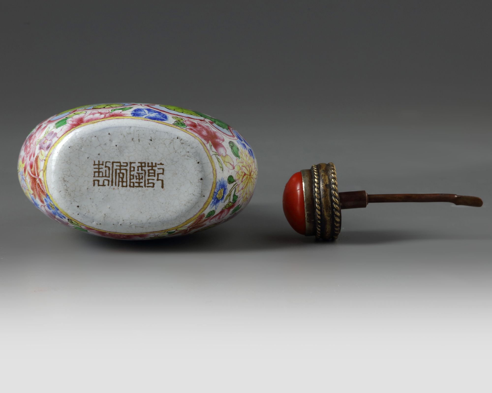 A PAINTED CHINESE ENAMEL SNUFF BOTTLE, QIANLONG MARK AND PROBABLY FROM THE PERIOD (1736-1795)