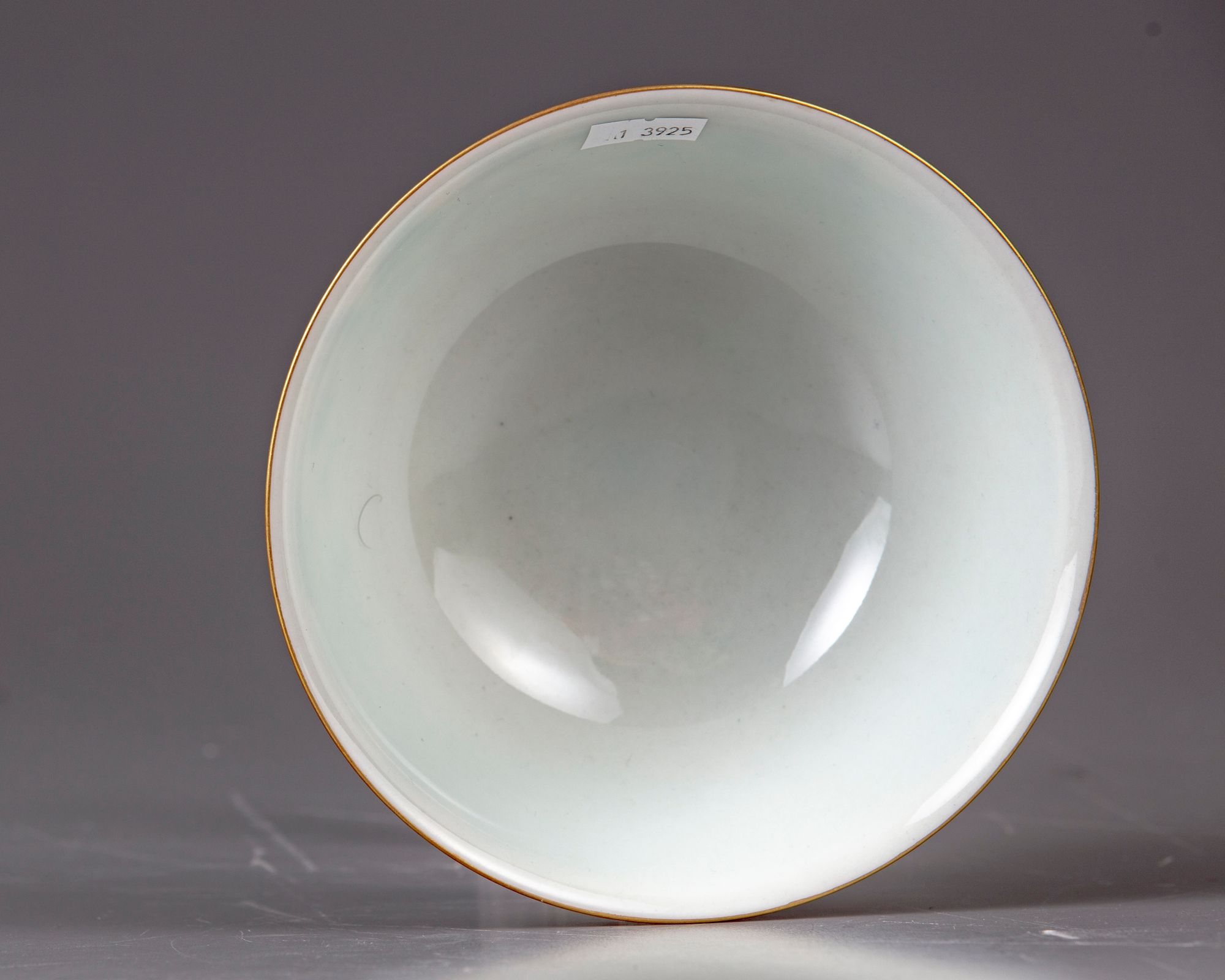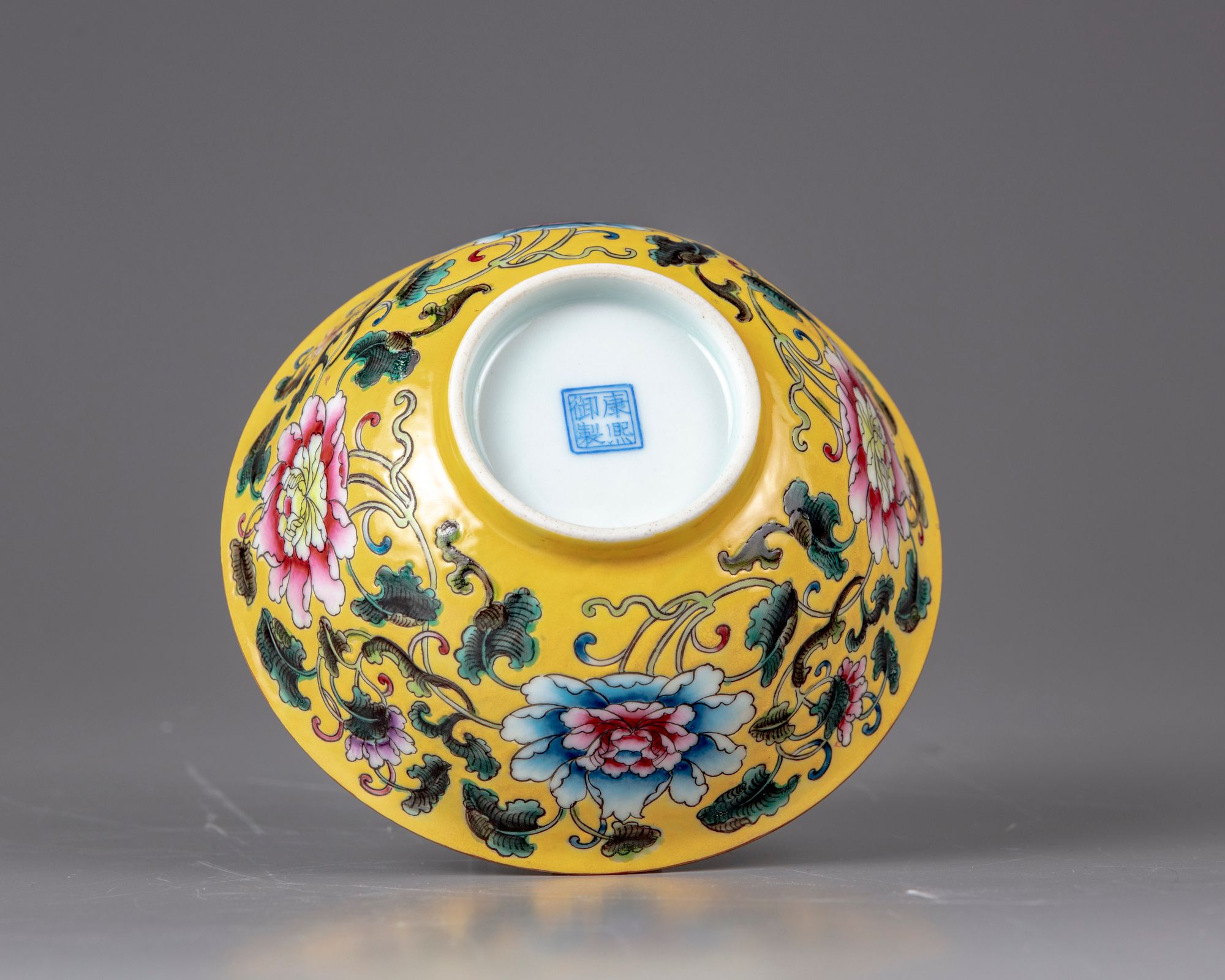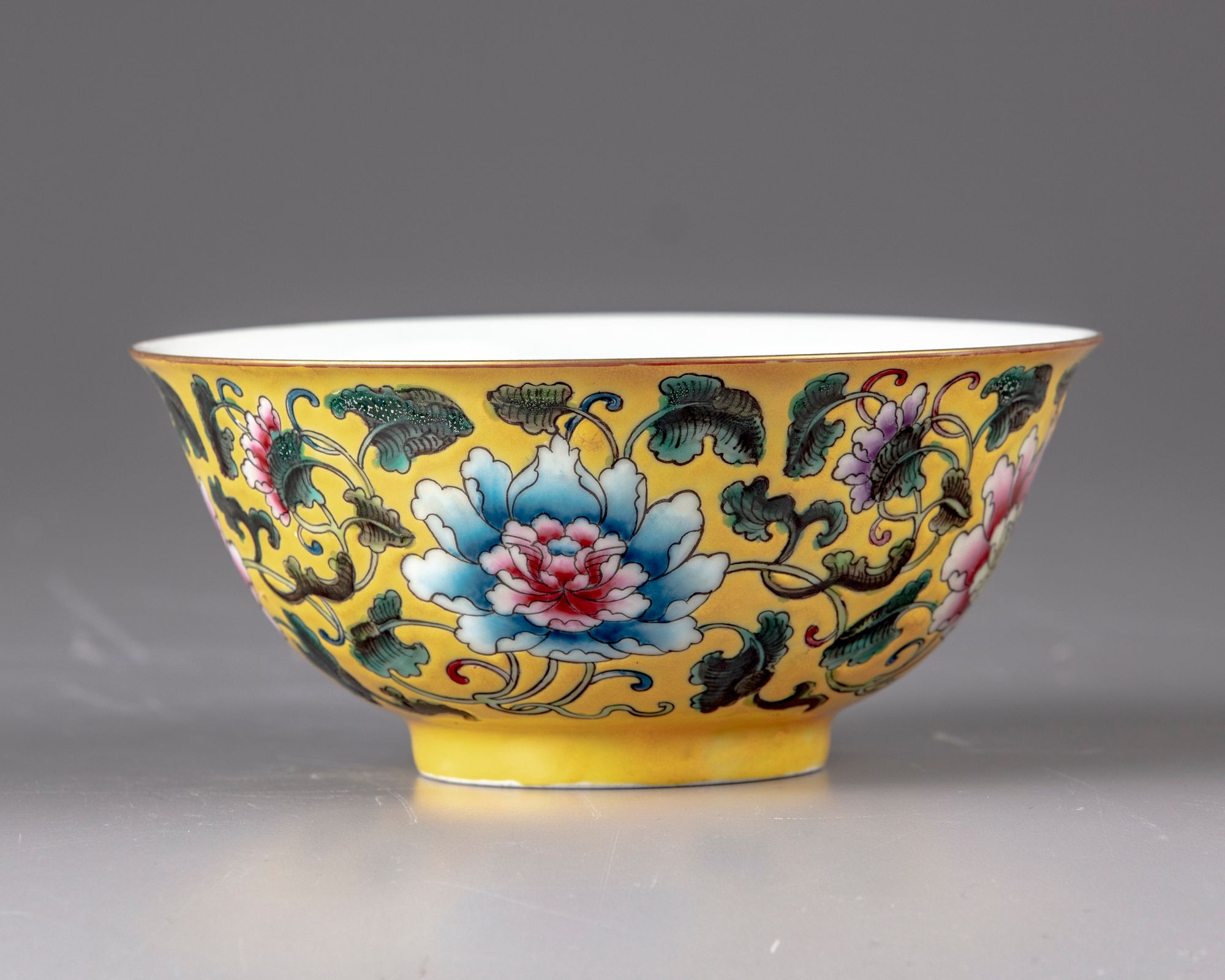 The bowl with deep sides and a small foot ,decorated to the exterior with four interlocked peony sprays with foliage scrolls on a yellow ground.
