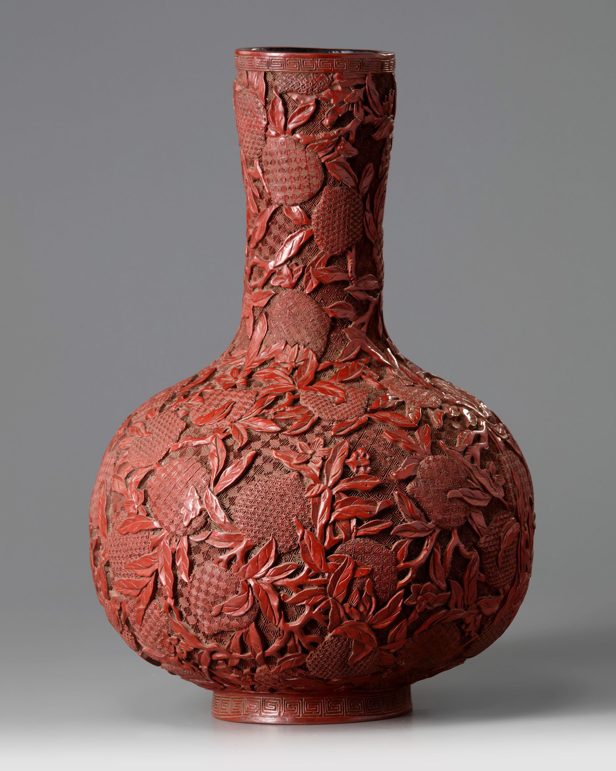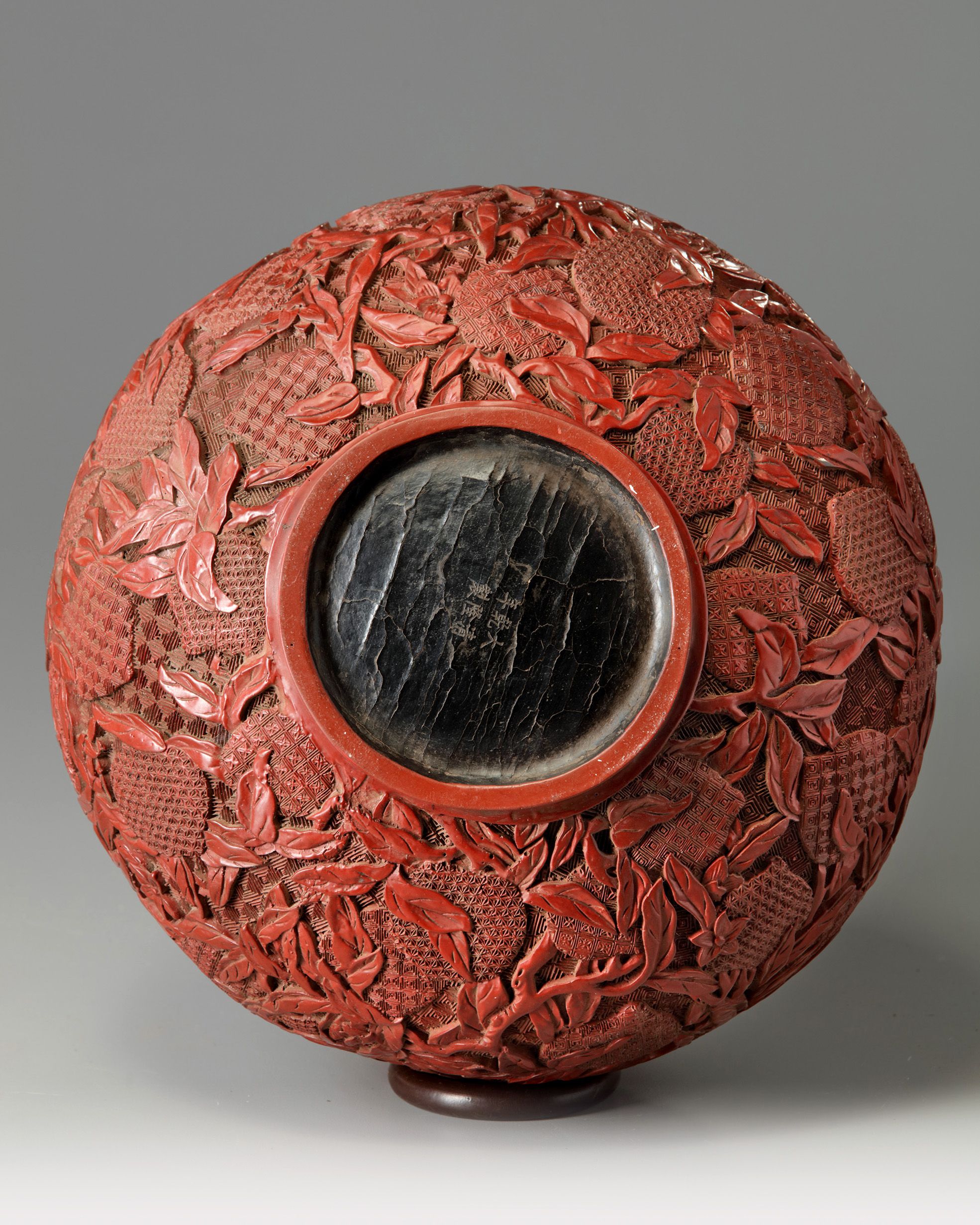 The vase is decorated overall with a multitude of peaches rowing from leafy branches. The peaches are carved with a variety of different geometric patterns, all reserved on a leiwen ground. The interior and base are lacquered black. The base with an apocryphal Qianlong mark.