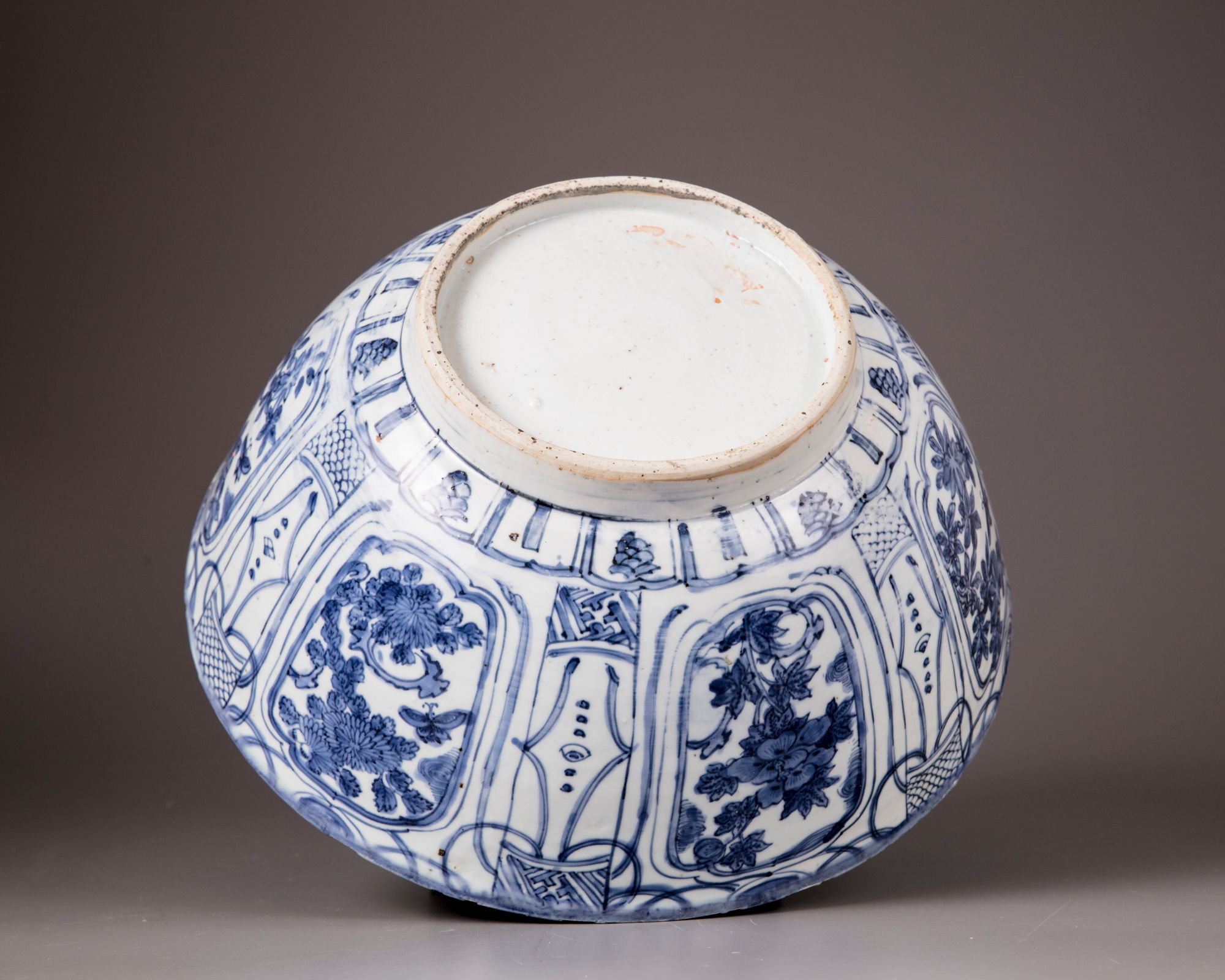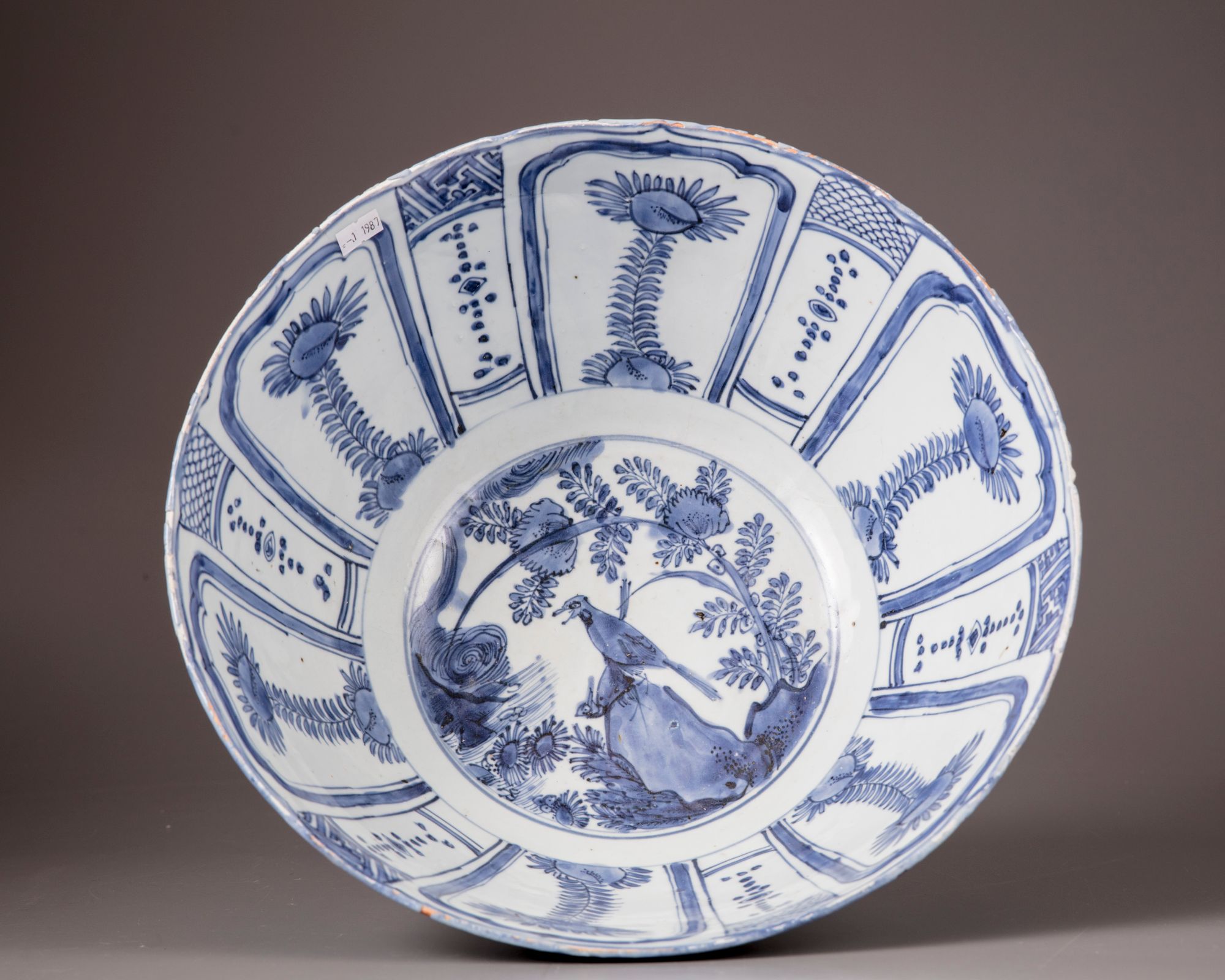 The bowl is decorated to the interior with a roundel enclosing two birds standing on a rock below leafy flowers, surrounded by vertical panels enclosing upright flowers alternating with a beaded design. The exterior is decorated with shaped panels enclosing flowers separated by beribonned tassels.