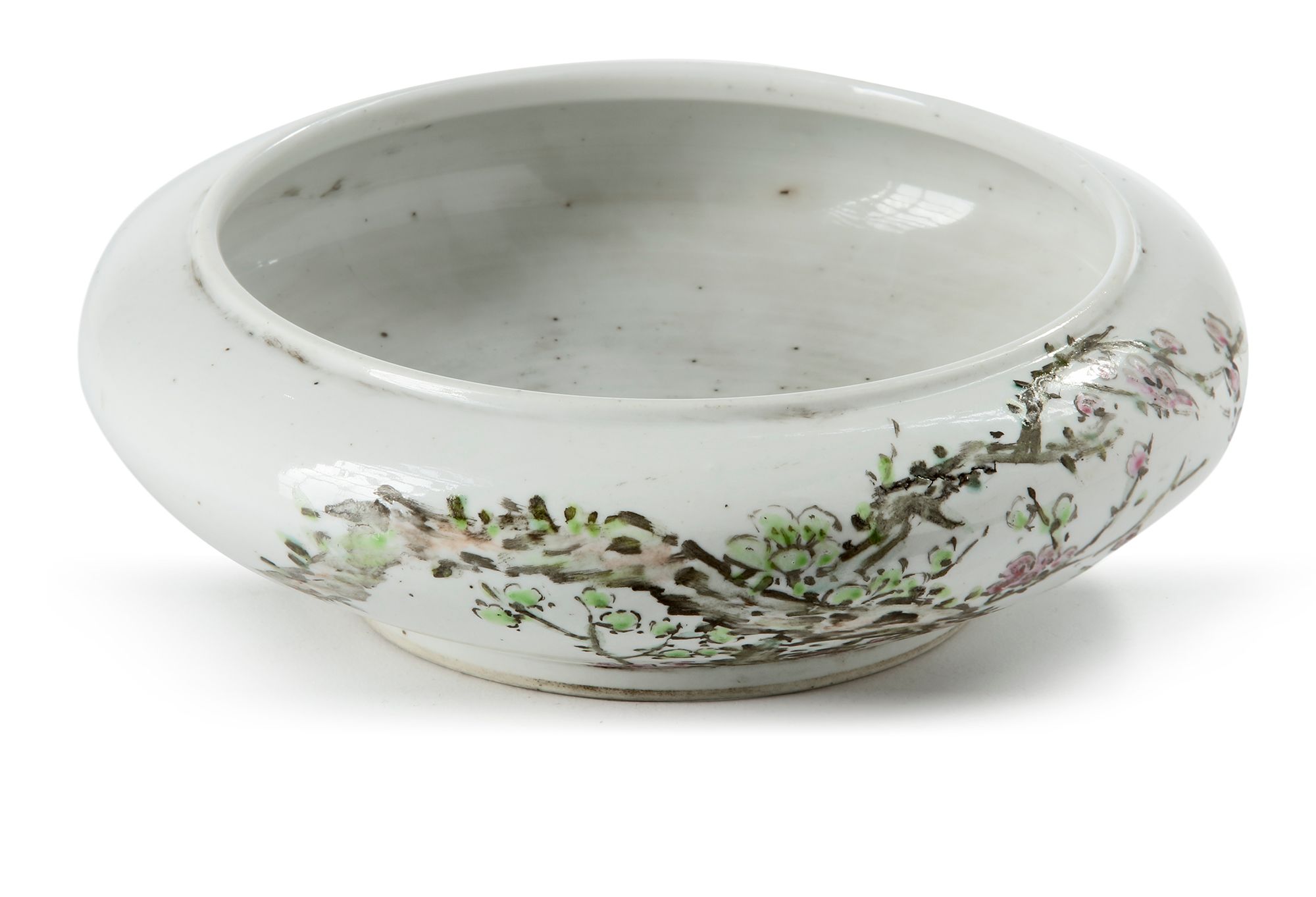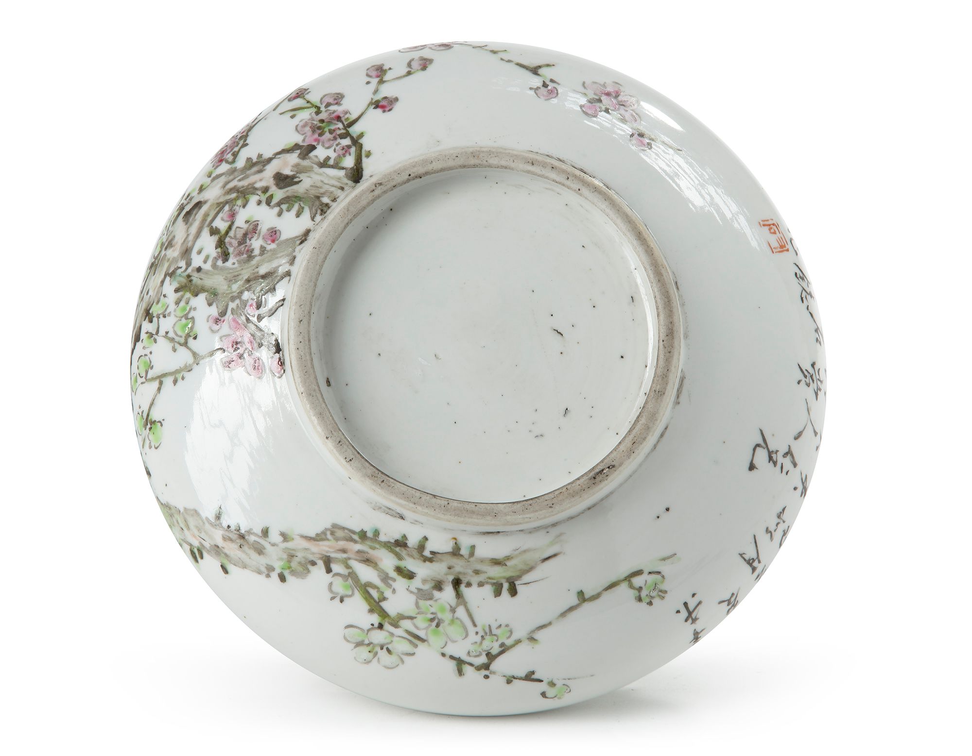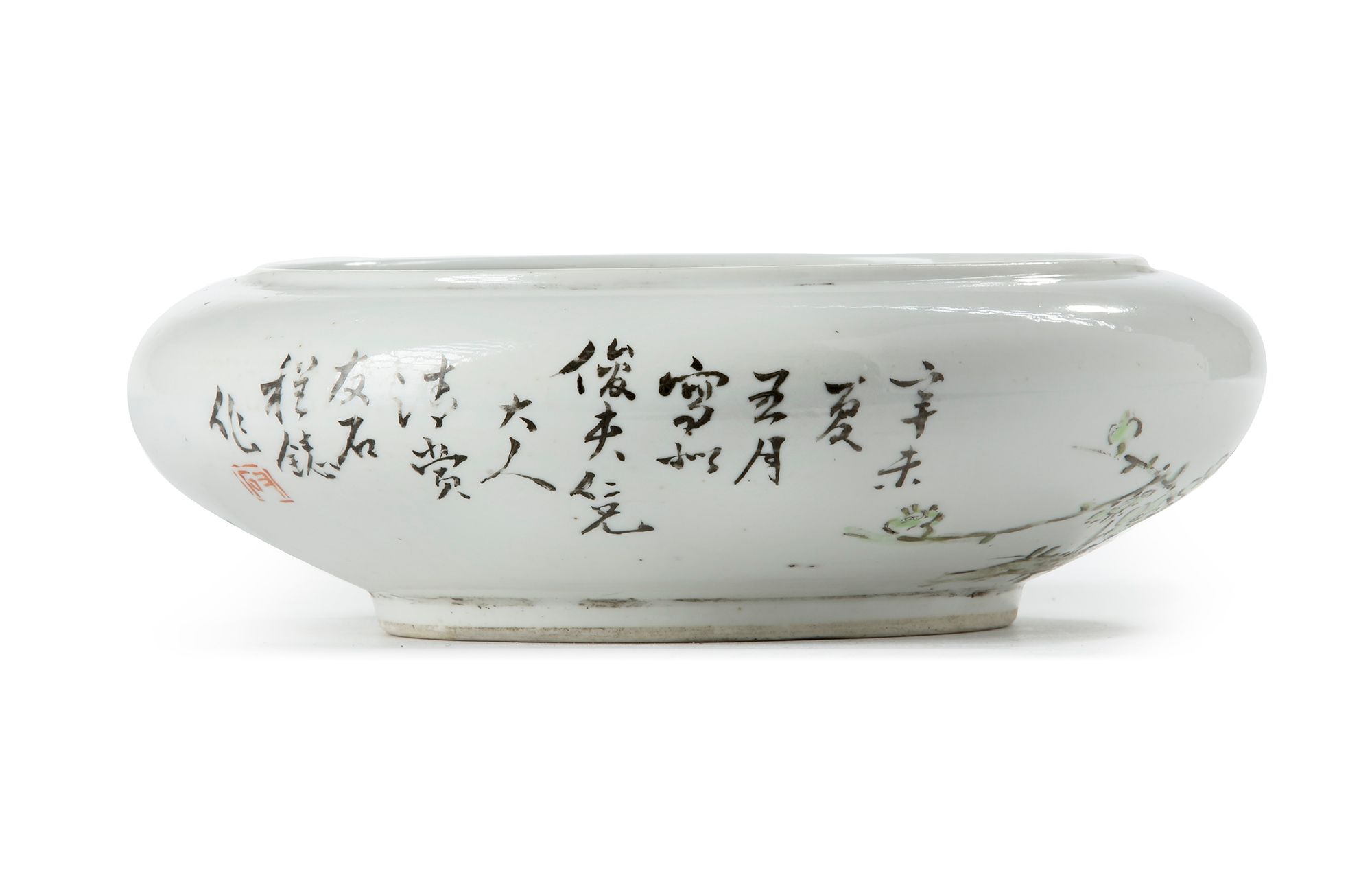 Decorated to the exterior with peonies, chinese poem and seal marks. The base unmarked. 17.5 cm diameter.