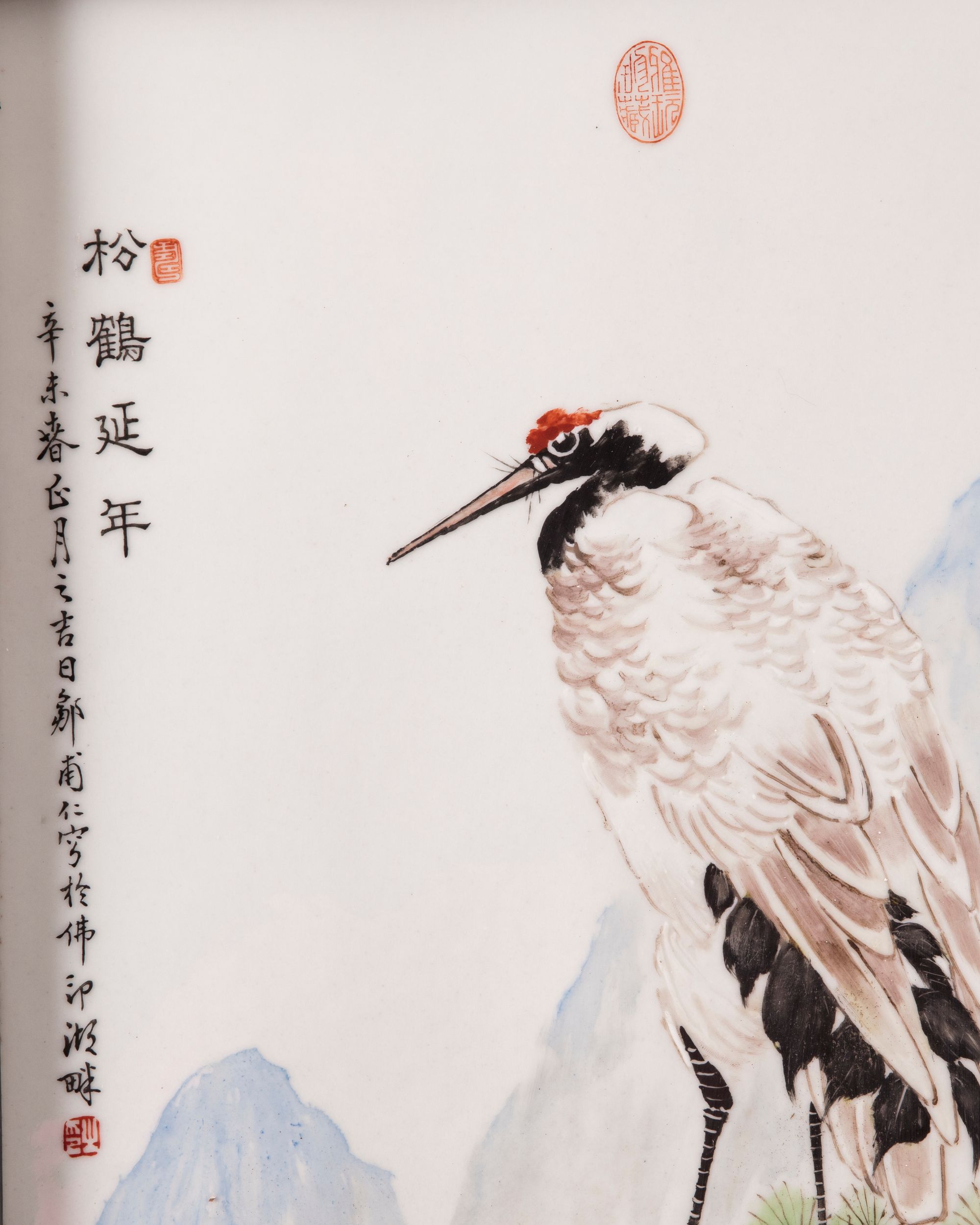 A Chinese plaque decorated with an egret standing on a tree branch with tops of mountains in the background.