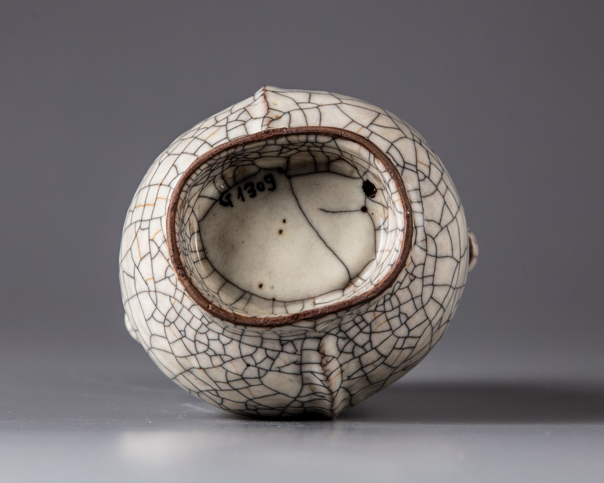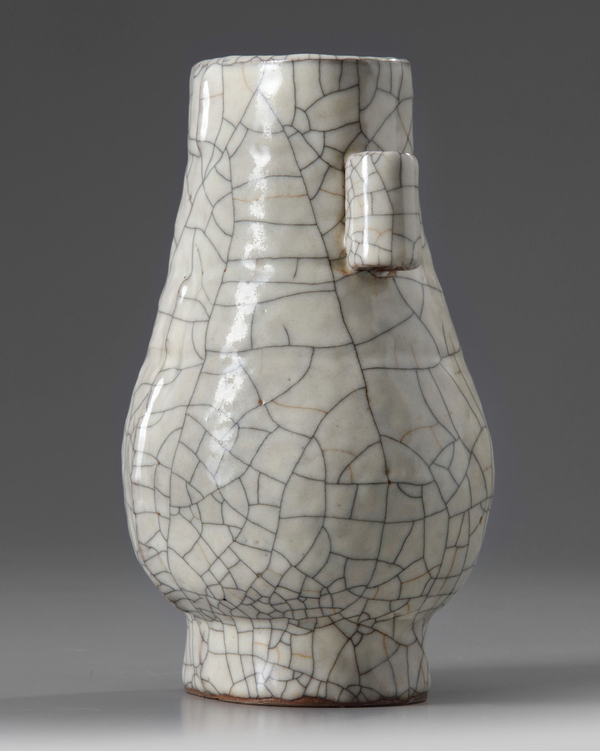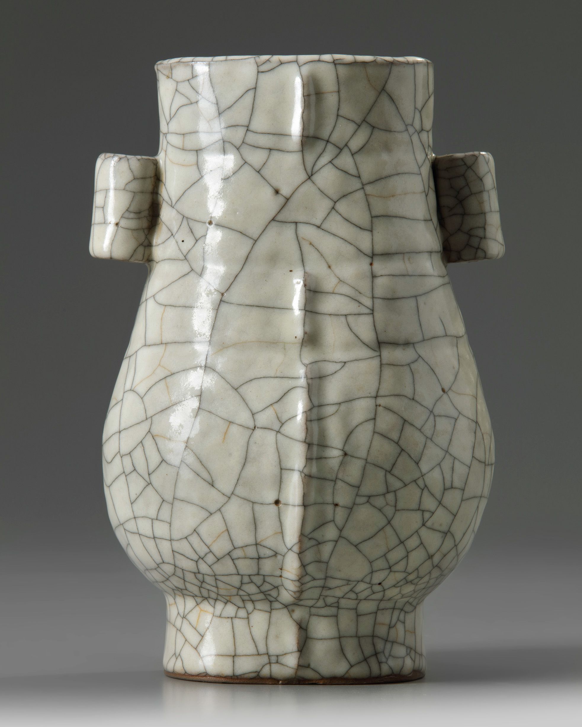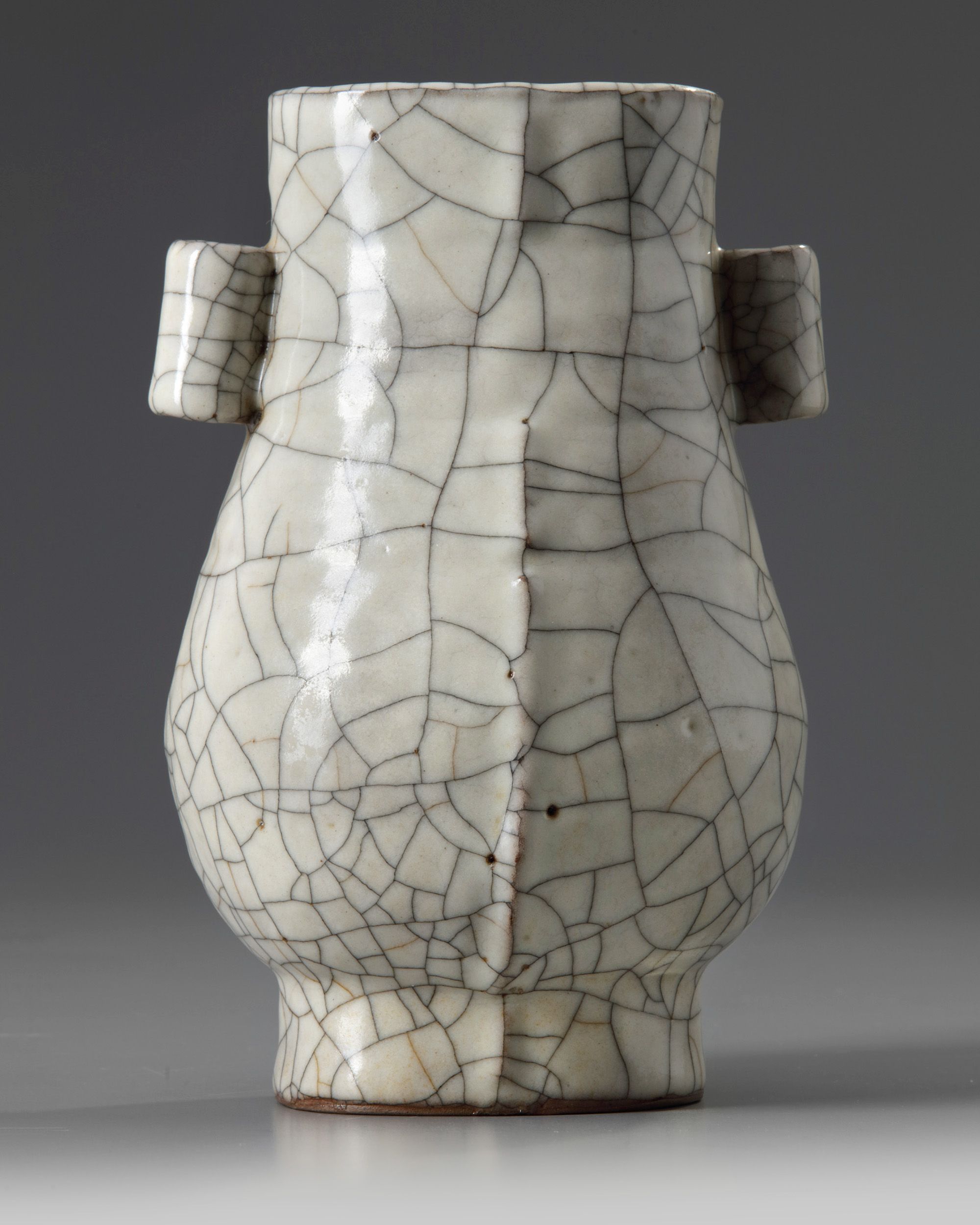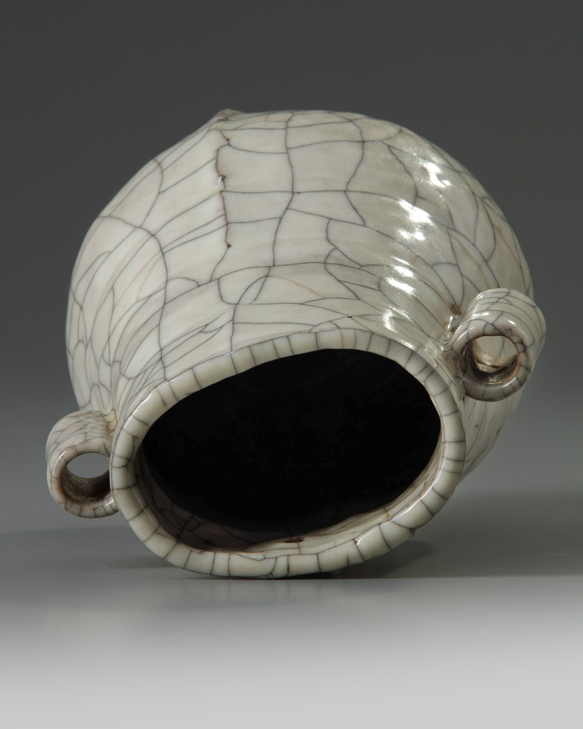 The vase is modelled with shallow raised flanges to the centre line and two tubular handles to the neck. It is covered overall with a pale cream glaze suffused with black and golden crackles.