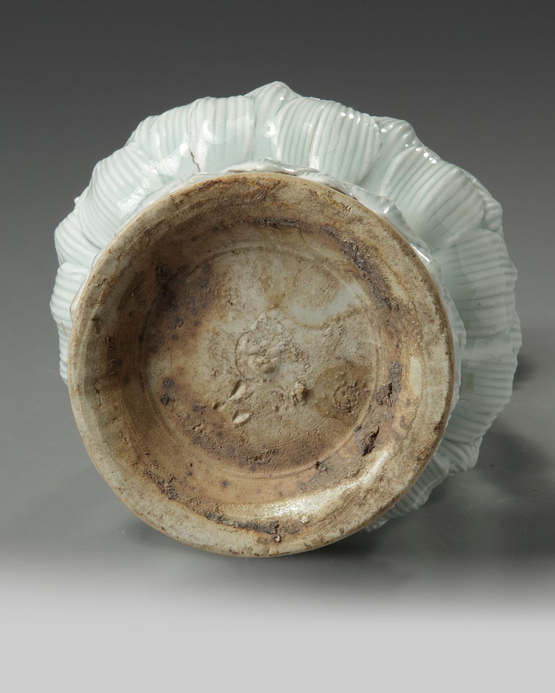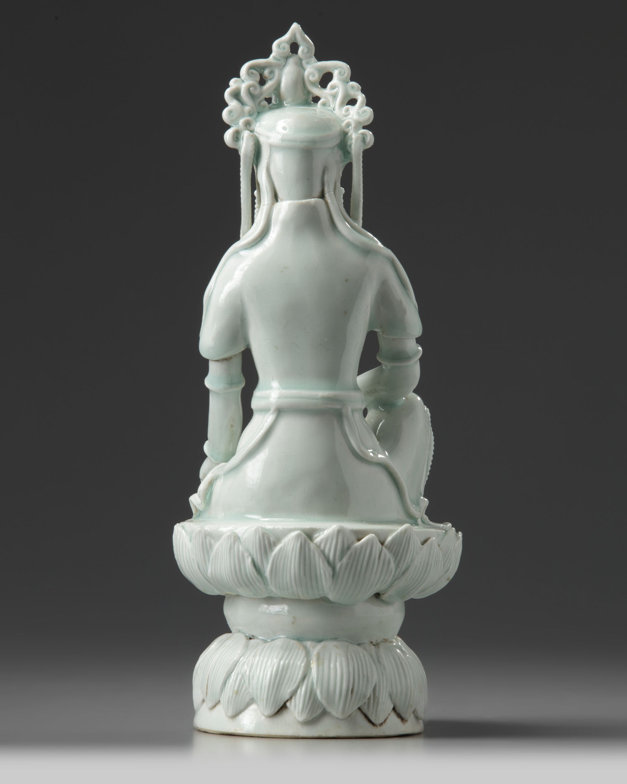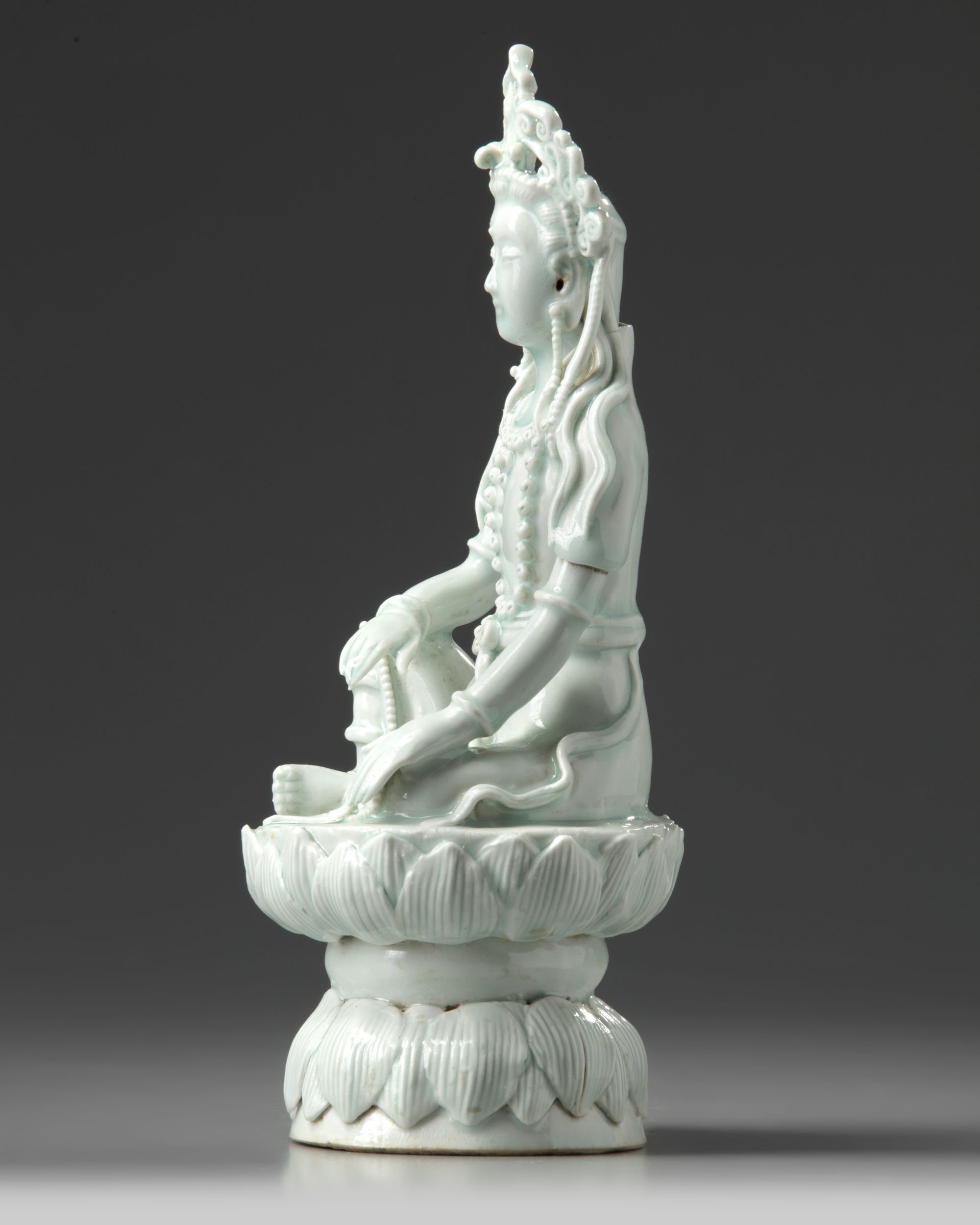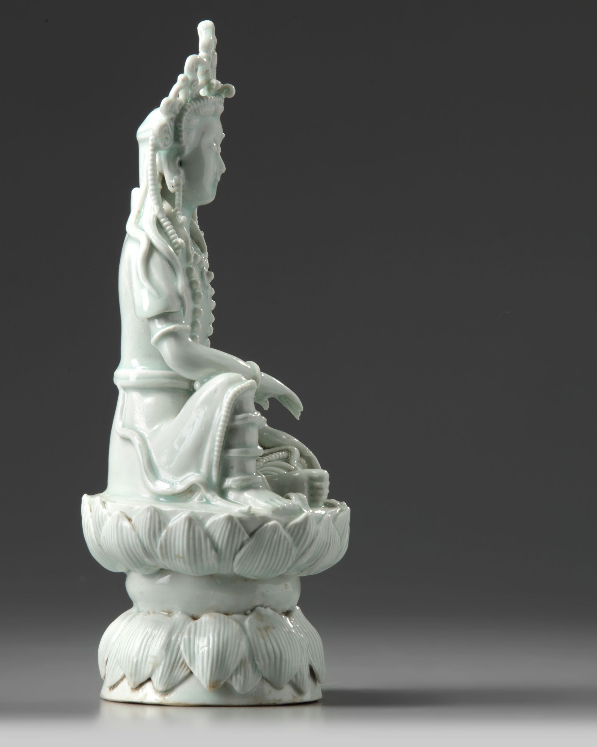 The Goddess of Mercy is modelled seated in royal ease on a double lotus base. She has a serene face under a tiara centred by the Buddha Amitaba. She wears elaborate jewellery and a dhoti tied around her waist.