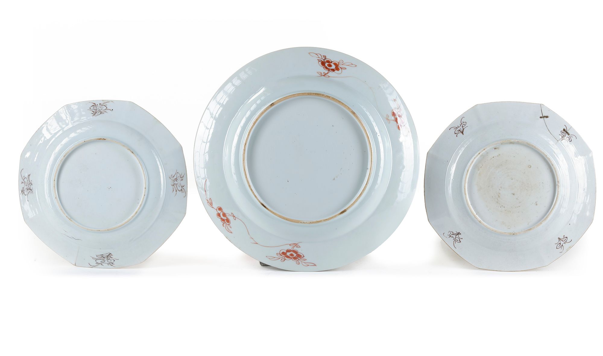A large Chinese porcelain dish decorated to the central roundel with branches of flowering prunus, all enclosed within two bands of decorative border. Two Chinese octagonal dishes decorated with large lotus flowering branch with flower heads to the border. Large dish: 28.5 cm. diam. Two dishes: 22 cm. diam.
