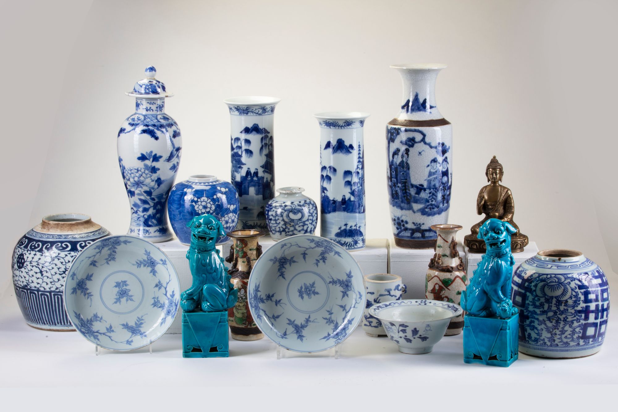 Consisting of nine blue and white vessels, two blue and white dishes and a bowl. Furthermore two small famille rose vases decorated with figures. Two blue glazed fu-lions and a bronze figure. The largest vessel with a height of 34.5 cm. The two beaker vases: 26 cm. The blue and white vase with cover: 33 cm. Two small cantonese famille rose vases: 20 cm. The bronze buddha: 18 cm. The two fu-lions: 25 cm. The two dishes: 20 cm.