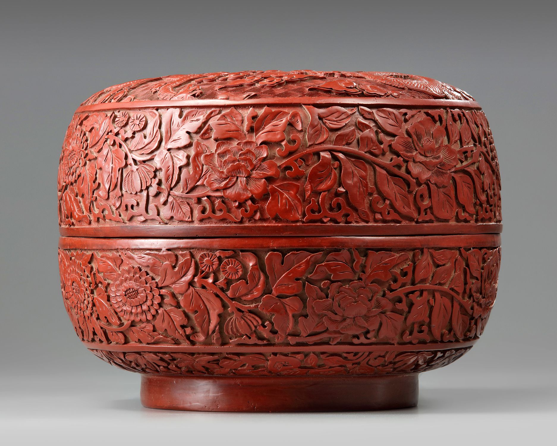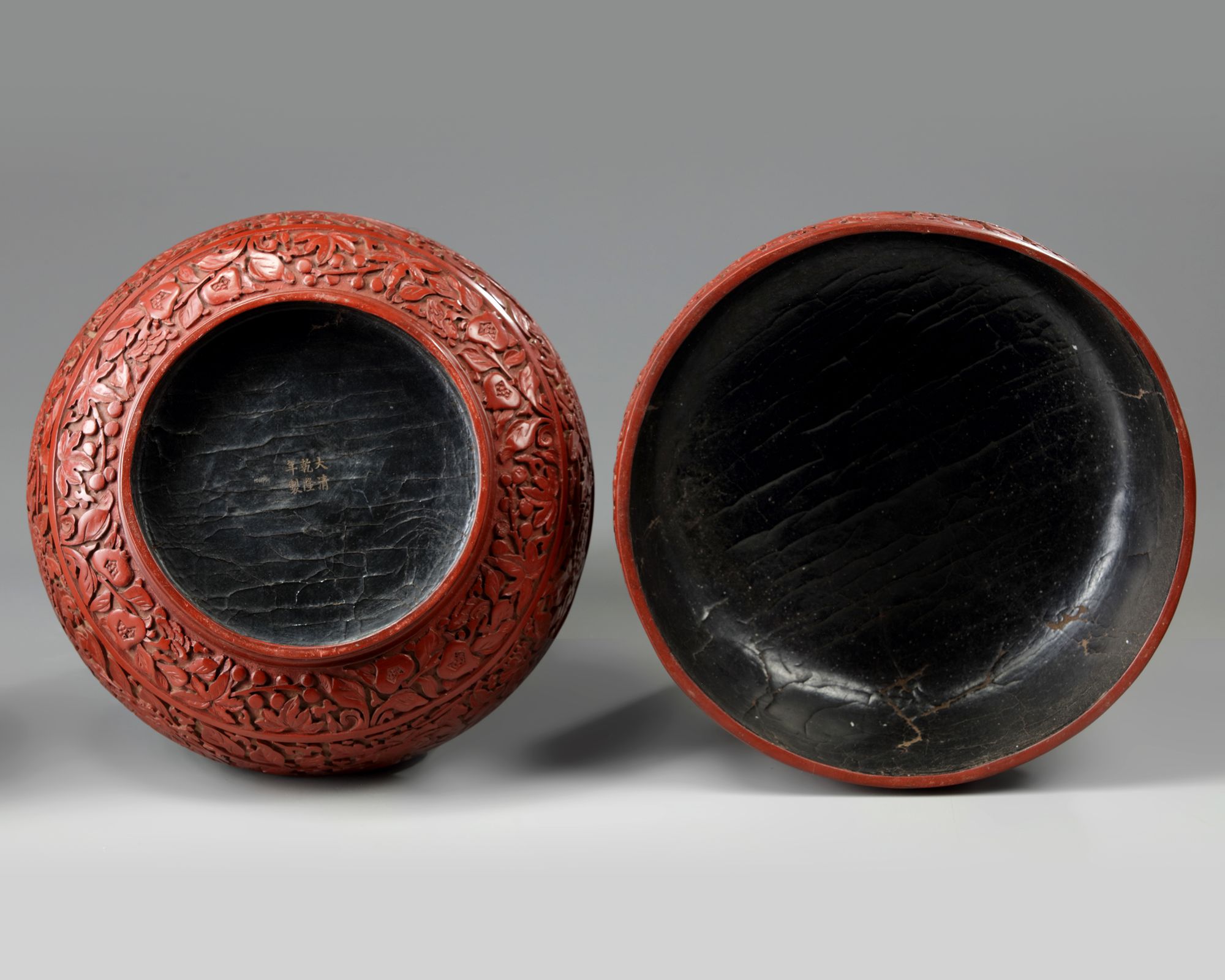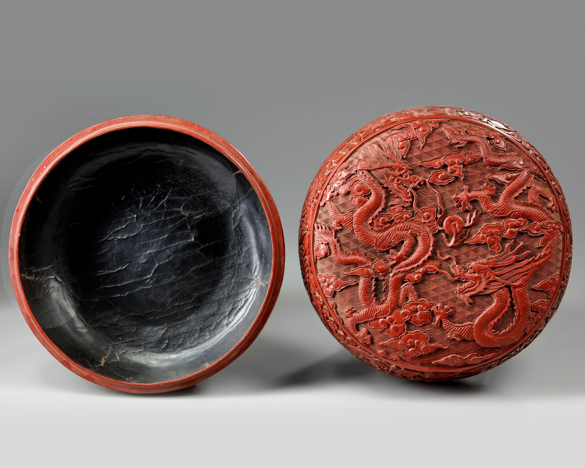 The cover of the box is decorated with two confronting dragons chasing the flaming pearl amongst cloud scrolls on a wave ground. The sides of the box cover and base are decorated with chrysanthemum, hibiscus, and peonies growing from a leafy scroll. The interior and base are lacquered black, the base with an apocryphal Qianlong mark.