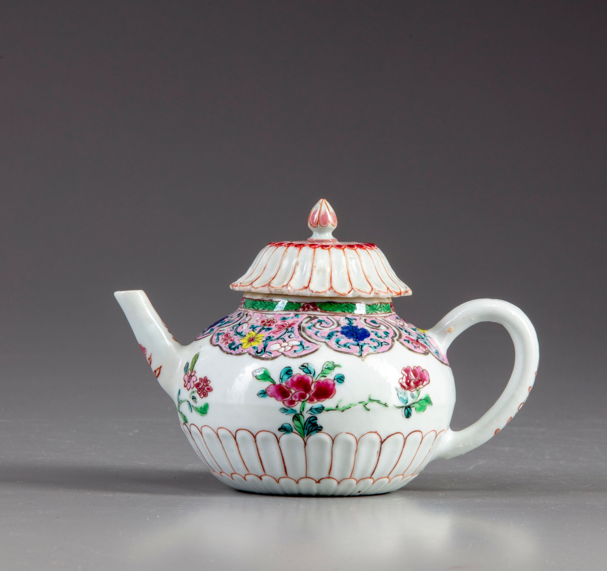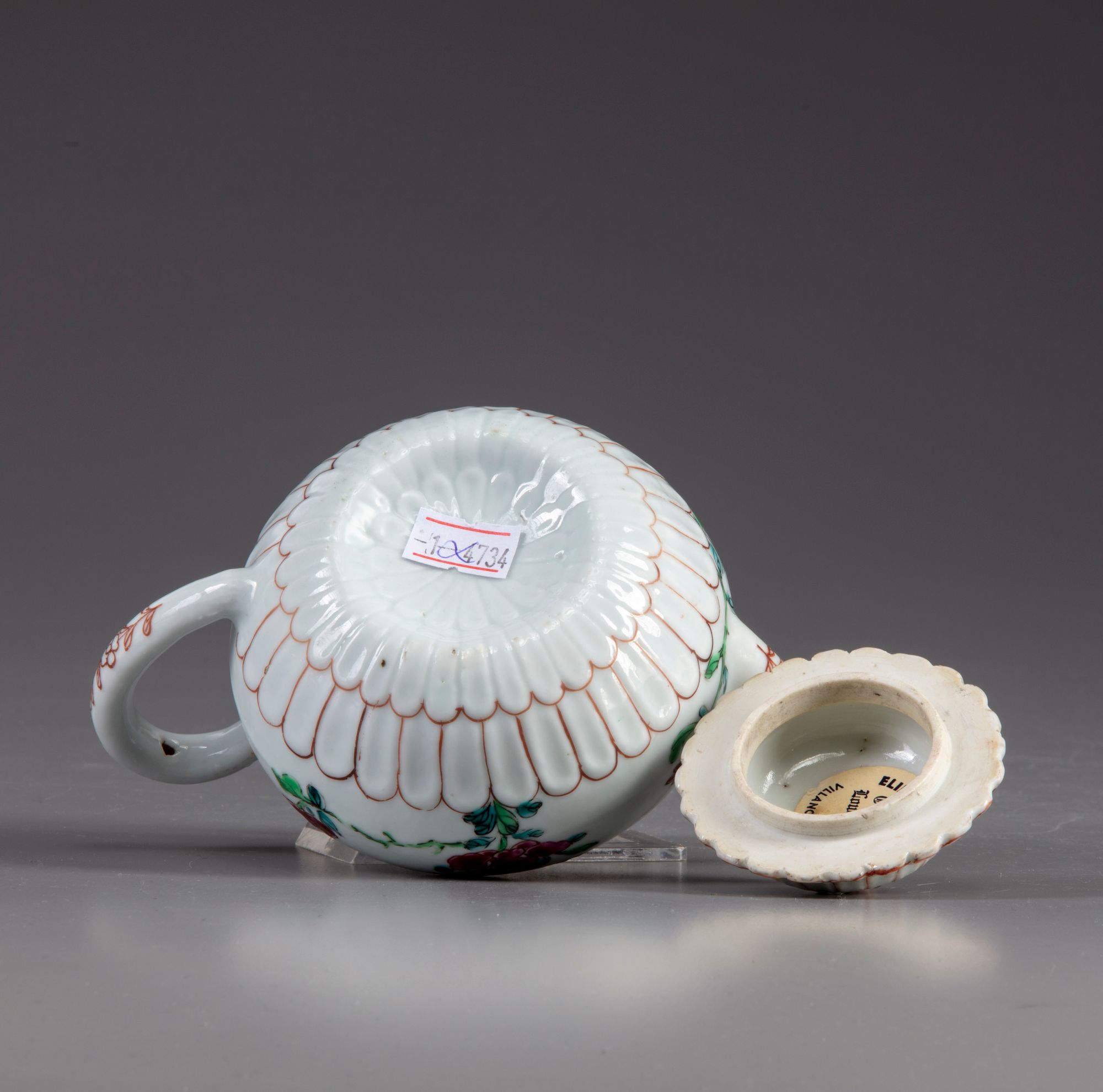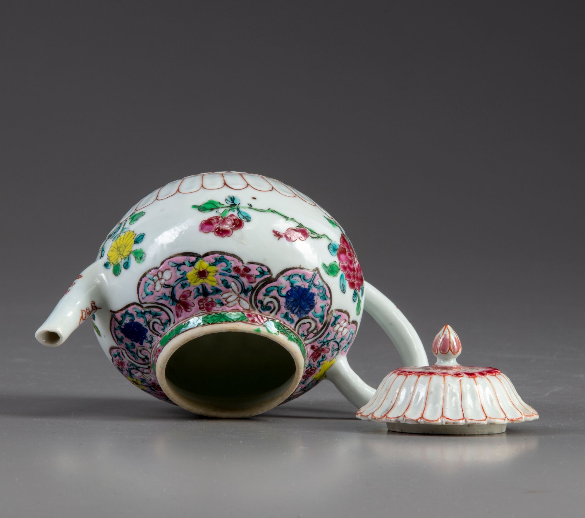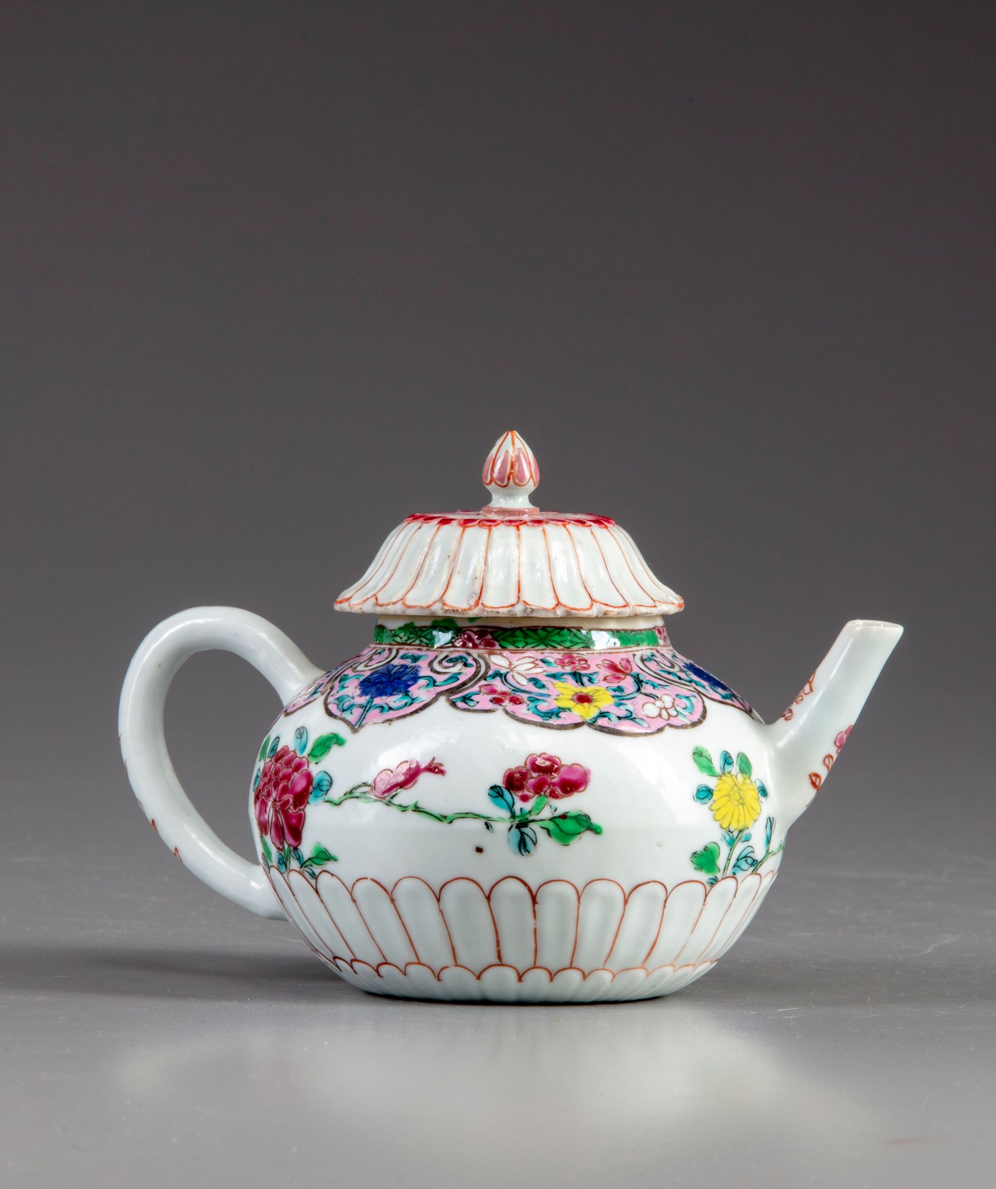A globular teapot decorated with peonies below a ruyi-head lappet border, the cover is moulded as a chrysanthemum.
