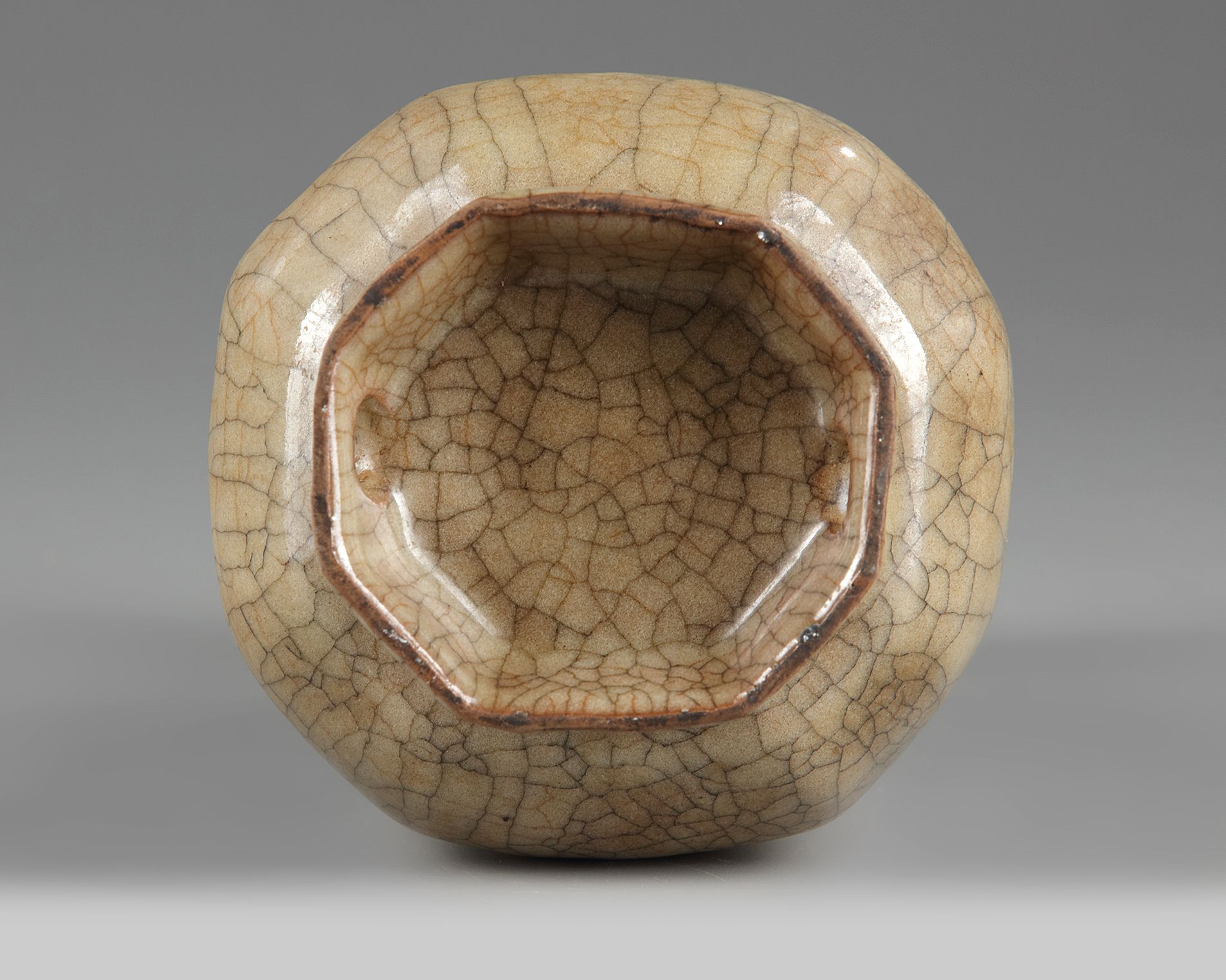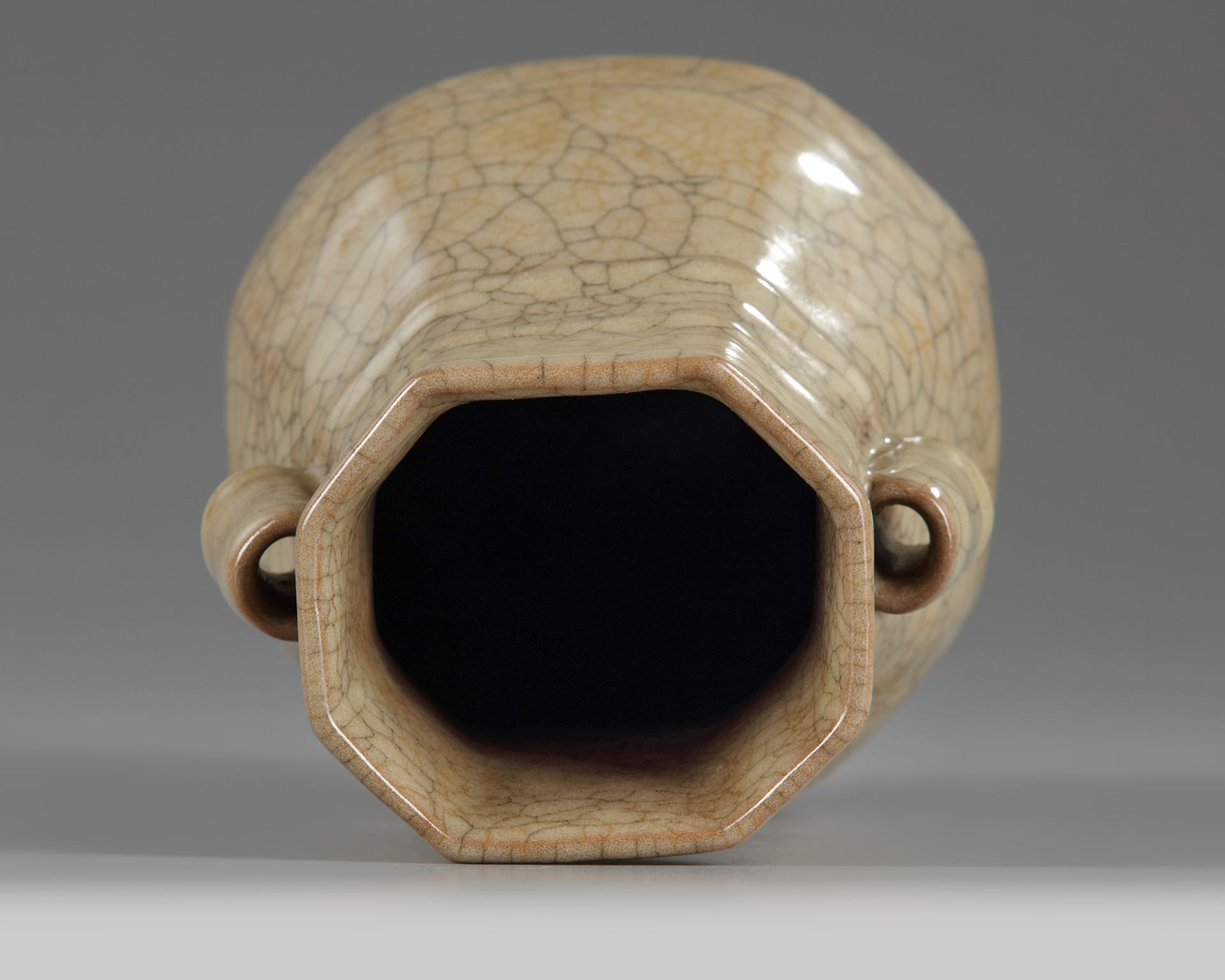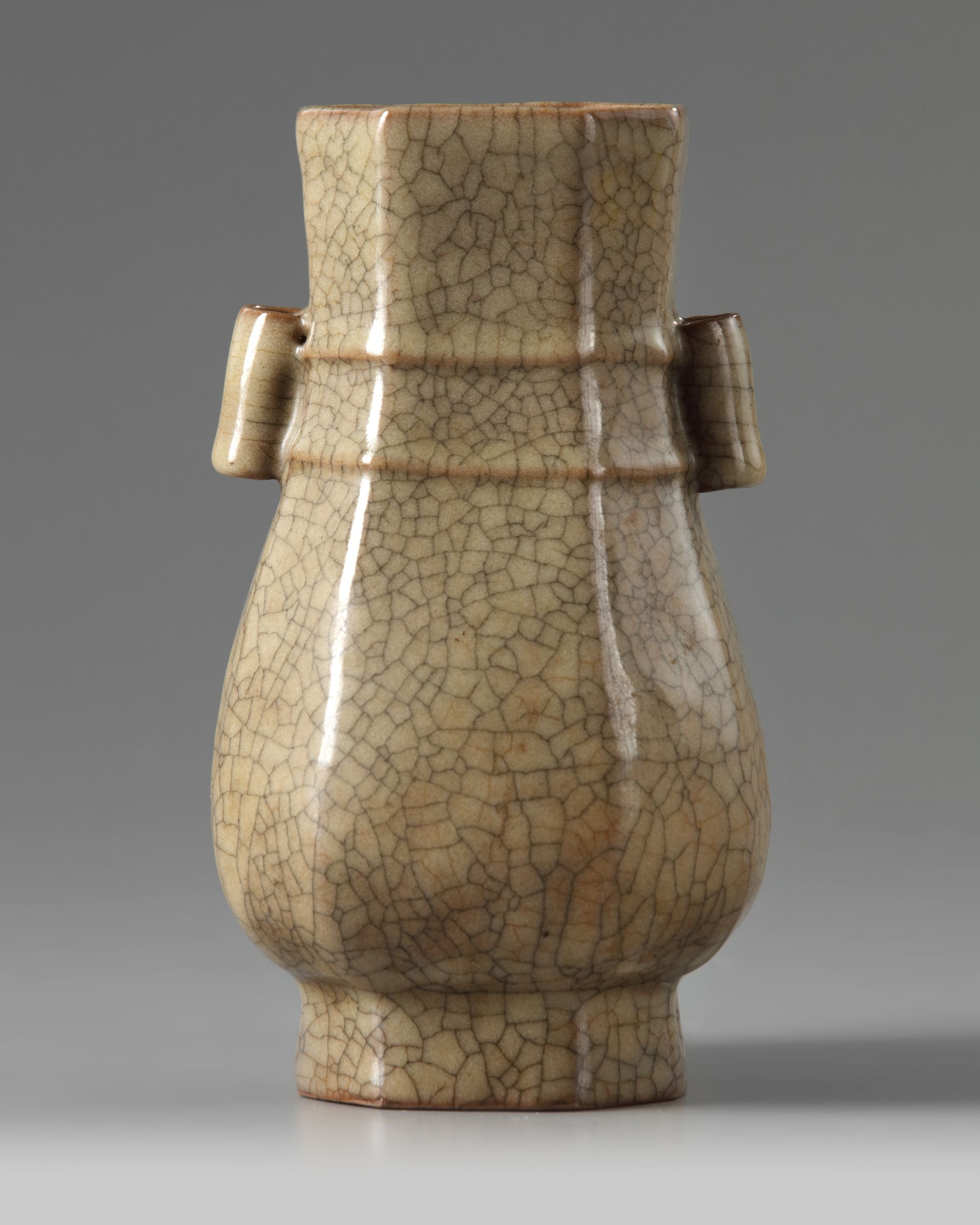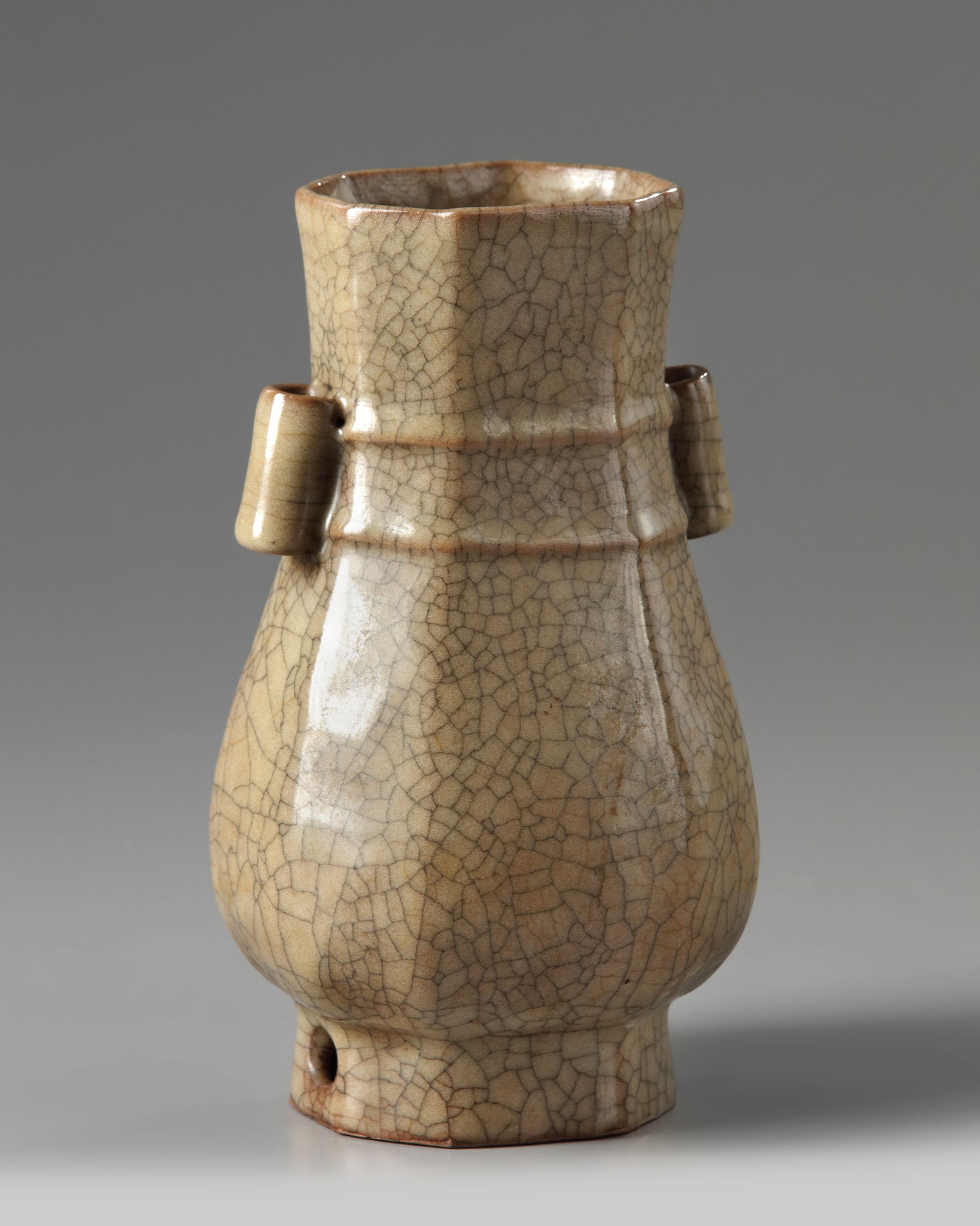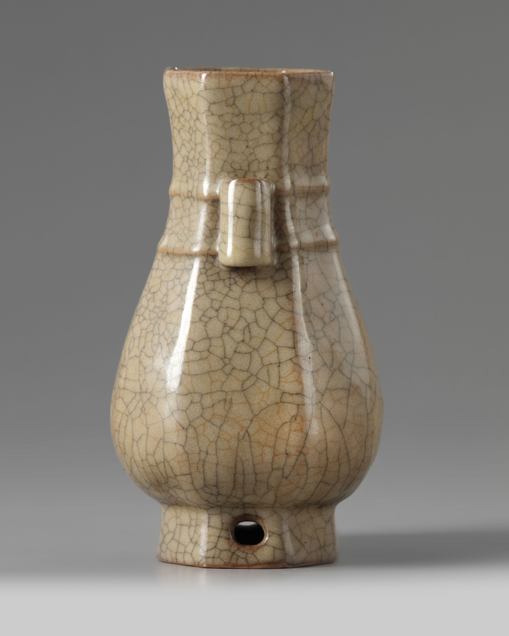 The angular pear-shaped vase is decorated with two tubular handles and two horizontal ribs to the neck. The vase stands on a high foot which is pierced at both sides. The vase is covered overall with a caramel glaze suffused with crackles.