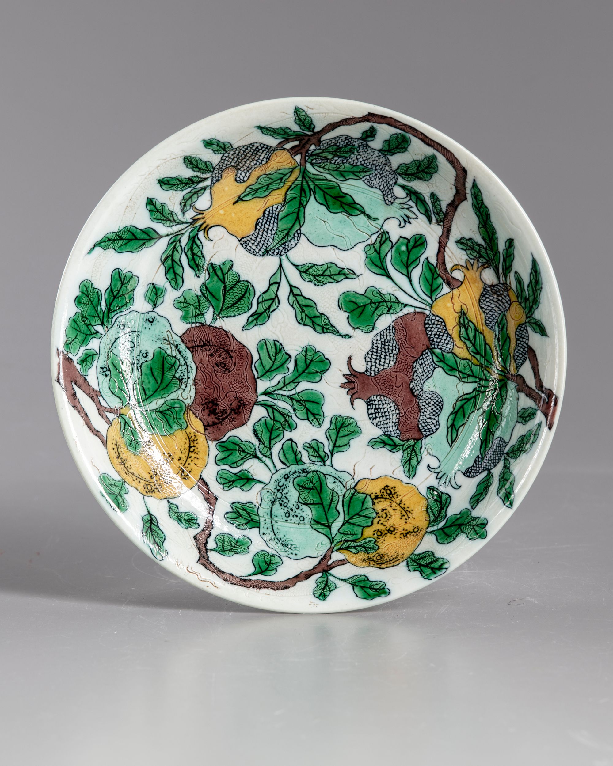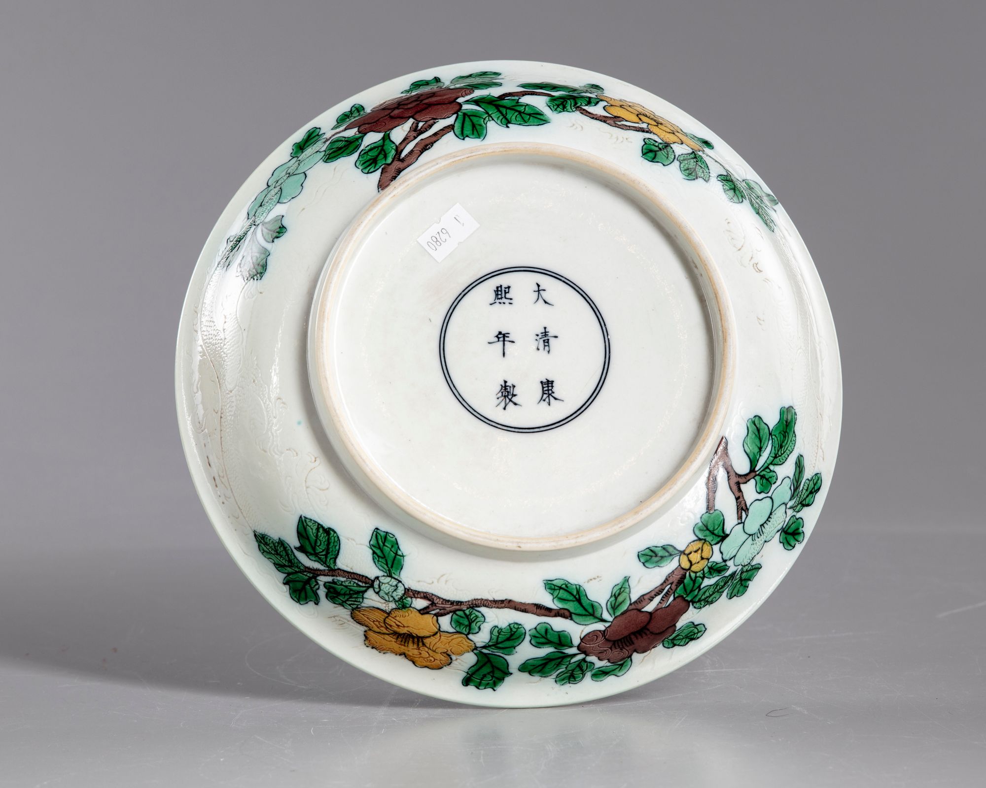 The dish is decorated to the interior with fruiting branches of pomegranate and peaches. The exterior with flowering branches with dragons in low relief. The bottom with a Chinese Kangxi six character mark.
