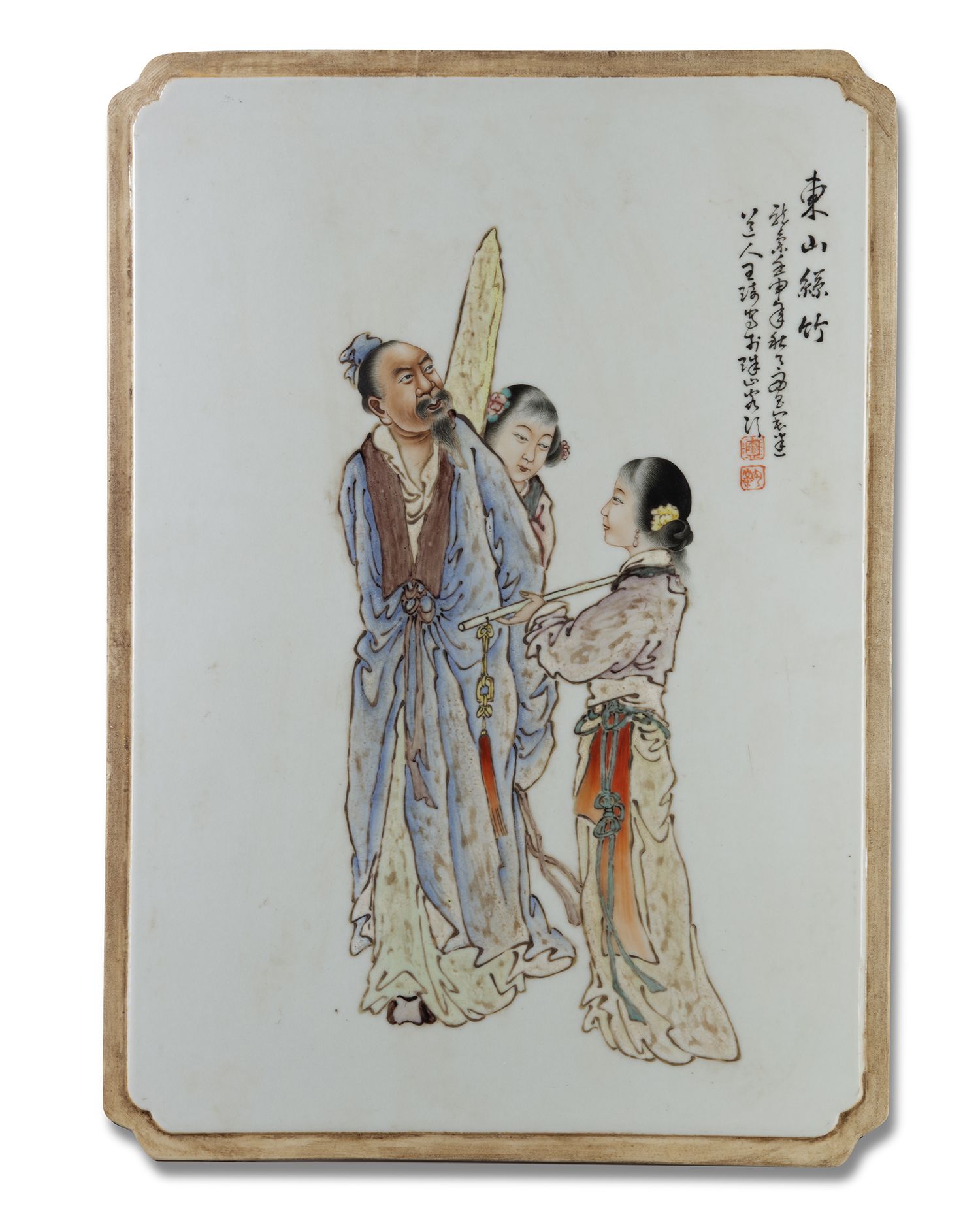 The plaque is enamelled with a central scholar Xie An wearing long robes with two female musicians, one is holding a flute and the other a qin. The scene is entitled ‘Dongshan Sizhu’, which may be translated as ‘Musicians of the Eastern Mountain’, dated renshen year, and with the signature of Wang Bu and two seals in iron red.
