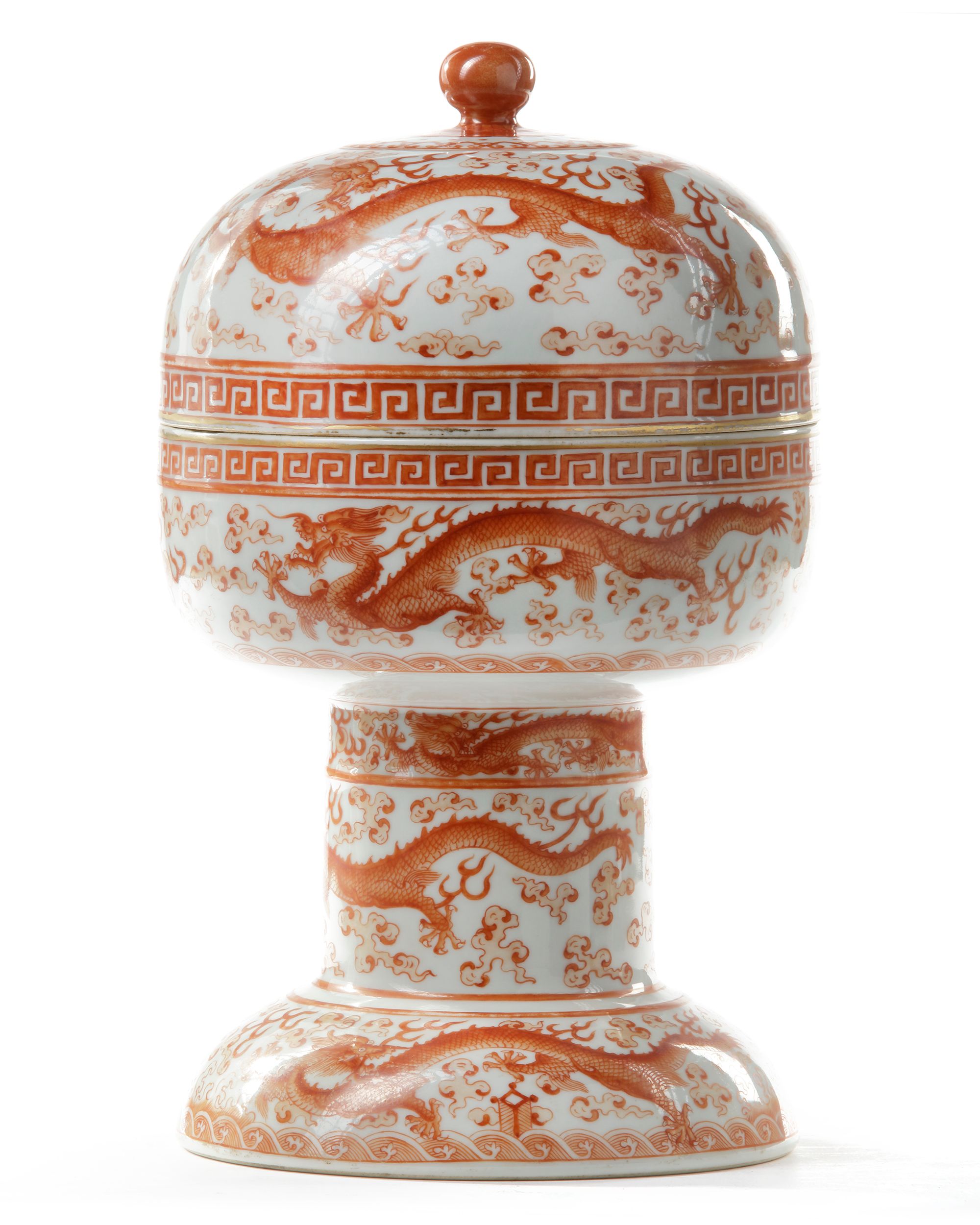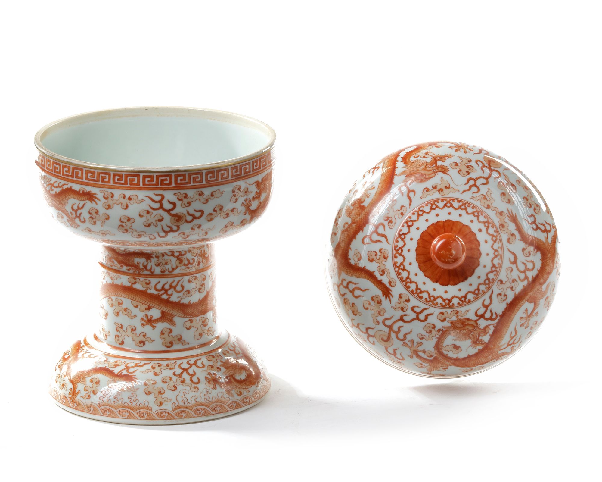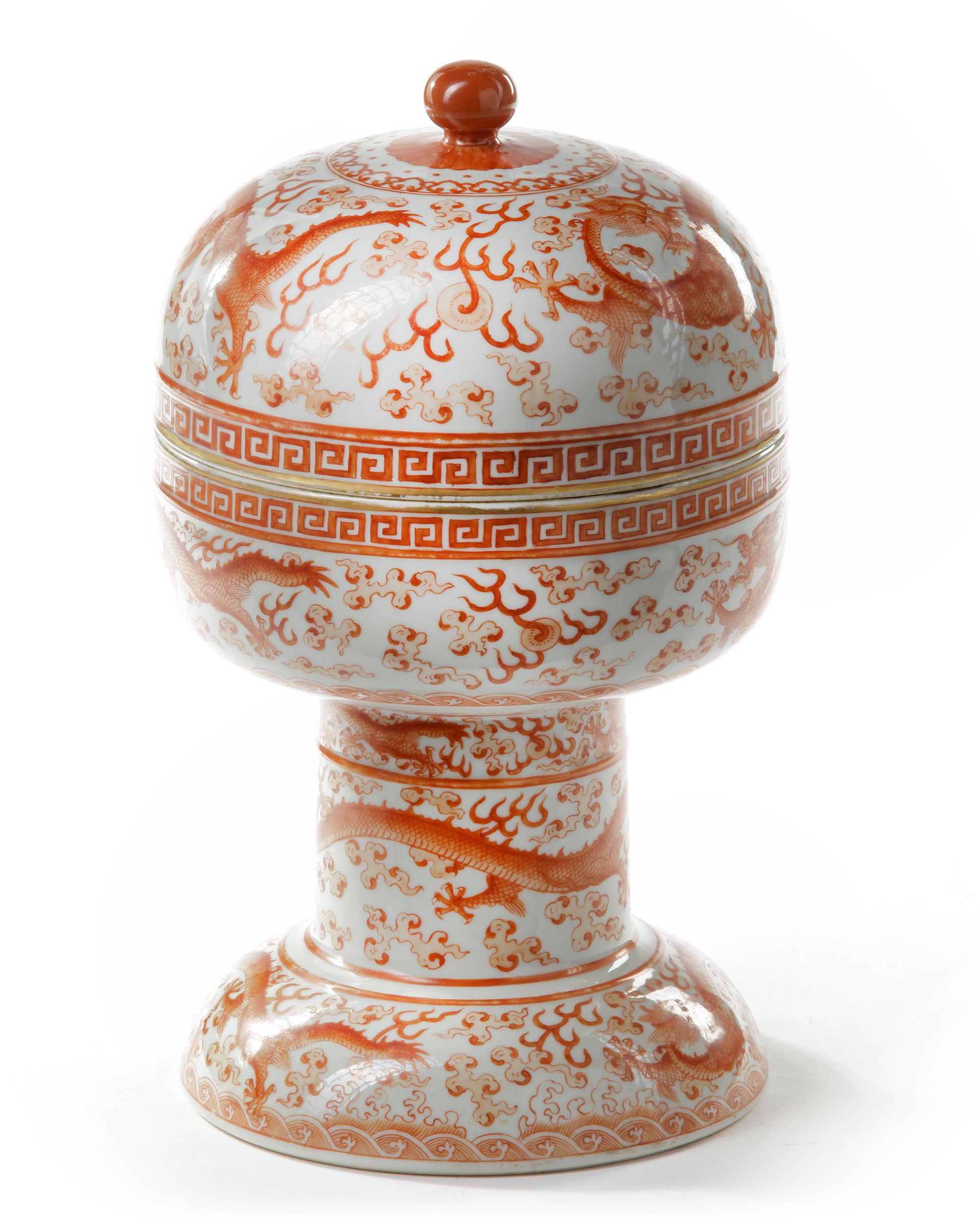 The vessel is crafted as a deep bowl supported on a high cylindrical stem with tall domed foot. The exterior is finely decorated with ferocious five-clawed dragons amongst clouds in pursuit of the flaming pearl above a wave band, all repeated around the stem and foot. The domed cover is similarly decorated and is surmounted by a knop finial. The interior of the foot has a Guangxu six-character mark in underglaze blue. 29 cm.