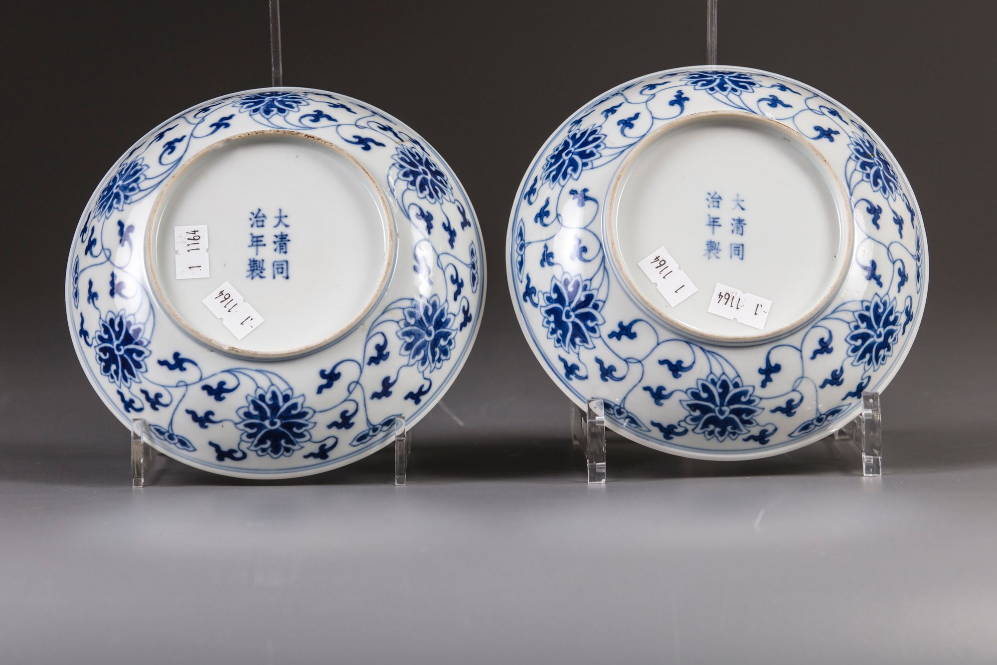 The dishes are decorated with a central roundel enclosing densely scrolling lotus, the rims decorated with lotus heads and fines. The reverses with further scrolling lotus.