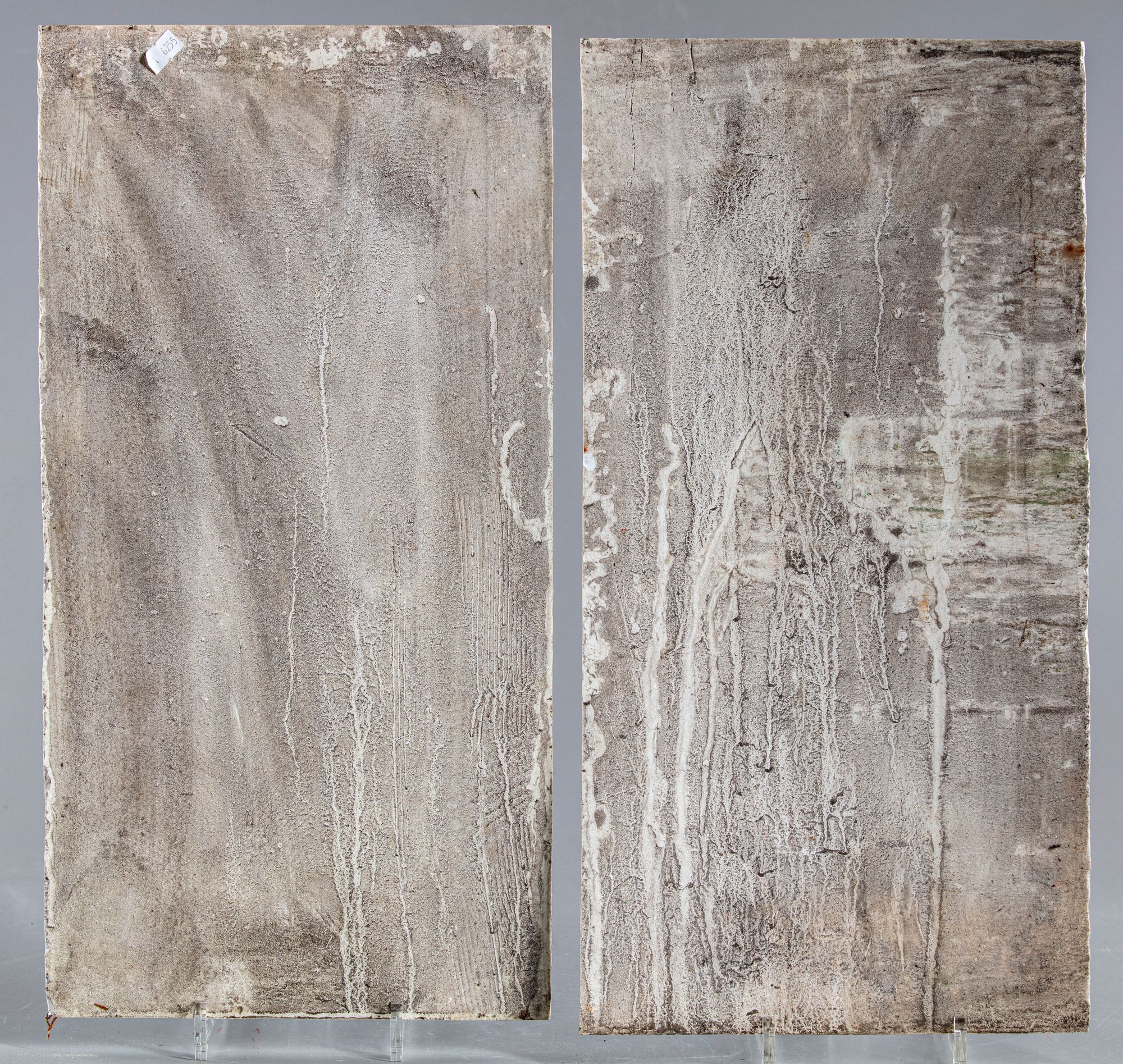 Two Chinese porcelain rectangular plaques, decorated with figures within a village in a mountainous landscape.