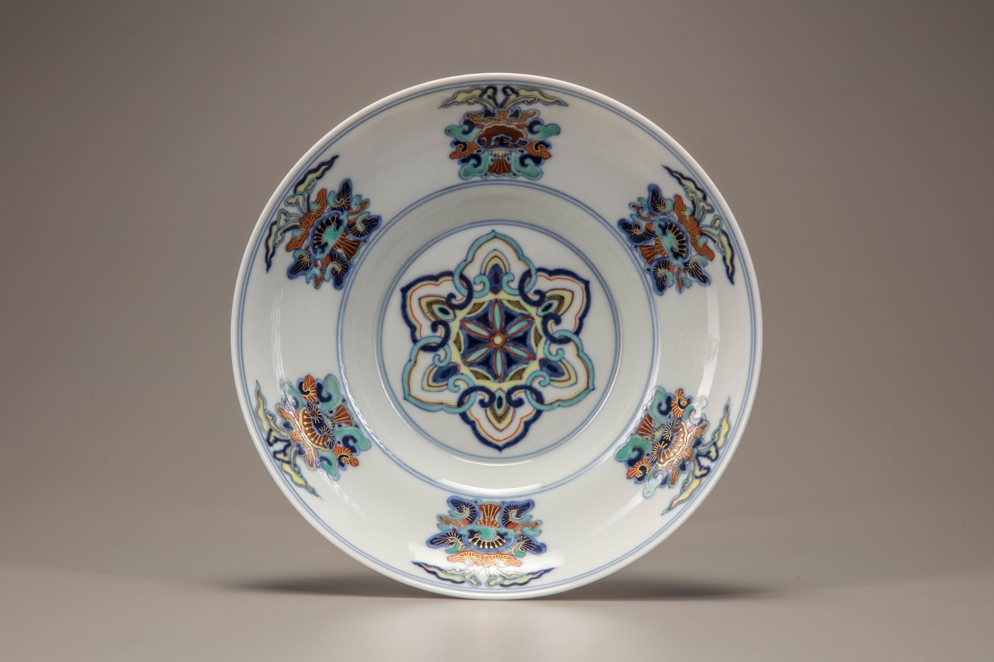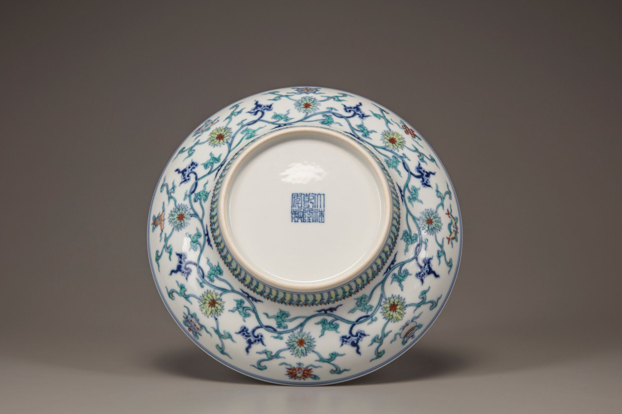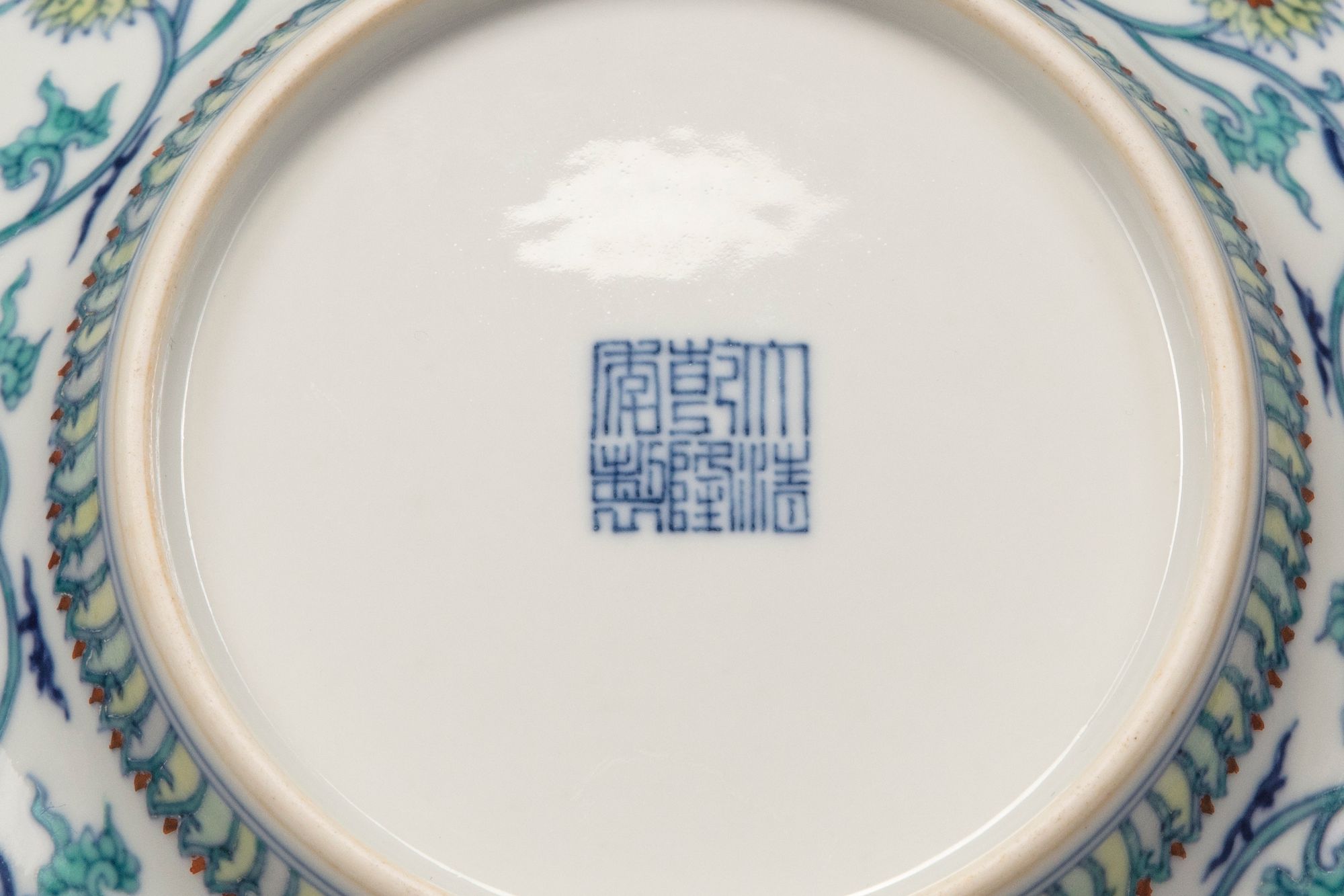 The dish is decorated and gilt to the interior with a central floral roundel surrounded by linked ruyi-heads, the rim is decorated with elaborate stylised lingzhi sprays. The exterior is decorated with the Eight Buddhist Emblems, bajixiang, above scrolling lotus and a lappet band. The base with an apocryphal Qianlong seal mark.