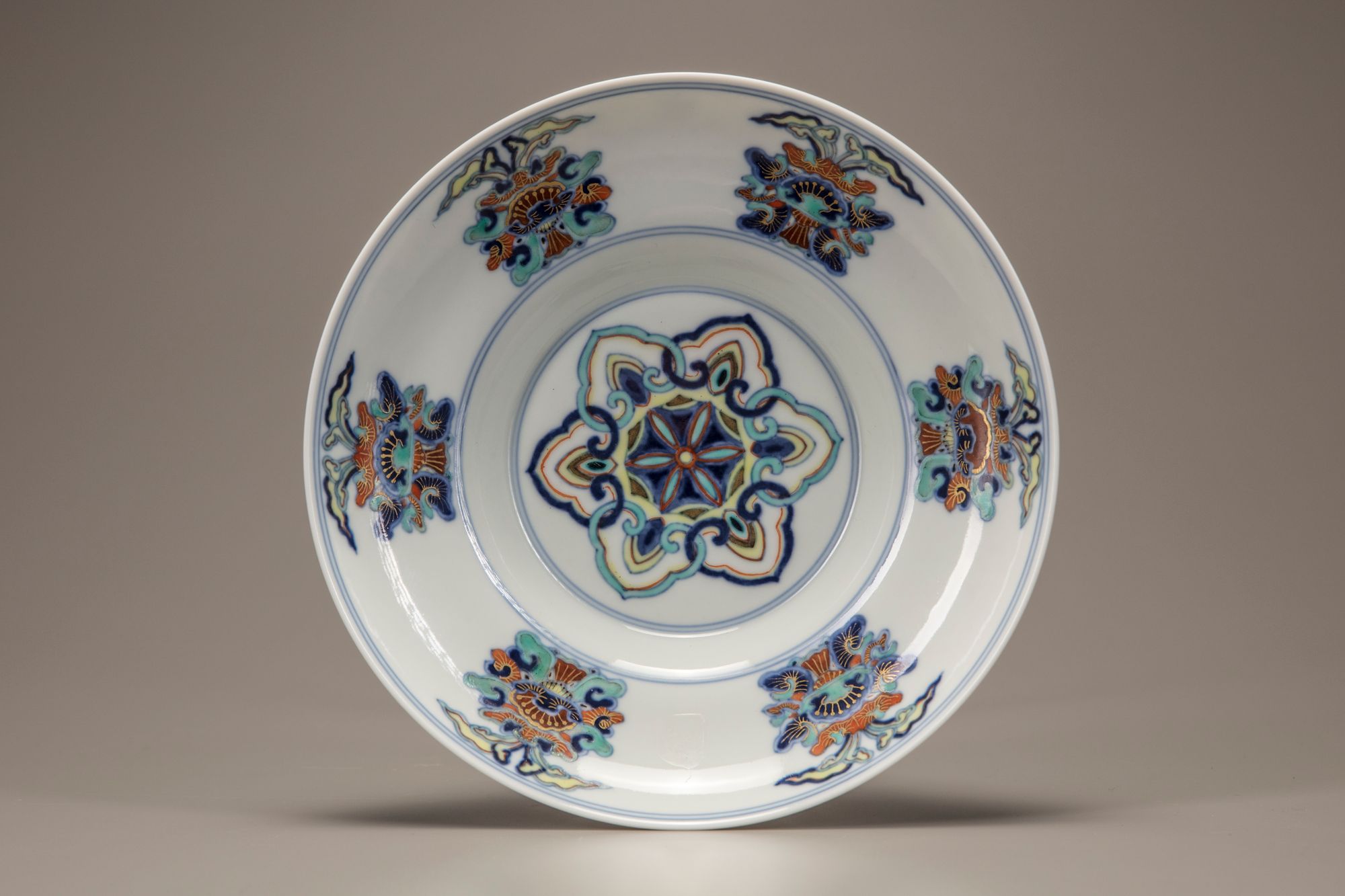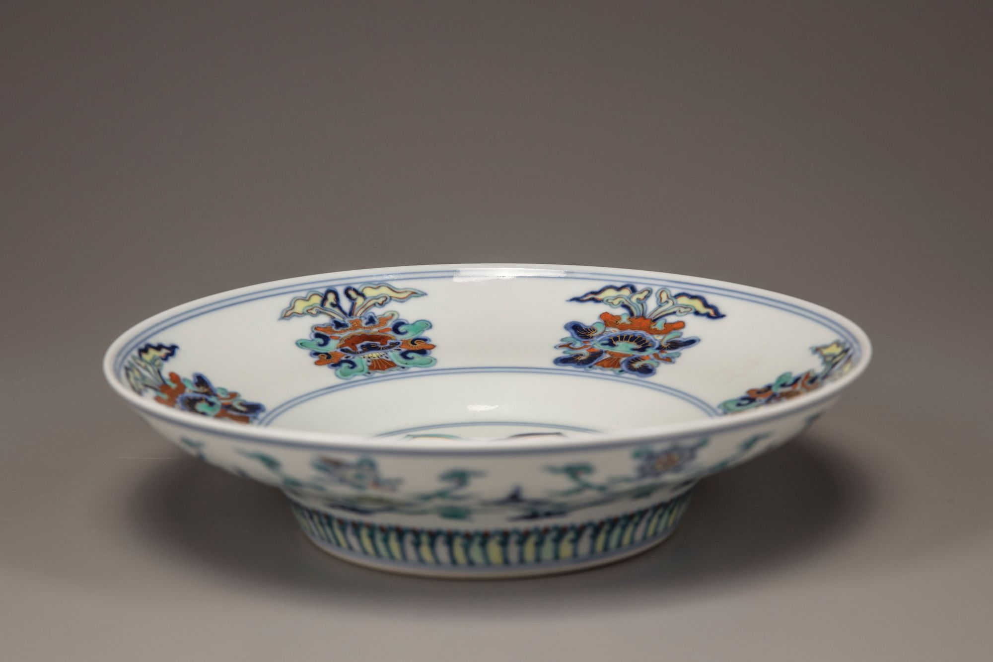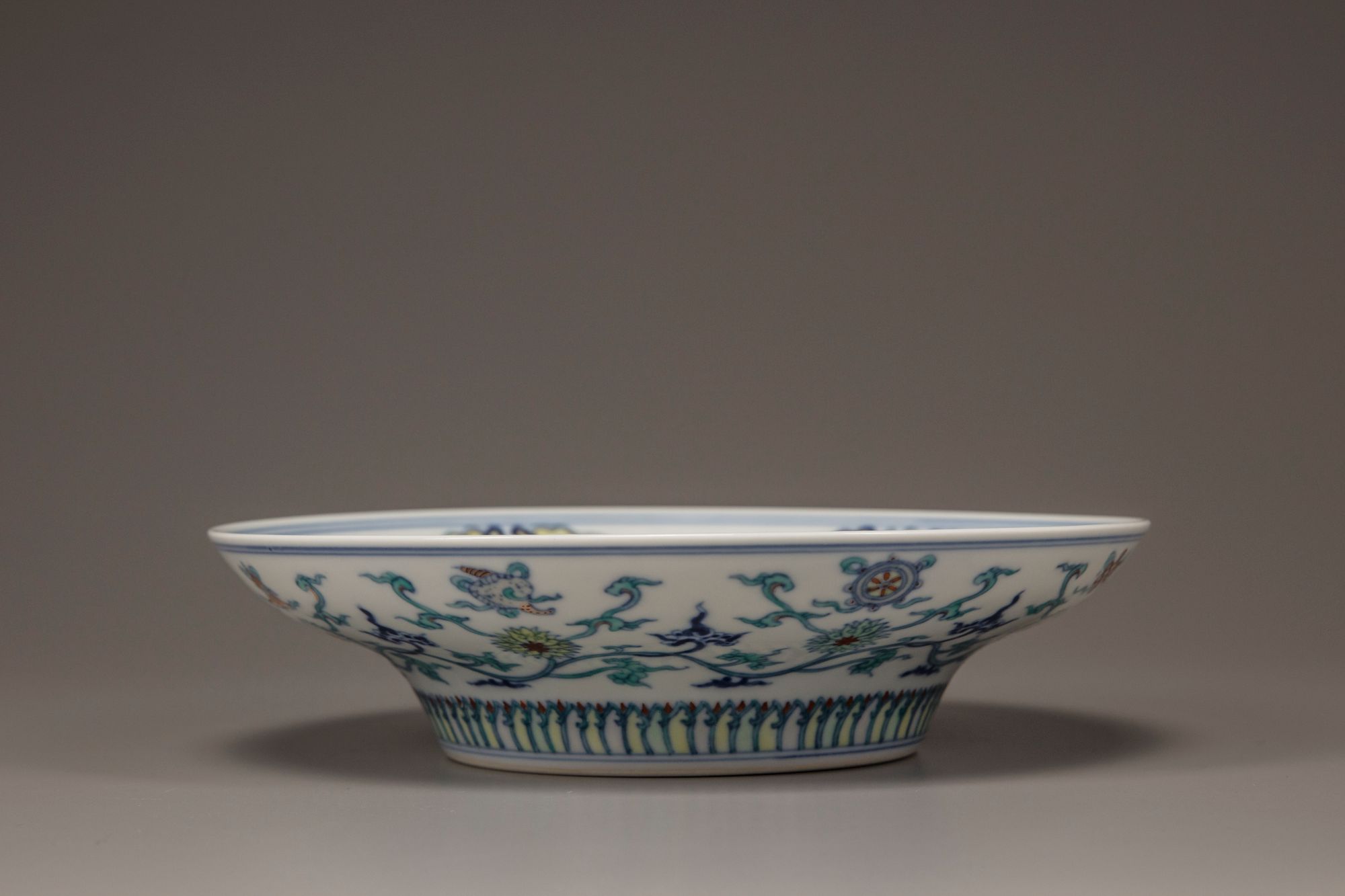The dish is decorated and gilt to the interior with a central floral roundel surrounded by linked ruyi-heads, the rim is decorated with elaborate stylised lingzhi sprays. The exterior is decorated with the Eight Buddhist Emblems, bajixiang, above scrolling lotus and a lappet band. The base with an apocryphal Qianlong seal mark.
