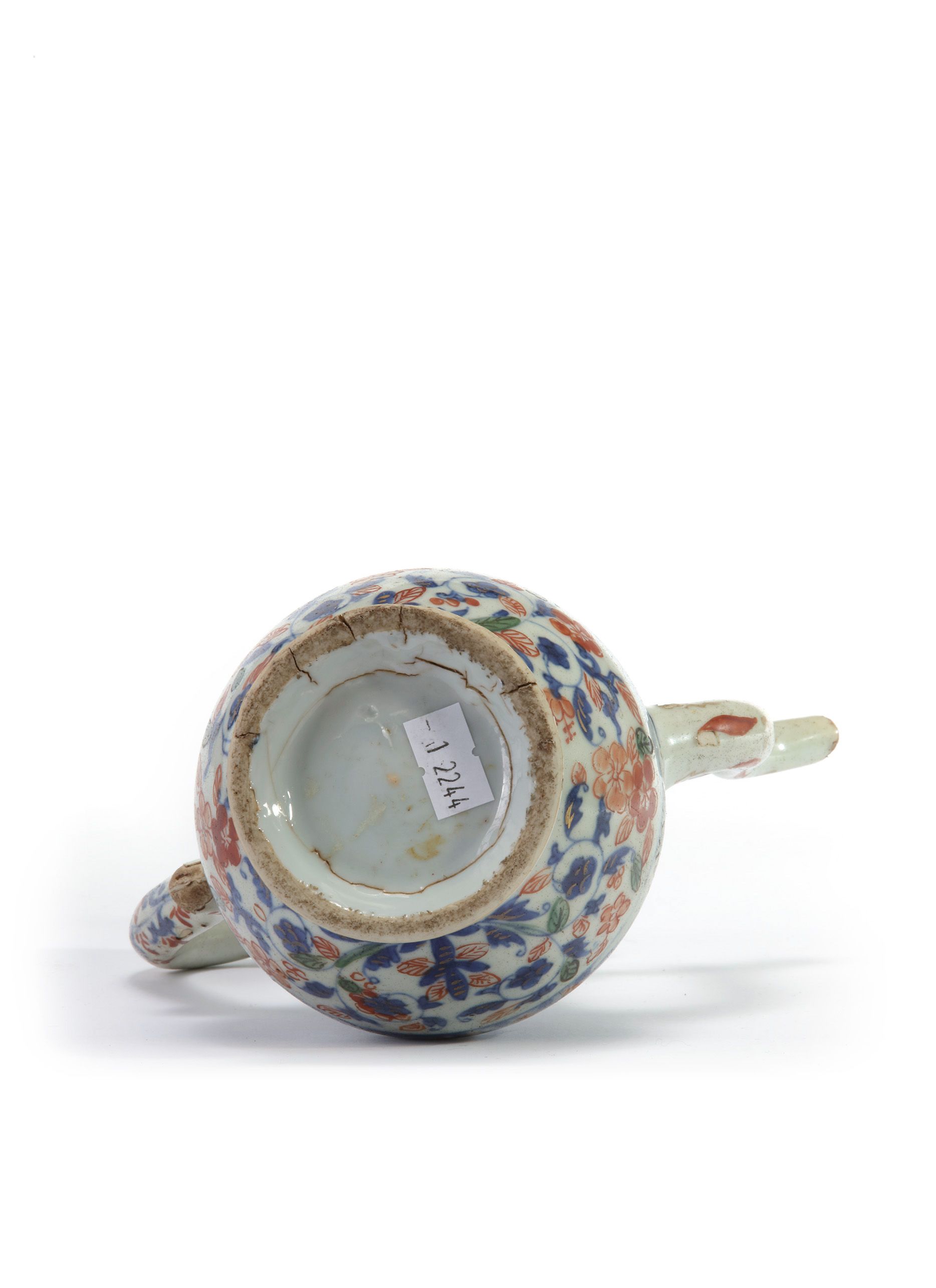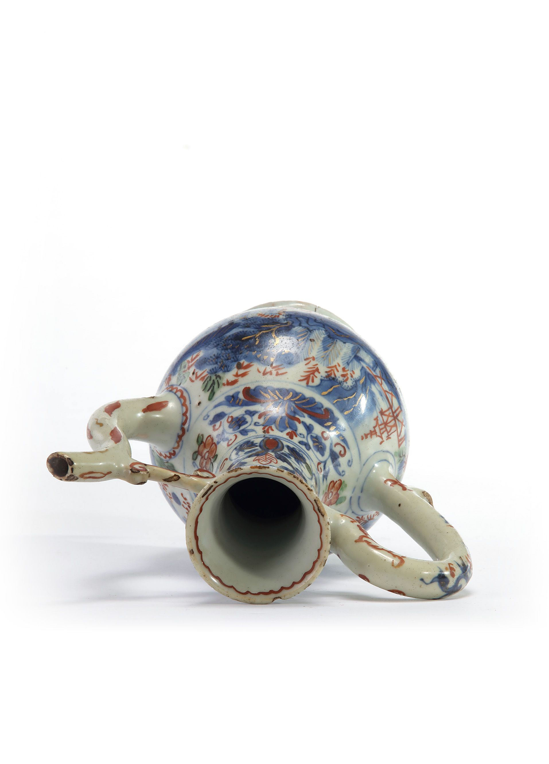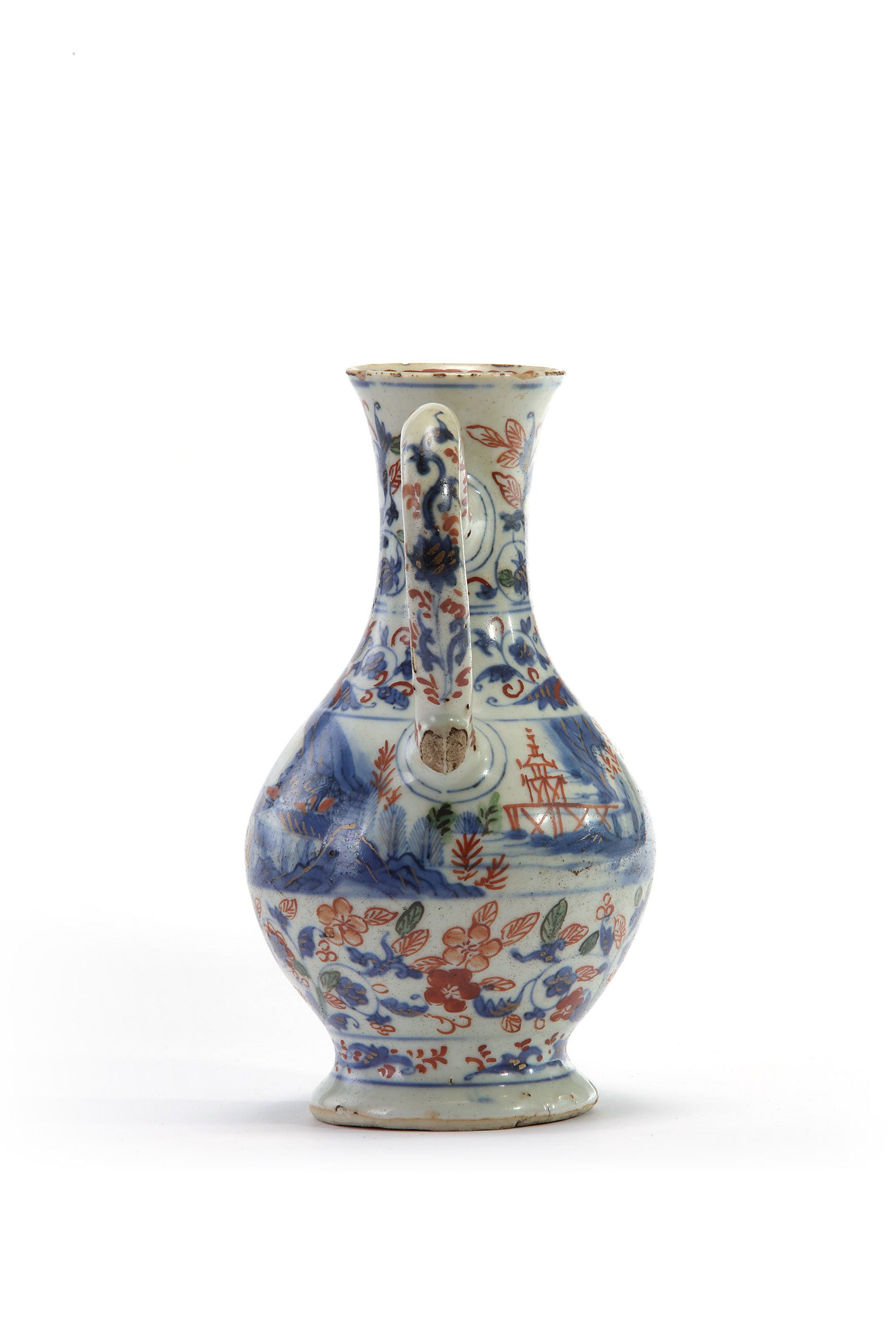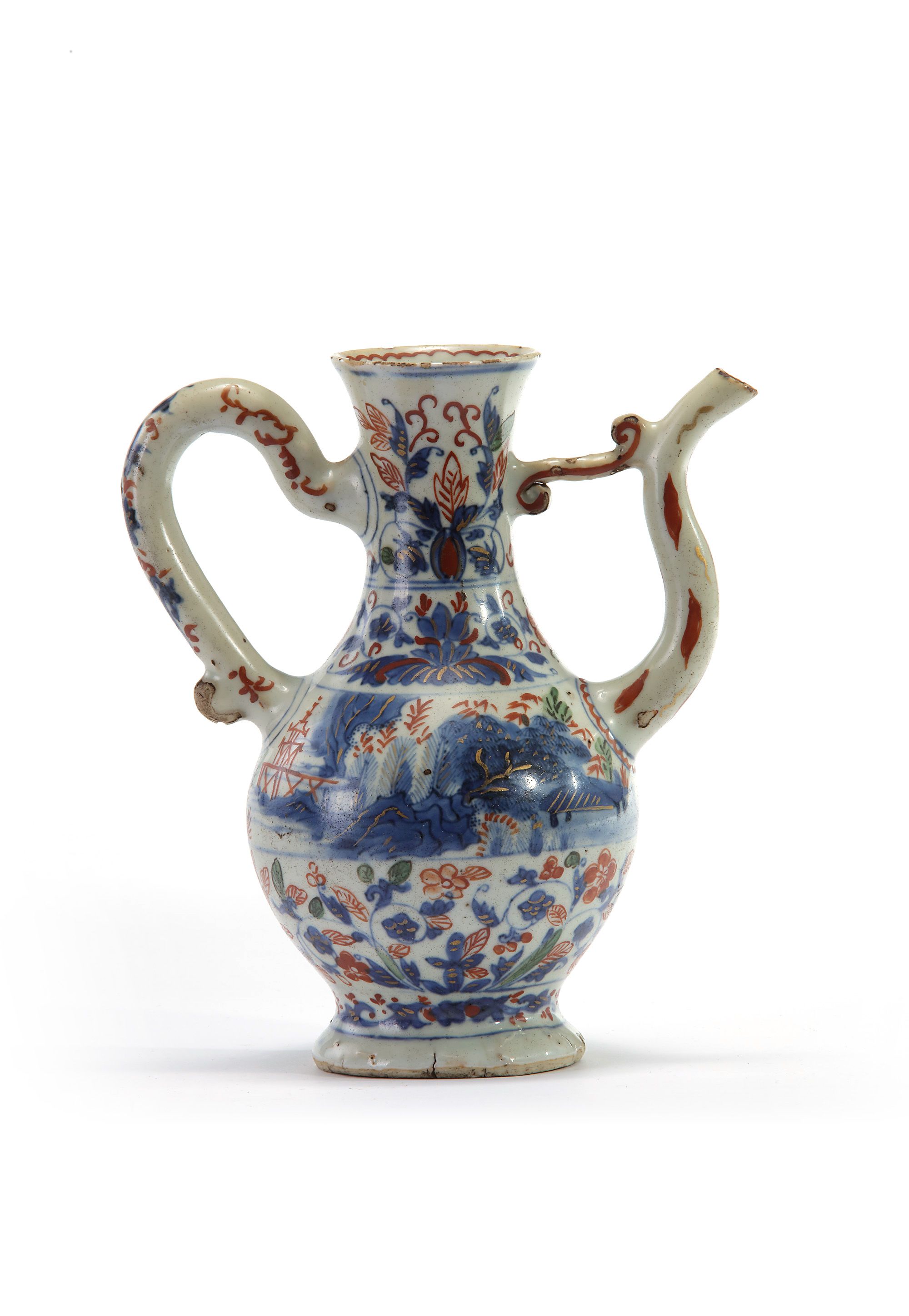 The ewer is decorated with an s-shaped spout with a coiled strut and a c-shaped handle. The body is painted with a scene of pavilions in a mountainous river landscape below to bands of flower sprays. The handle is decorated with further flower sprays. the ewer is later European enamelled with flowers and cloud scrolls.