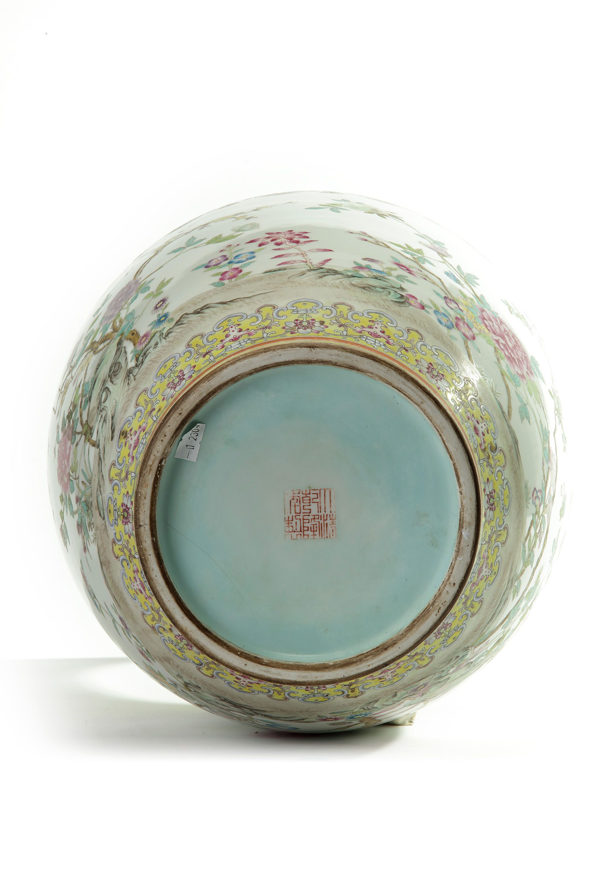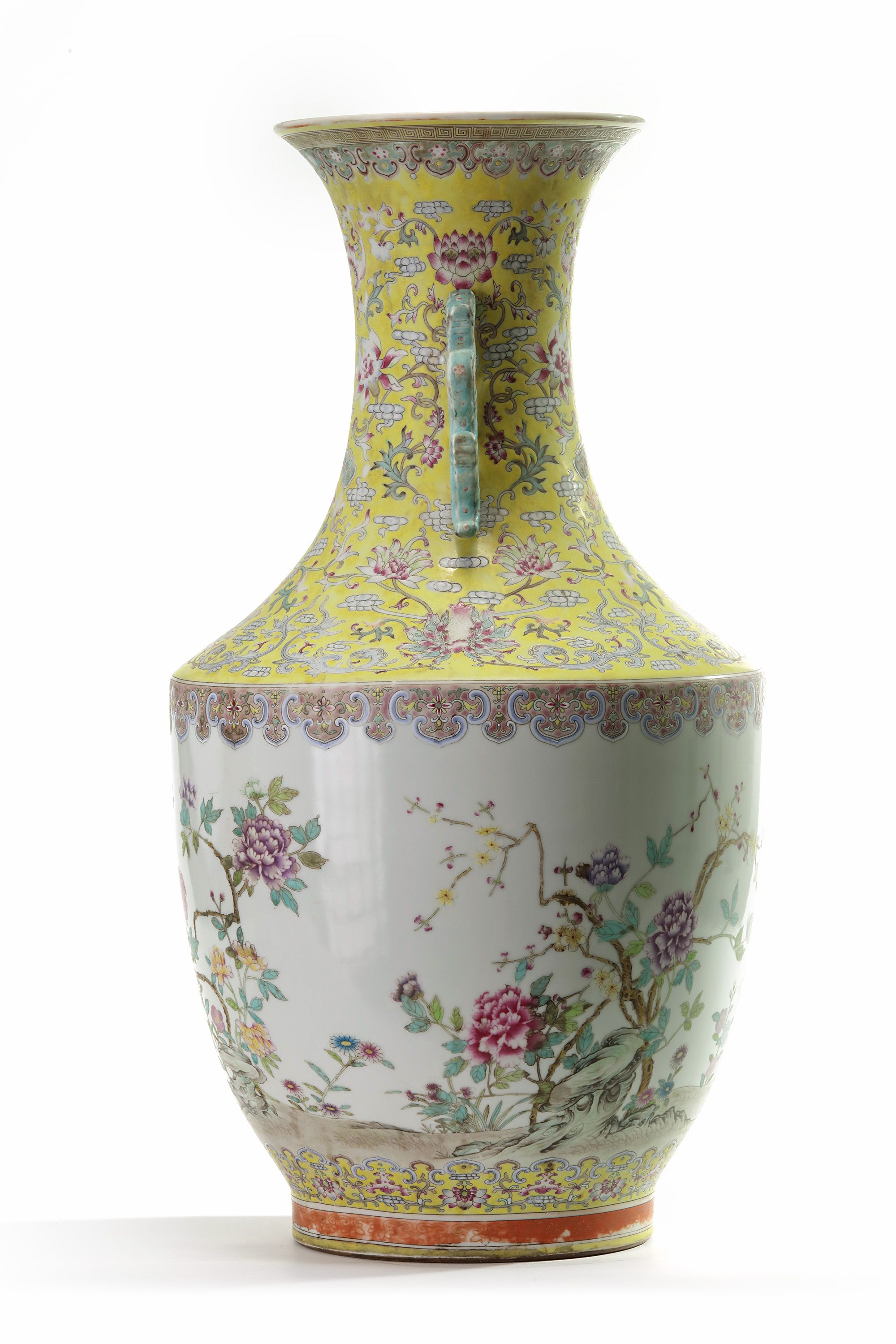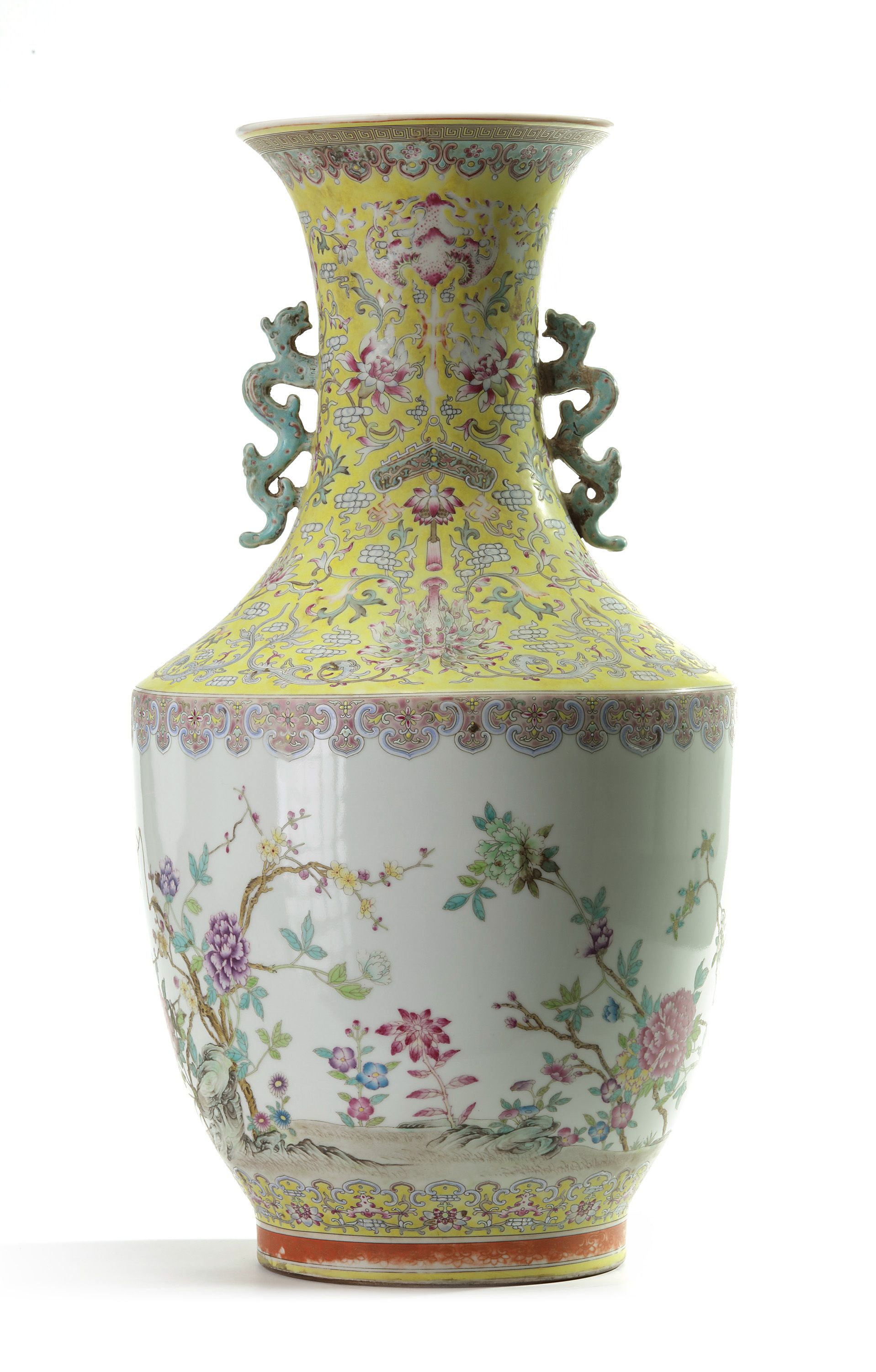 The vase is decorated with a continuous scene of flowering peony branches and chrysanthemums, surrounded by further flowers, set between two bands of ruyi heads enclosing flowers and lotus scrolls. The neck is decorated with two dragon handles and is decorated with two bats suspending chimes and lotus blooms and scrolls. The rim is decorated with a ruyi head border and a key fret band. The base is glazed turquoise with an apocryphal Qianlong seal mark.