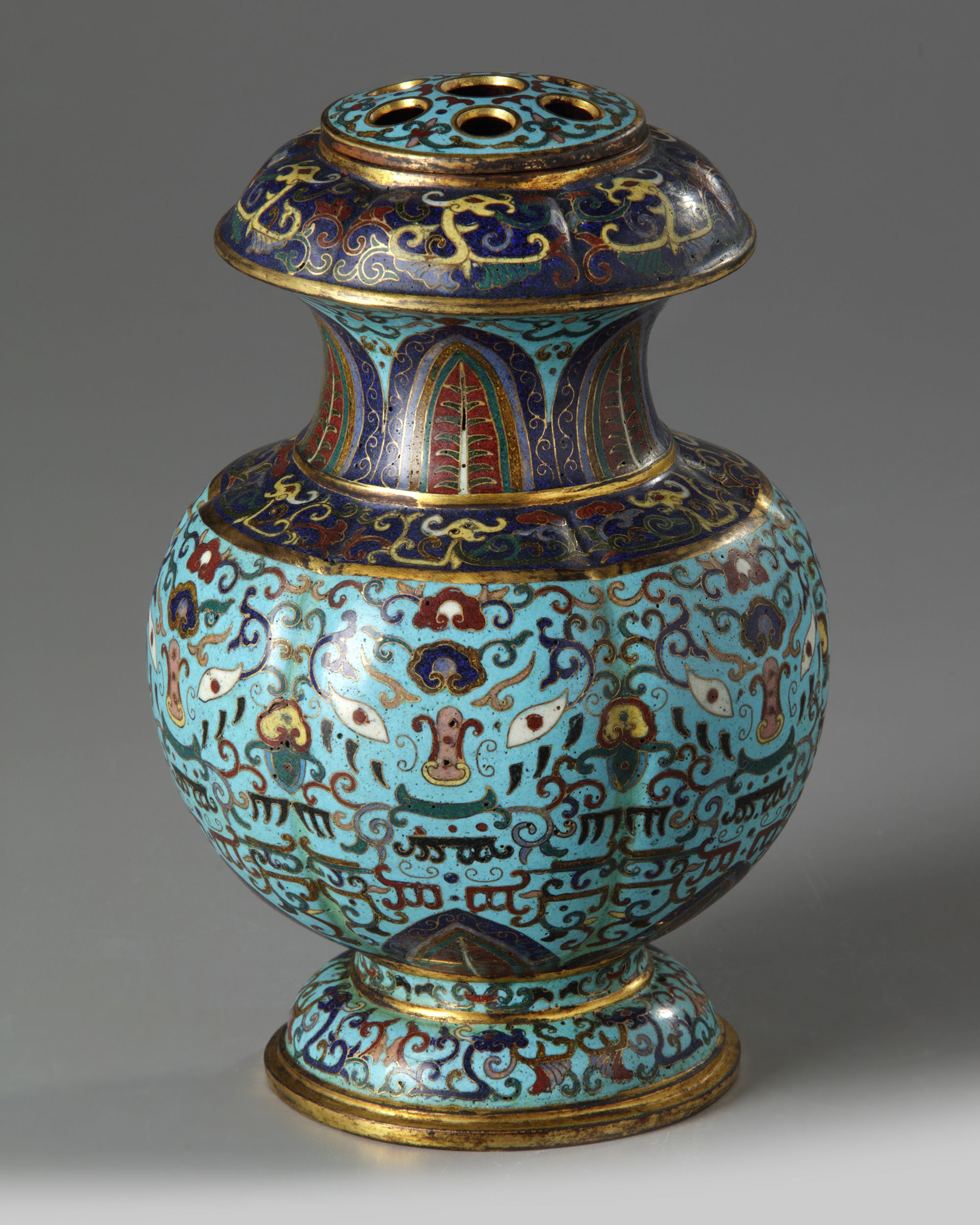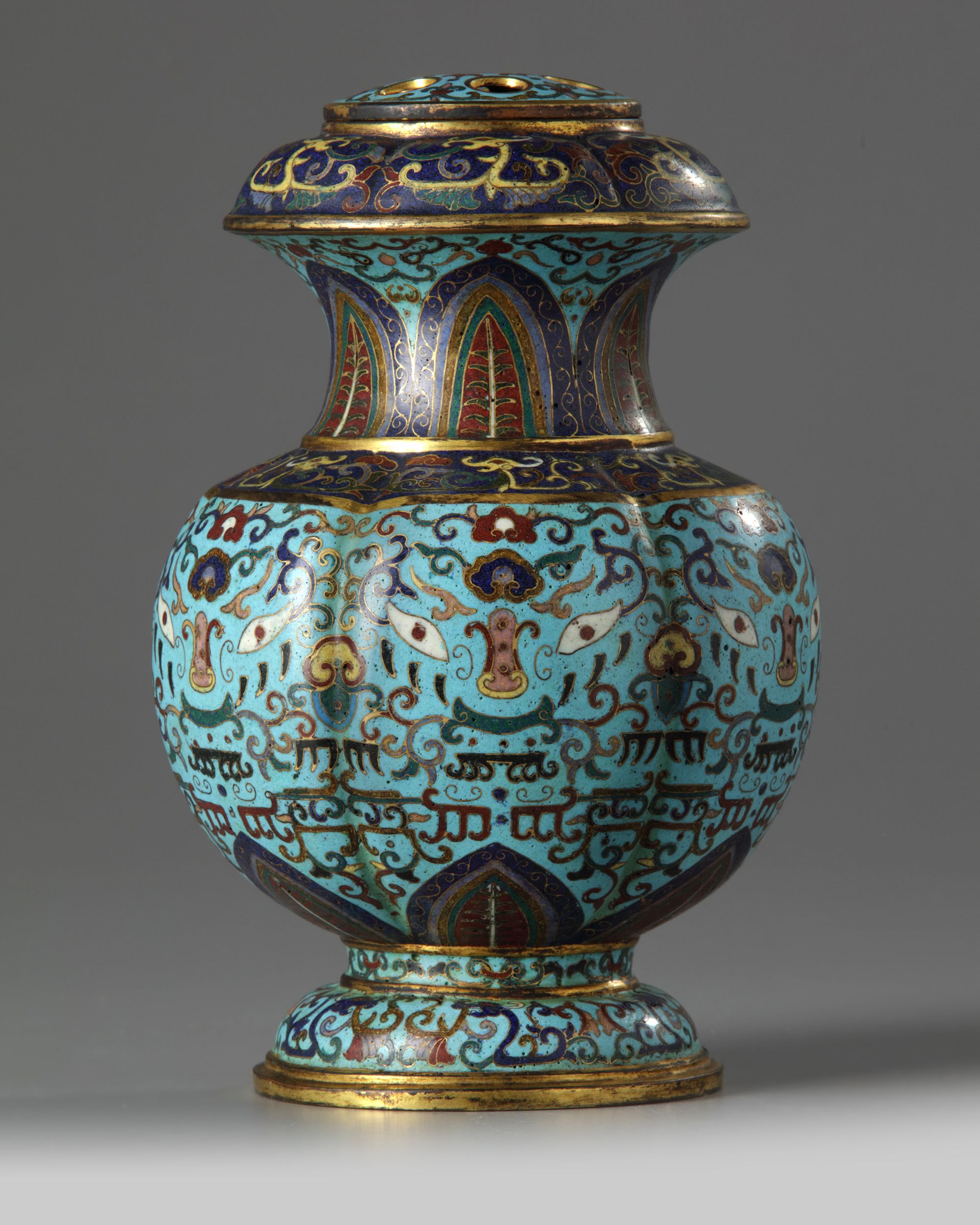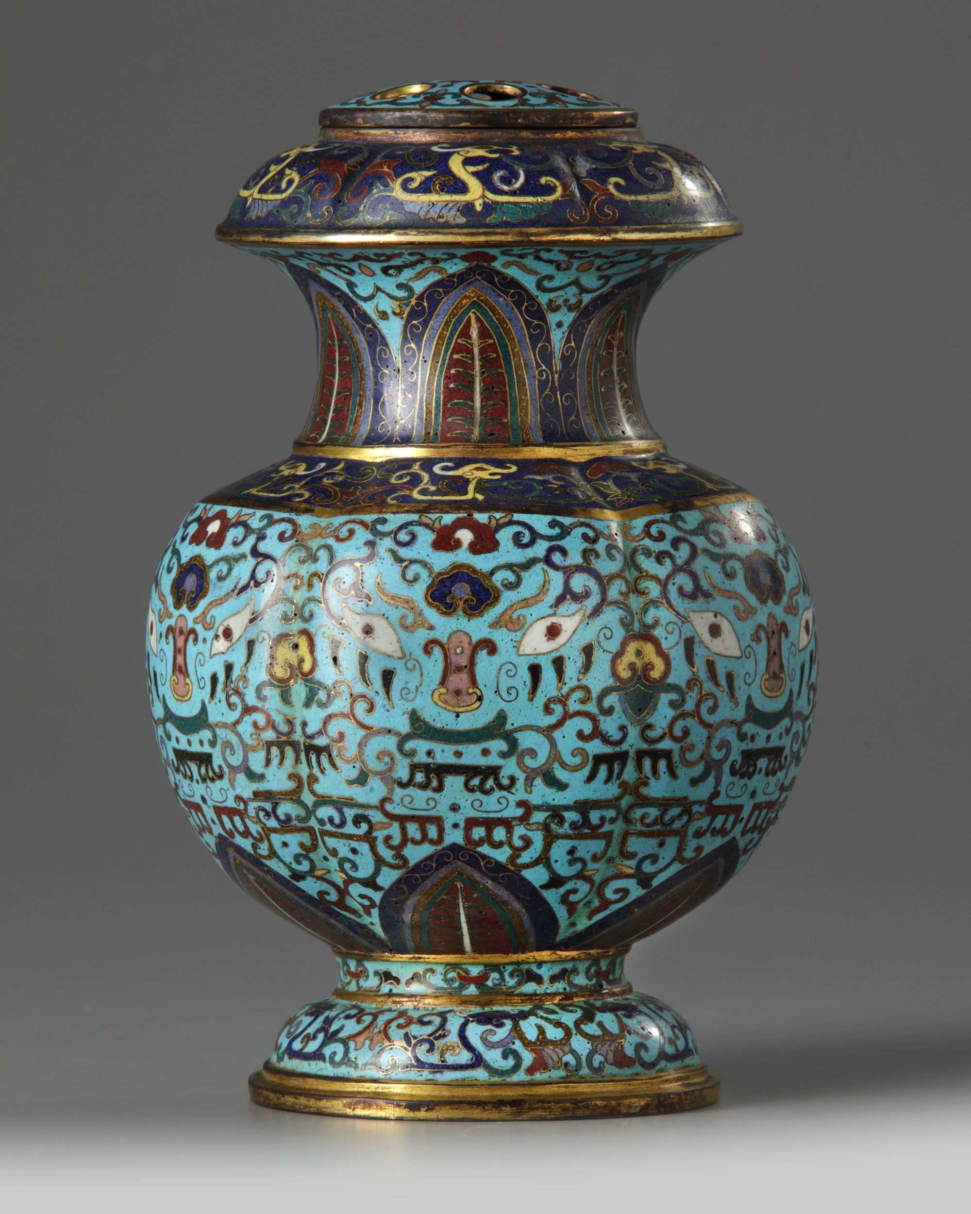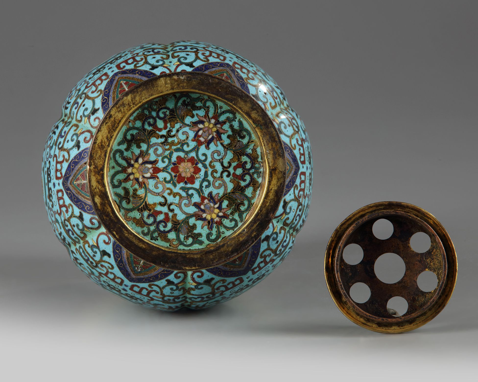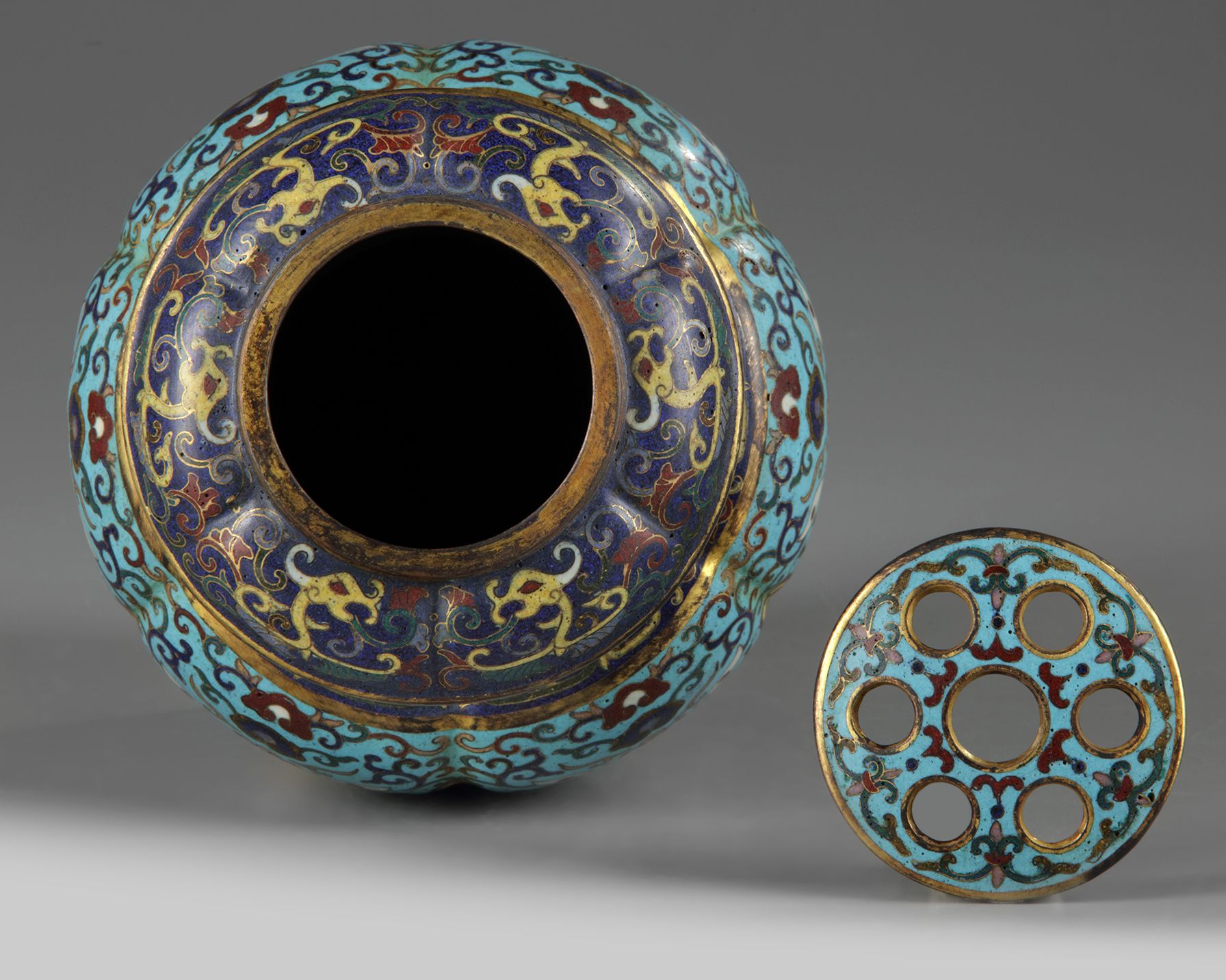 The lobed vase is decorated to the body with taotie masks amongst scrolls below a band of confronting kui dragons at the shoulder. The rim is decorated with a further band of dragons above a band of stiff leaves at the neck. The base is decorated with flower scrolls. The circular cover is pierced with evenly-spaced apertures imitating a lotus root.
