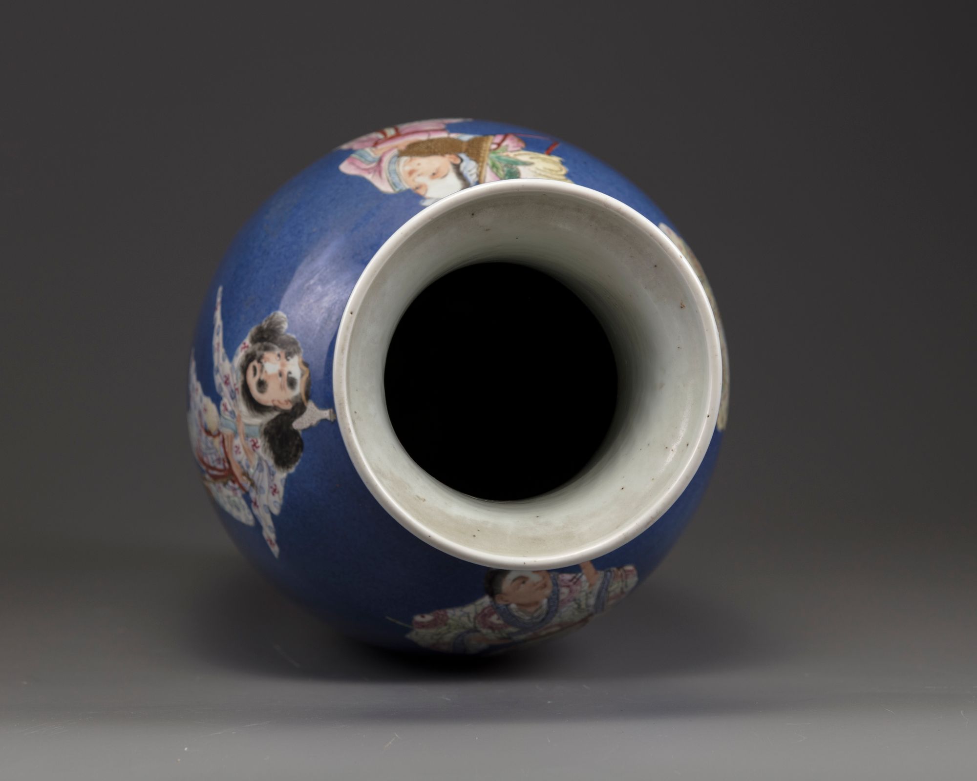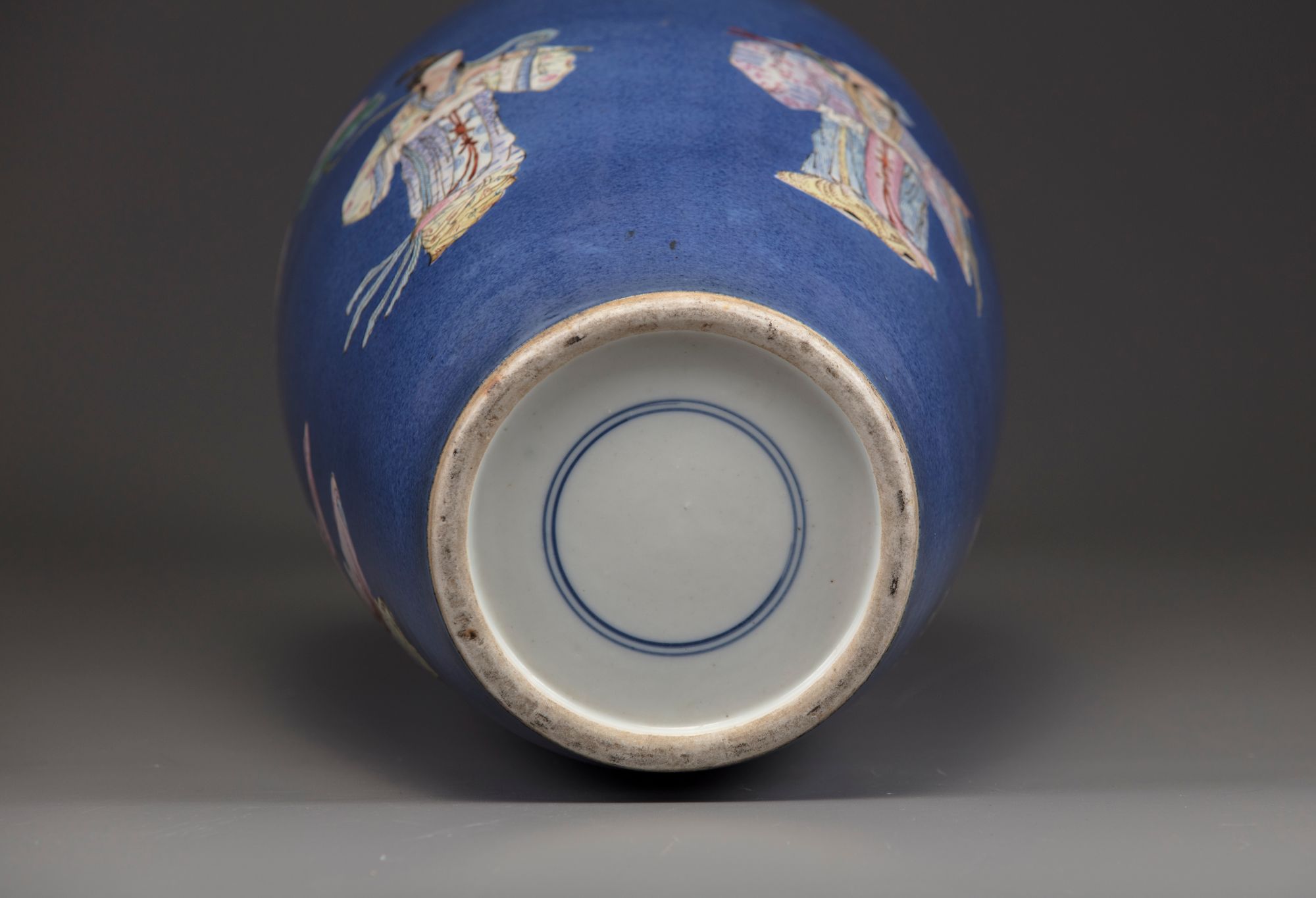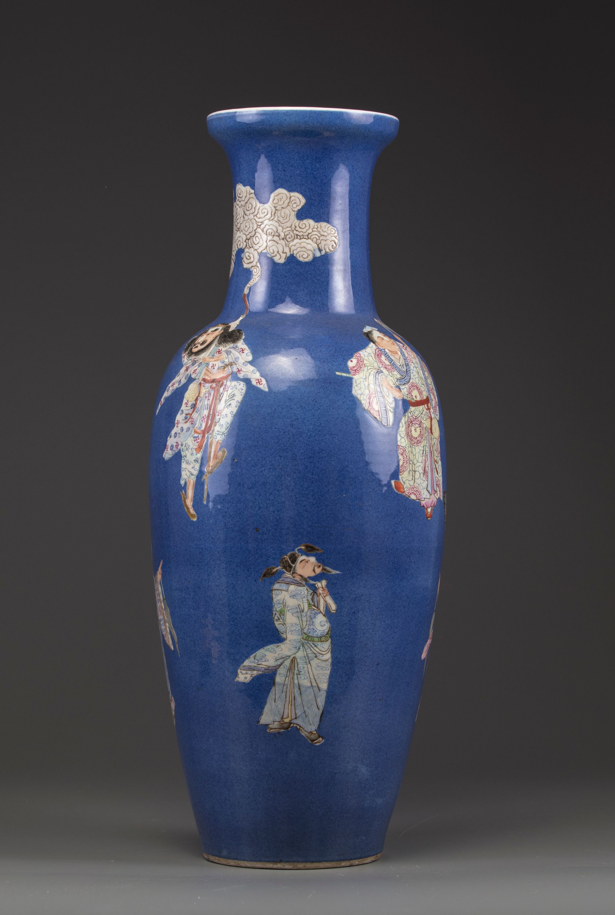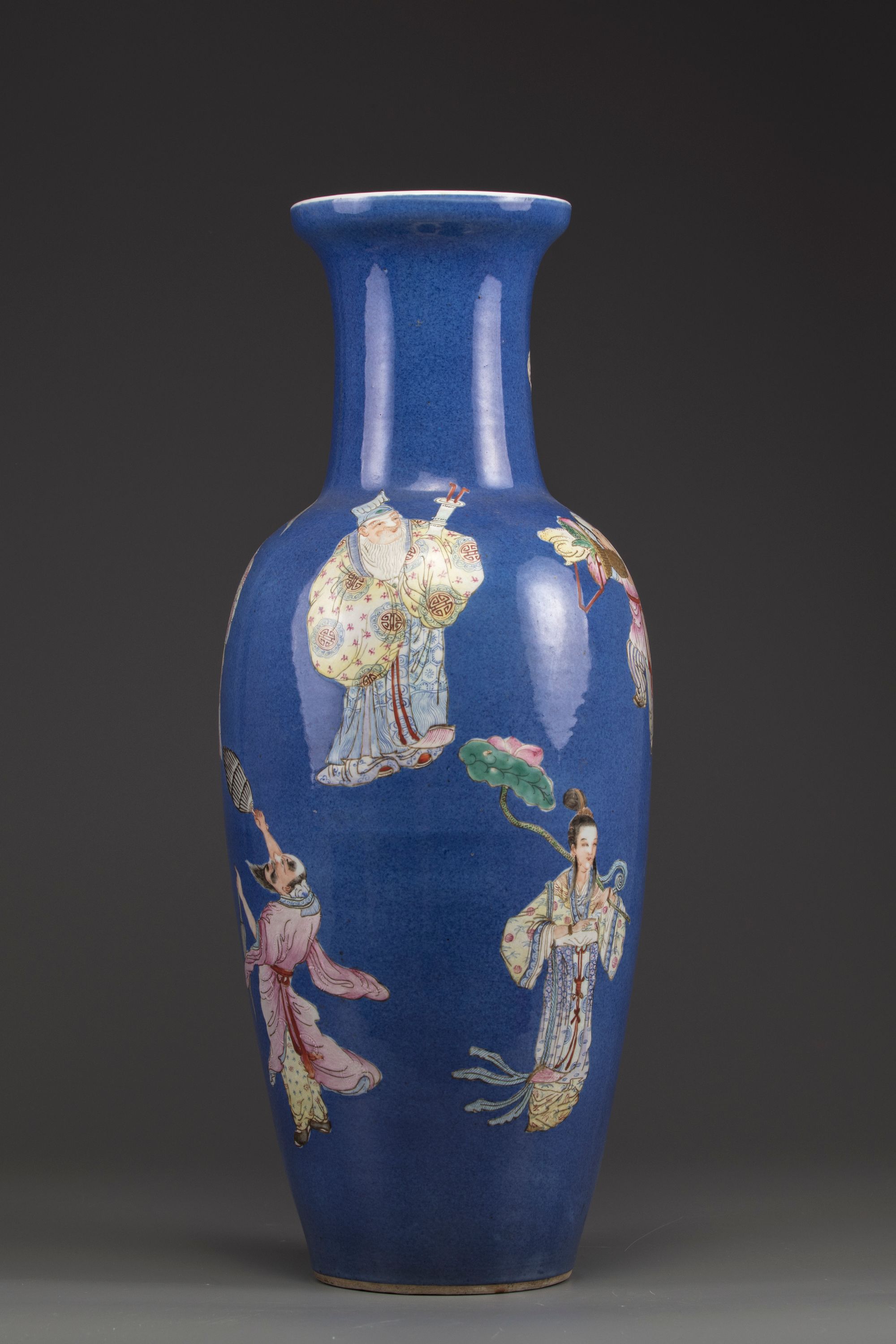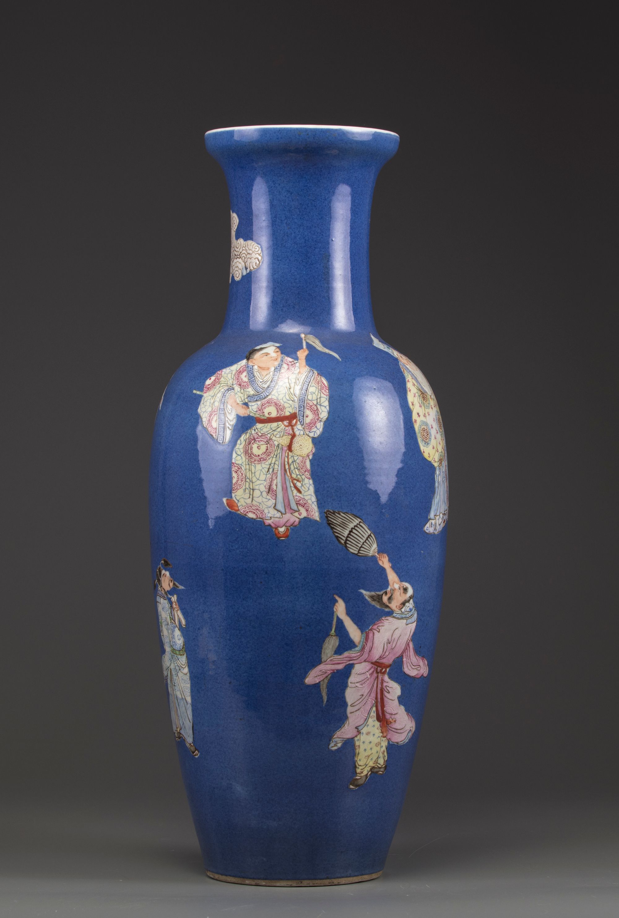 The vase is decorated in colourful enamels with the Eight Immortals each holding their respective attributes on a powder-blue ground. The base with a double circle in underglaze blue.