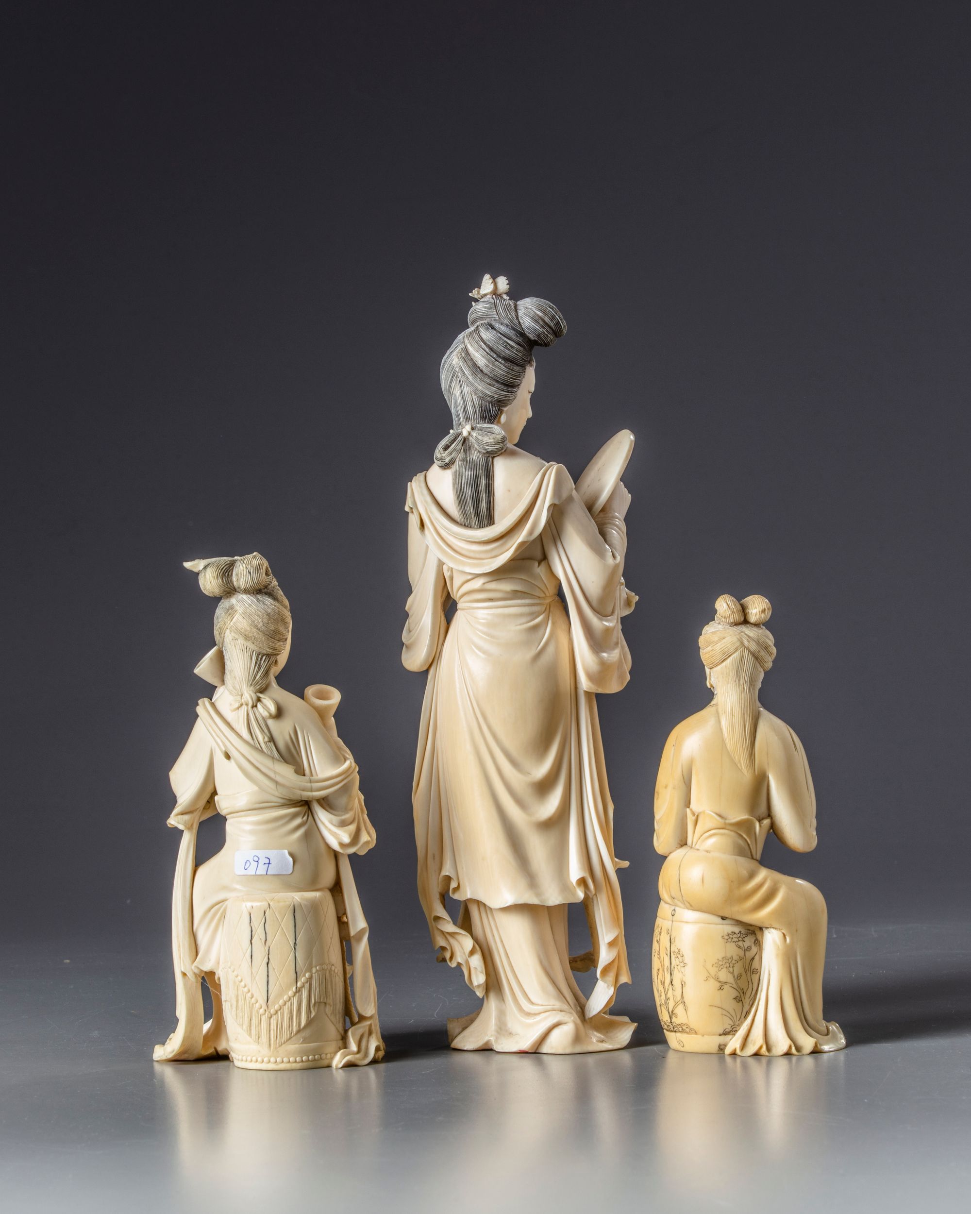 The group comprises: a seated lady holding two wine cups; a seated lady holding a pan flute; and a standing lady holding a mirror.