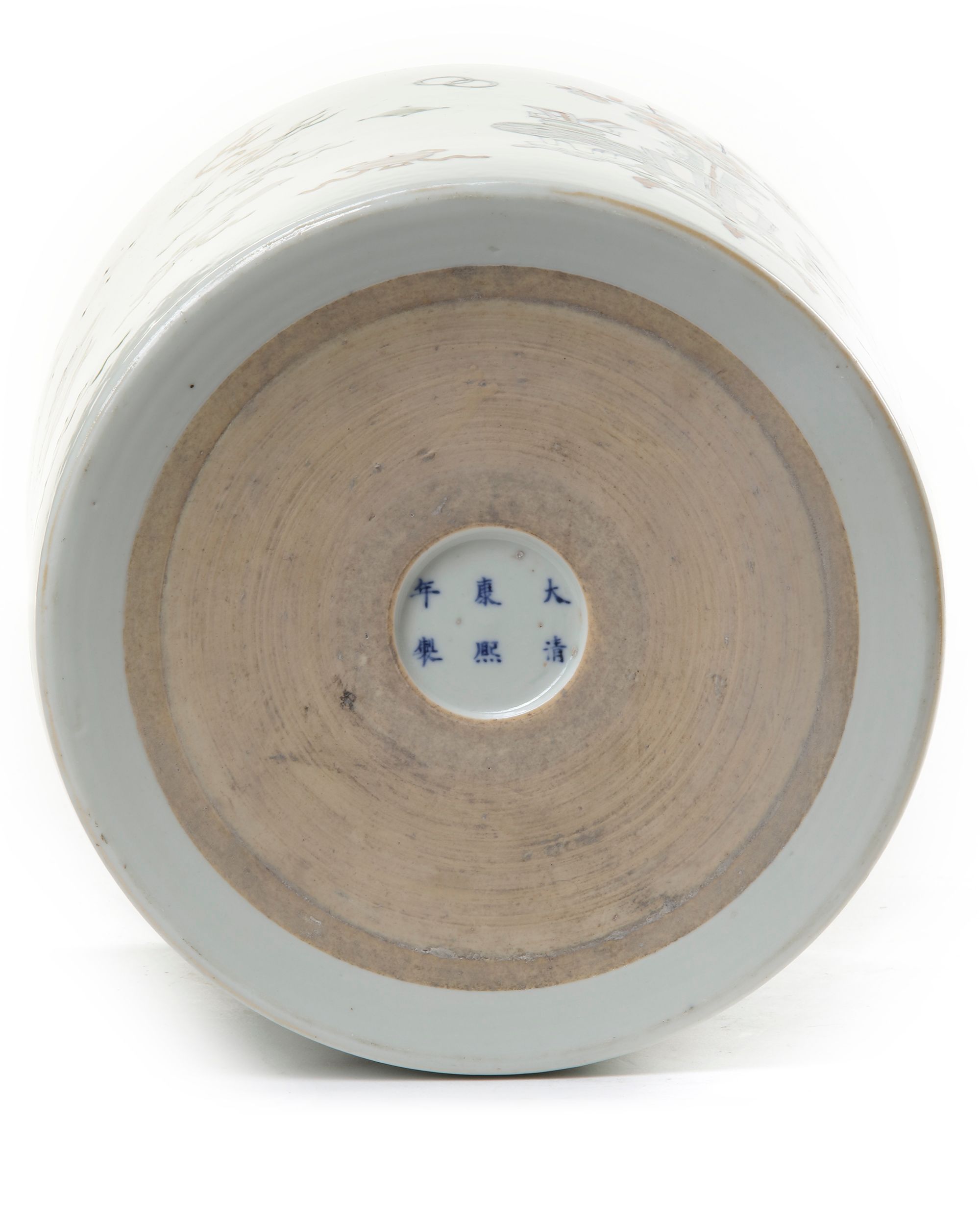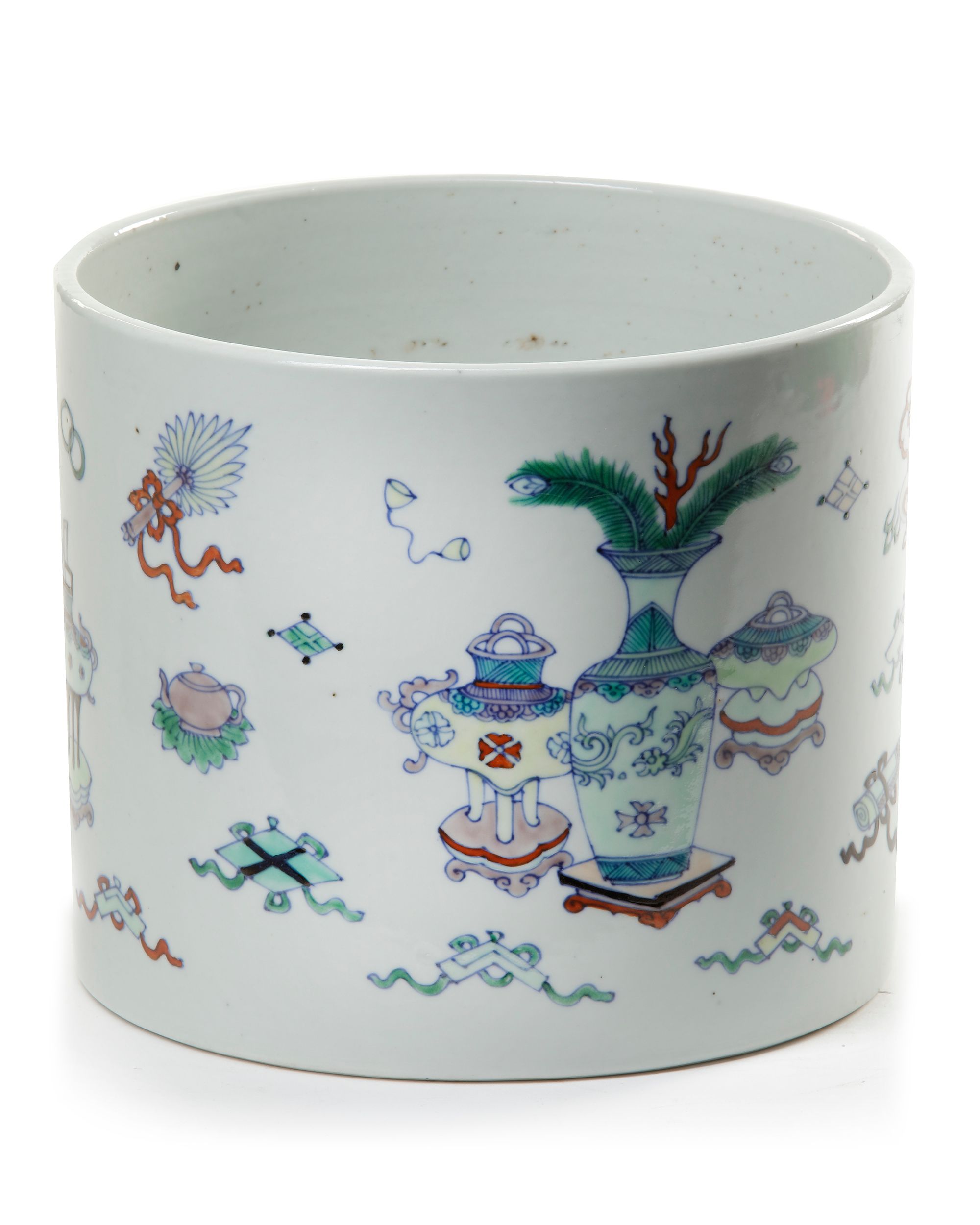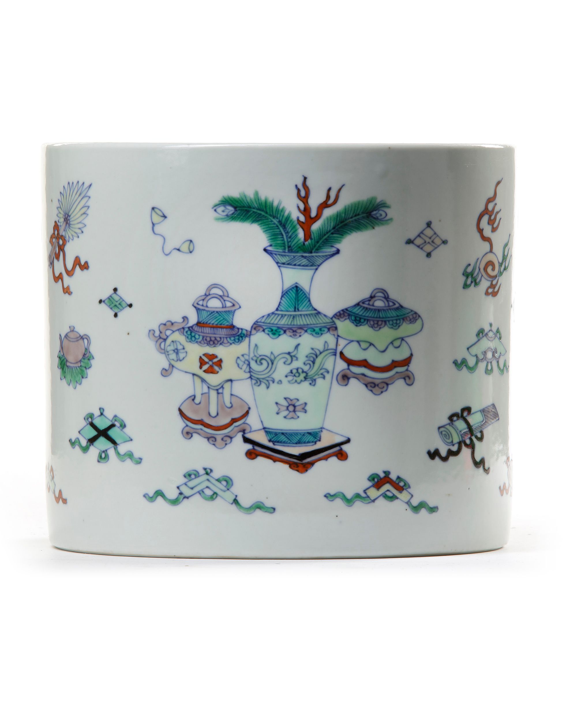 The porcelain brush pot is de orated to the exterior with three groups of censers and vases on stands, teapots and flaming pearls, and further with different objects of the Daoist eight emblems. The bottom with a Chinese Kangxi six character mark. 17 cm. height, 20 cm. diam.