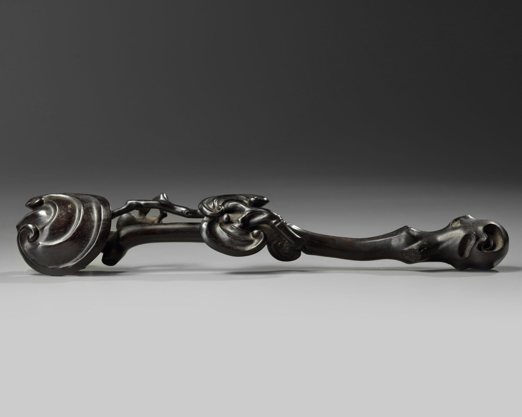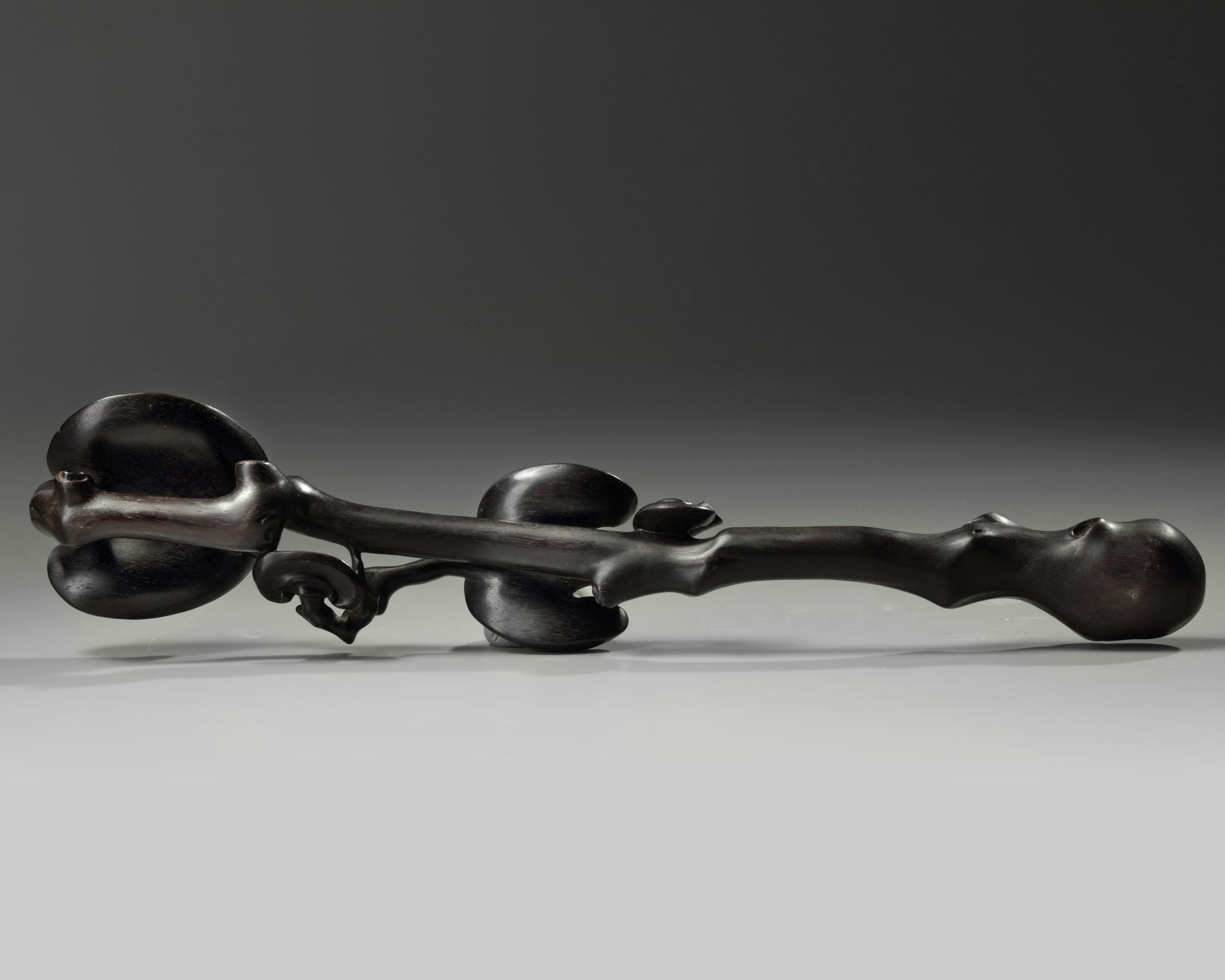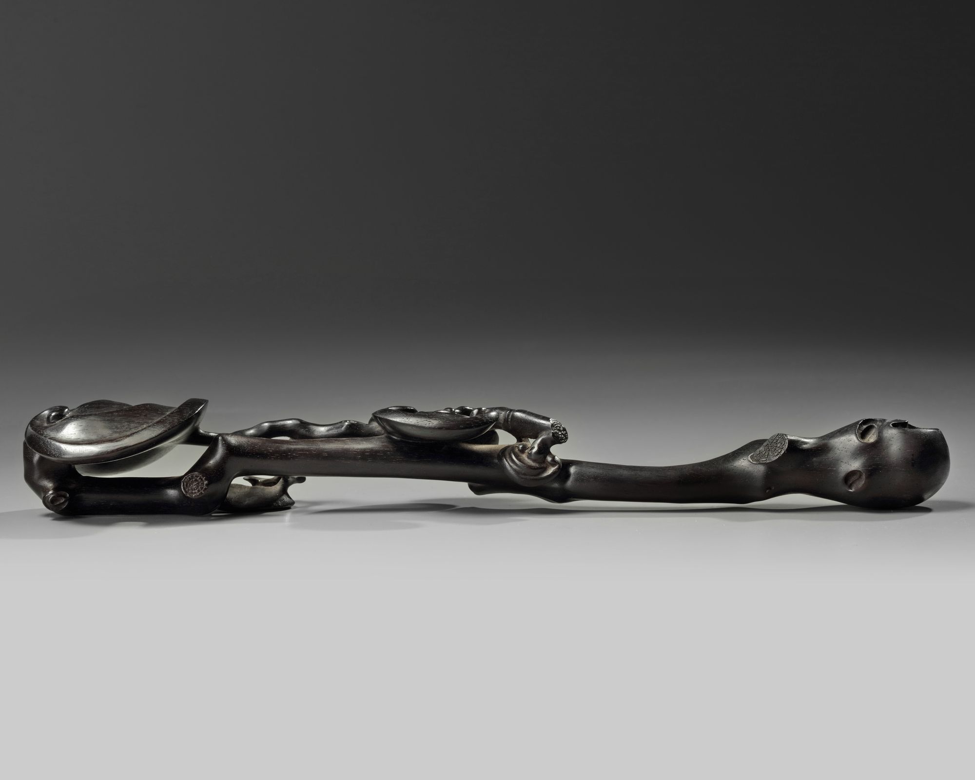 The sceptre is realistically carved and undercut as a lingzhi fungus growing from a gnarled stem with smaller lingzhi to the side. 31.2 by 6 cm.
