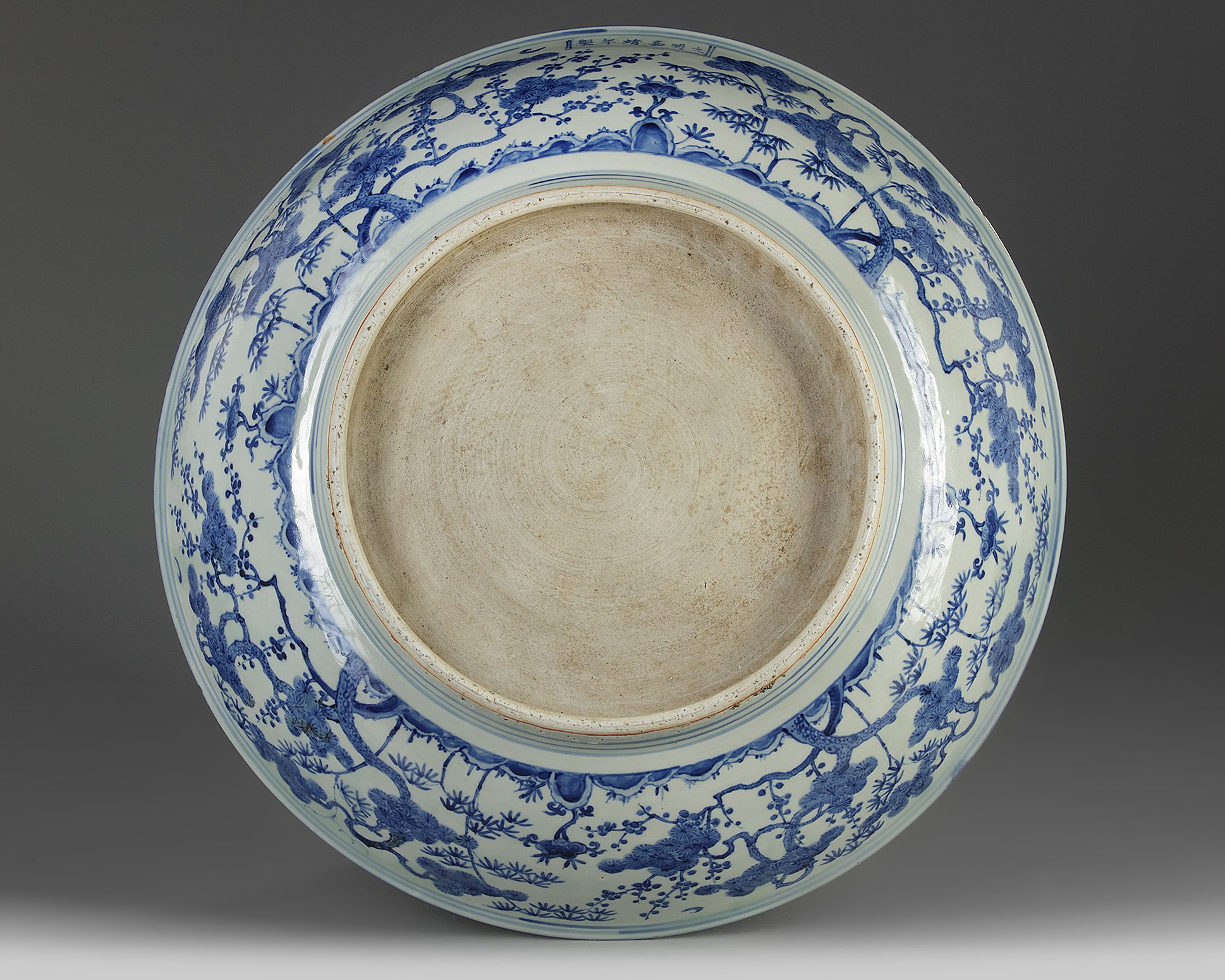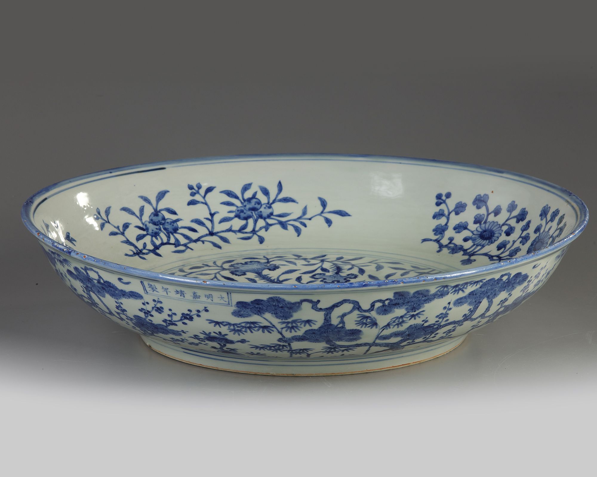 The interior is decorated with two leafy, scrolling stems bearing seven cockscomb flowers within line borders, all below peaches, chrysanthemum, pomegranate and peony sprays. The exterior is decorated with the 'The Three Friends,' pine, prunus and bamboo, with lingzhi and butterflies in between, there is a Jiajing mark written within a rectangular cartouche below the rim. 56.3 cm diameter.