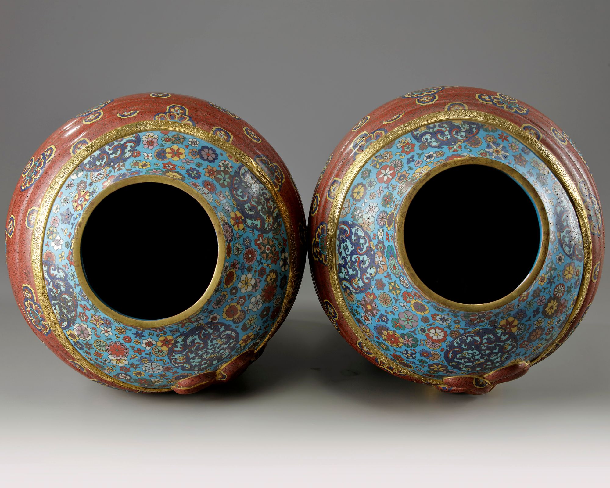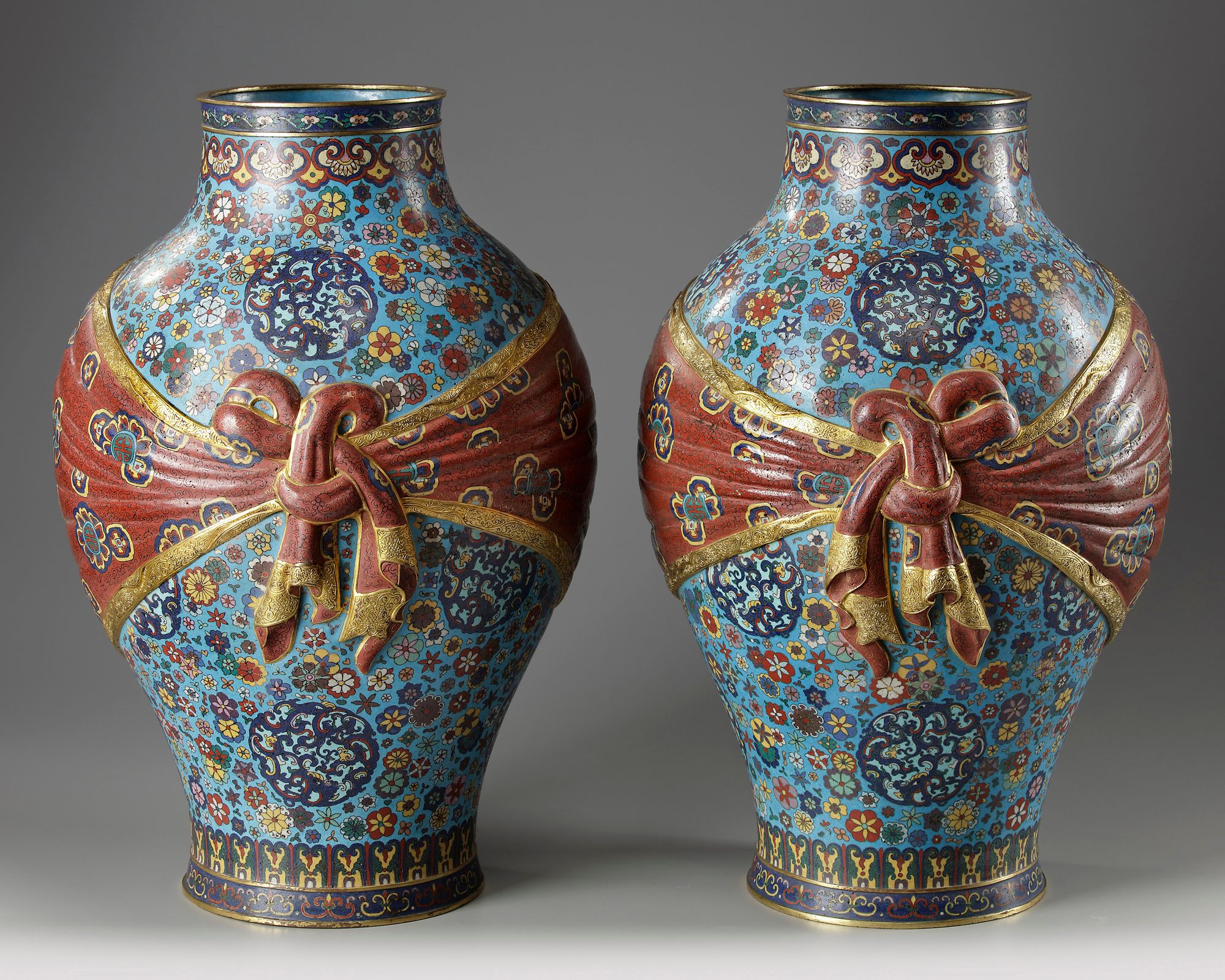 The baluster-form vase is decorated with a trompe l'oeil gilt bronze and red-enamelled sash tied in an elaborate knot to the front. The ground is decorated with kui-dragon roundels amongst scattered blooms, all below a ruyi-head band to the neck and lappets to the foot. The interior is glazed turquoise and the base is decorated with a prunus on cracked ice design.