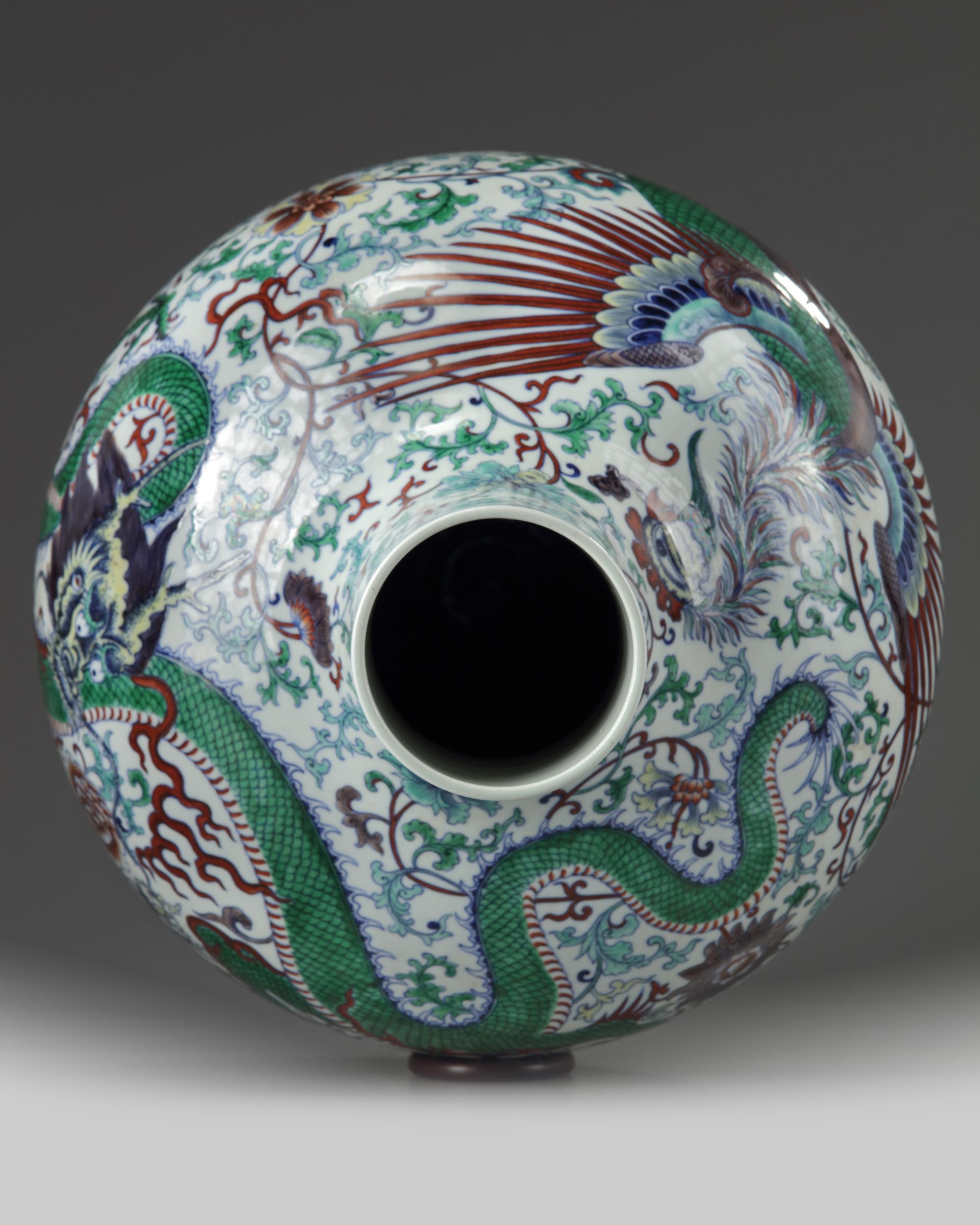 The vase is decorated with a dragon and a phoenix amongst scrolling flowers and foliage all below a ruyi-head band and a wave band to the foot. The base is marked with an apocryphal Yongzheng mark.