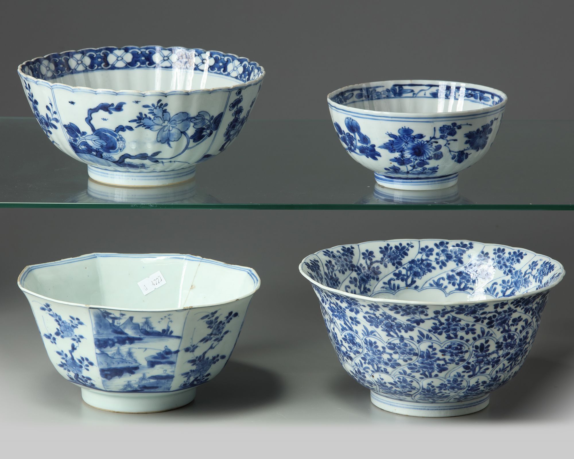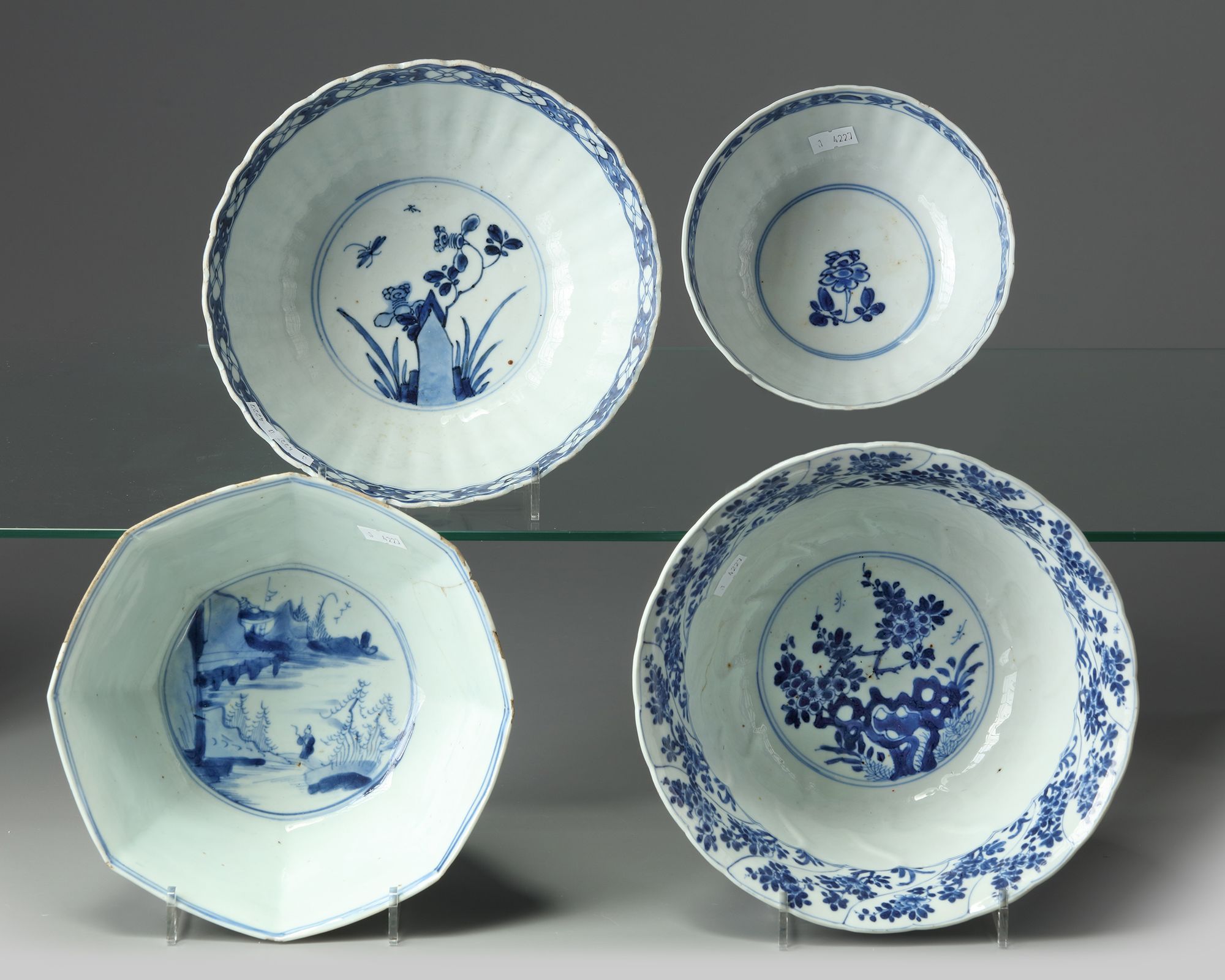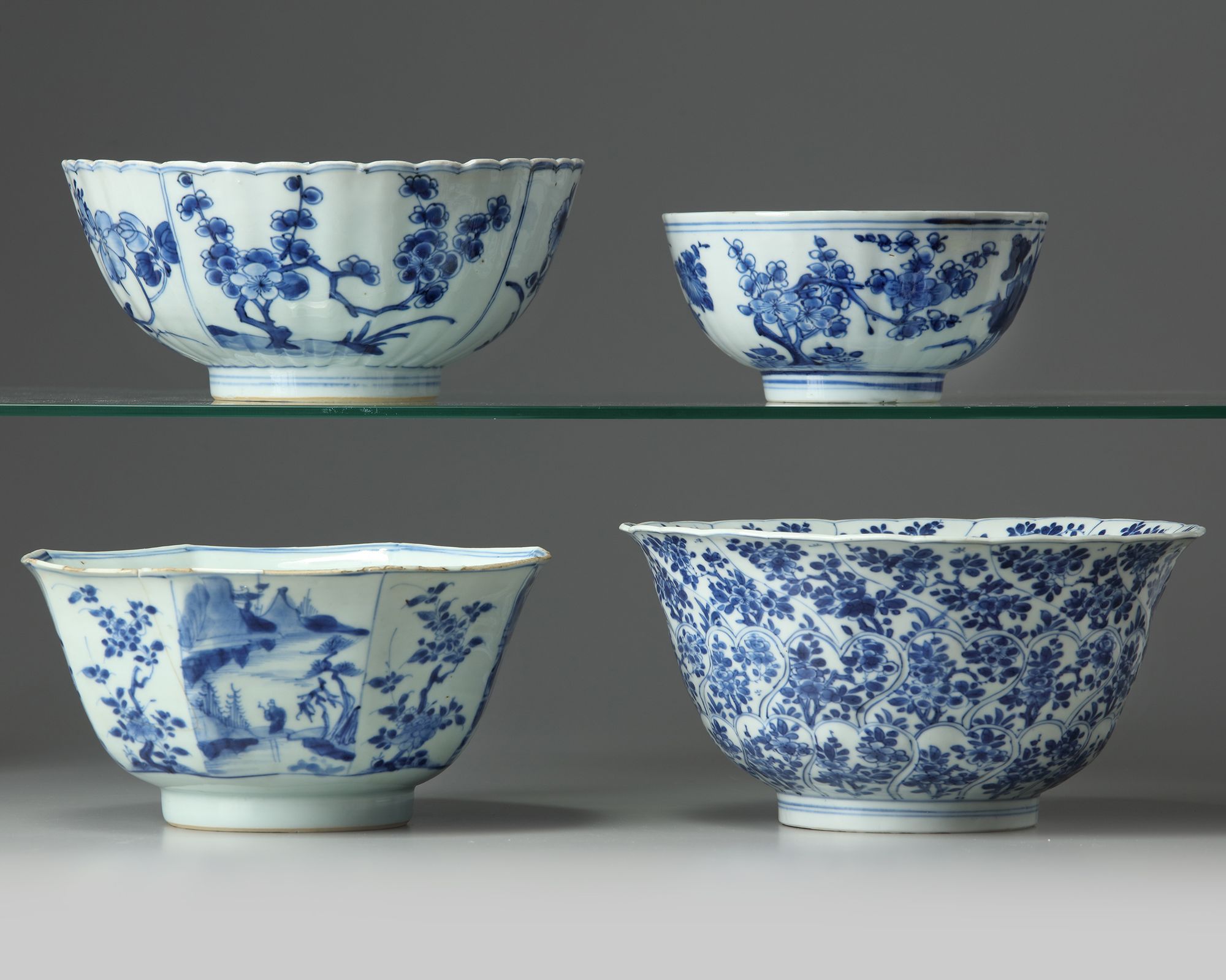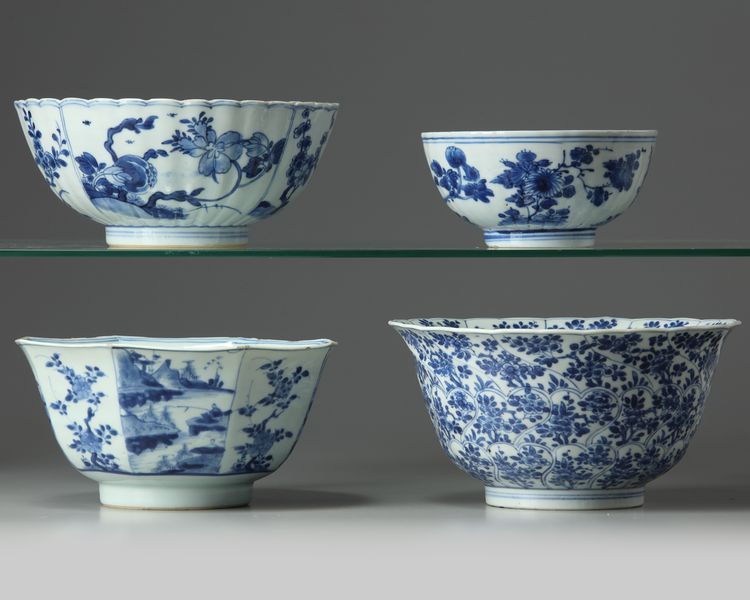 The group comprises: a moulded petal-shaped floral bowl; a foliate bowl decorated with floral panels; a floral bowl; and an octogonal bowl decorated with alternating scholar landscape and floral panels.