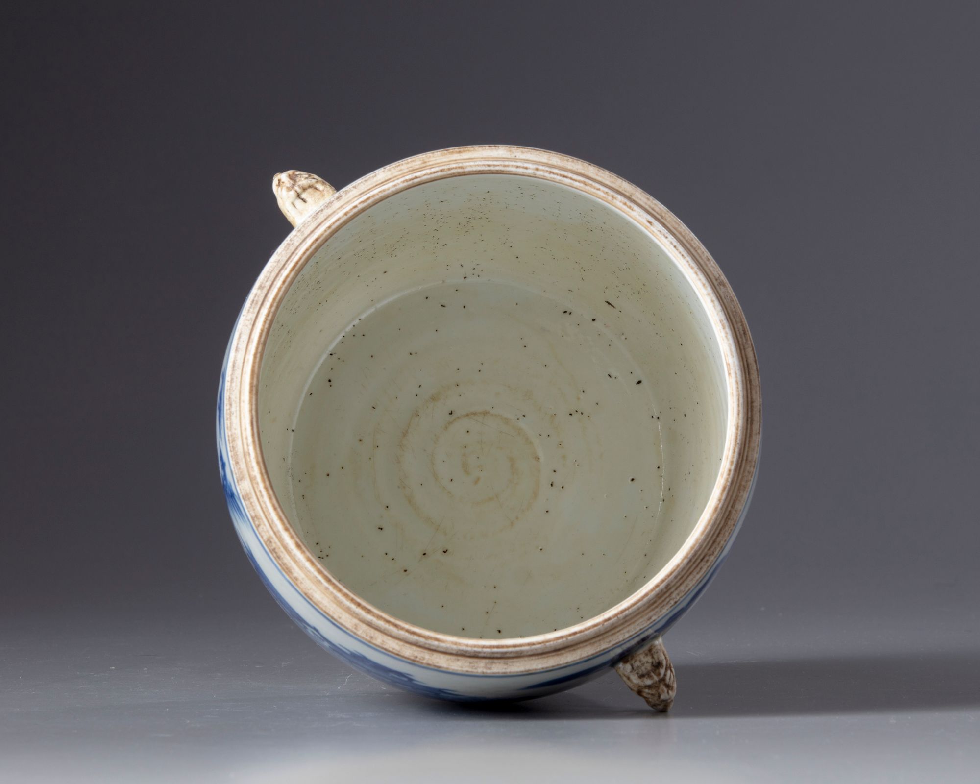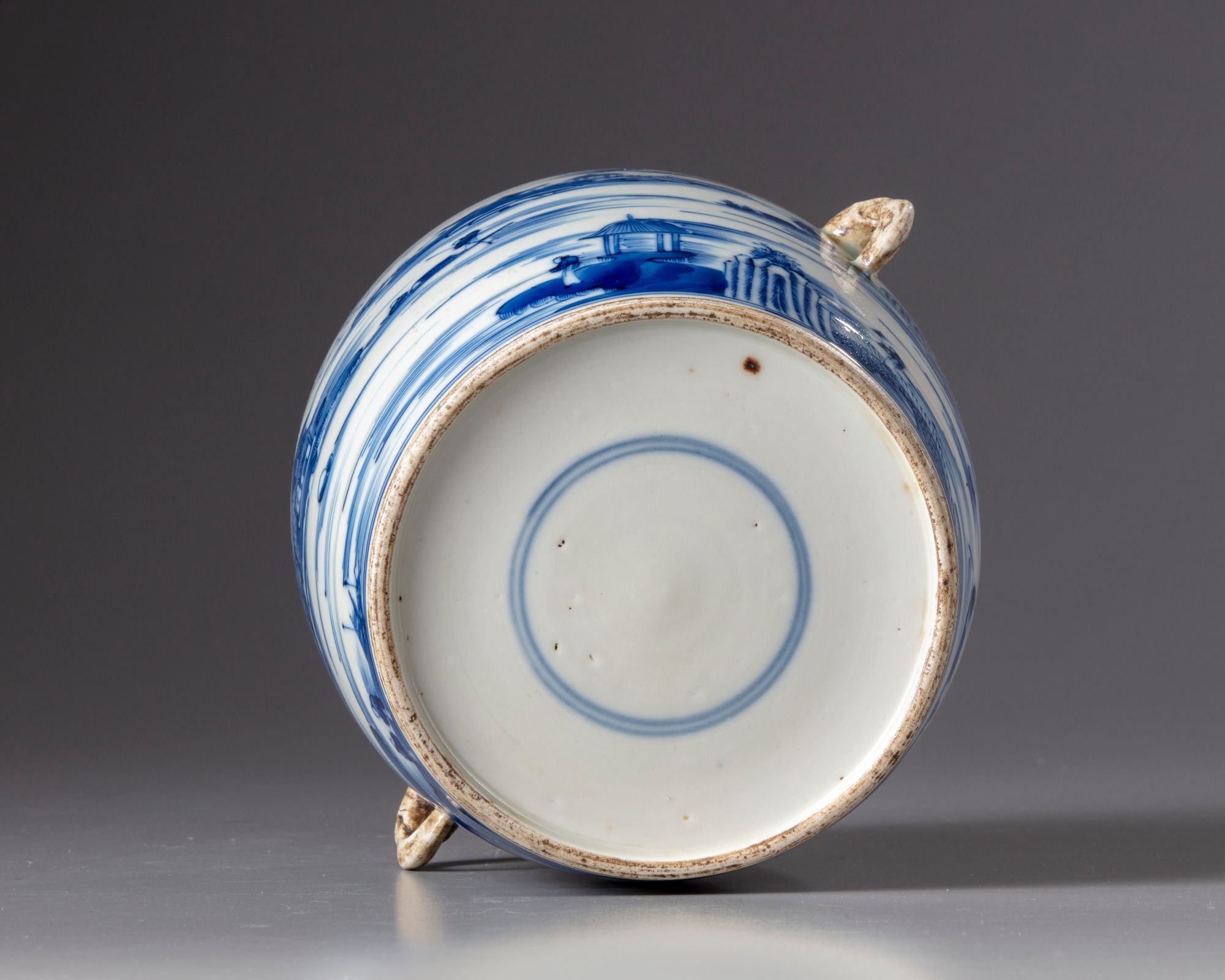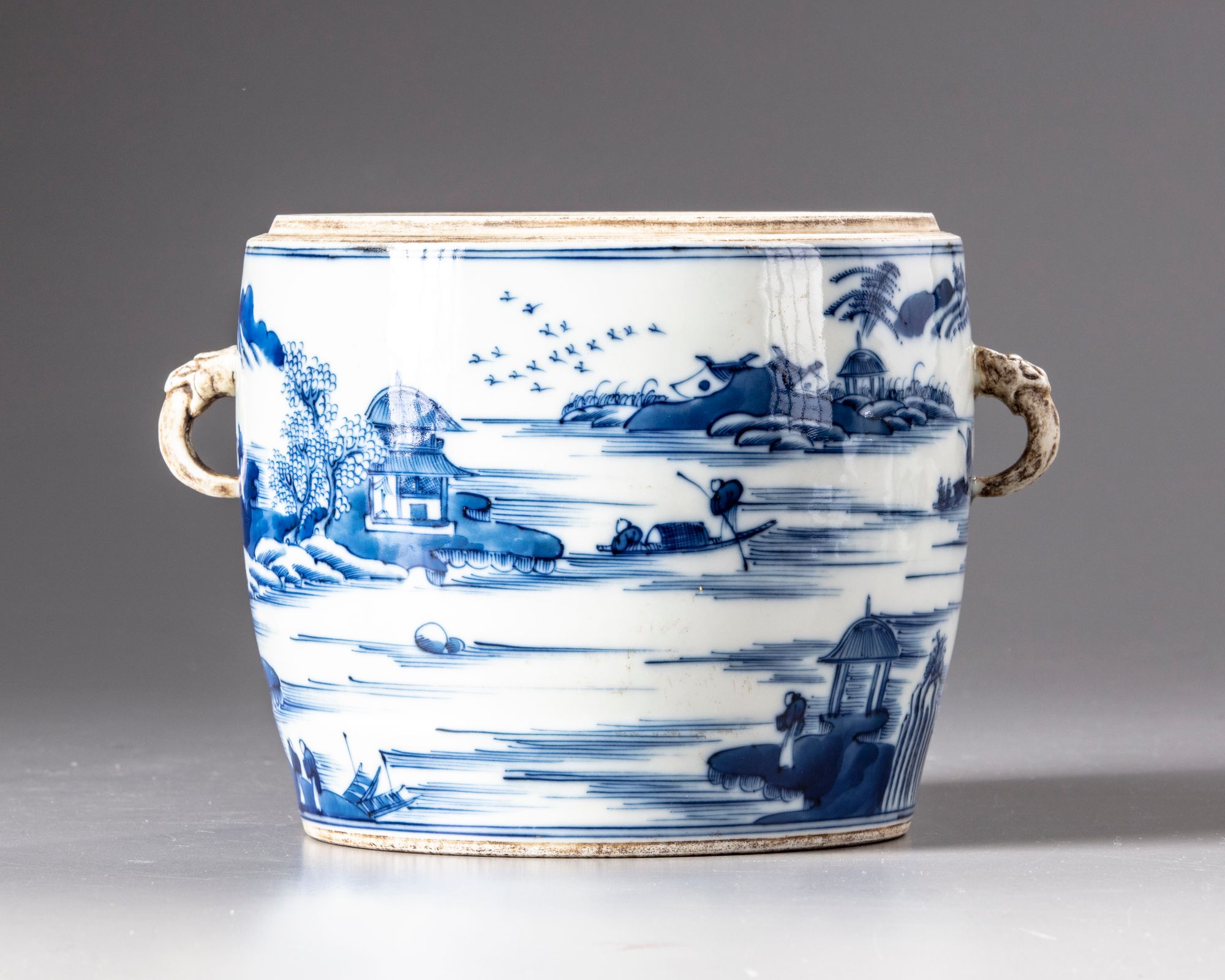 The pot is stylised with two beast shaped handles, decorated in underglaze blue with figures on sampan in a lake landscape.