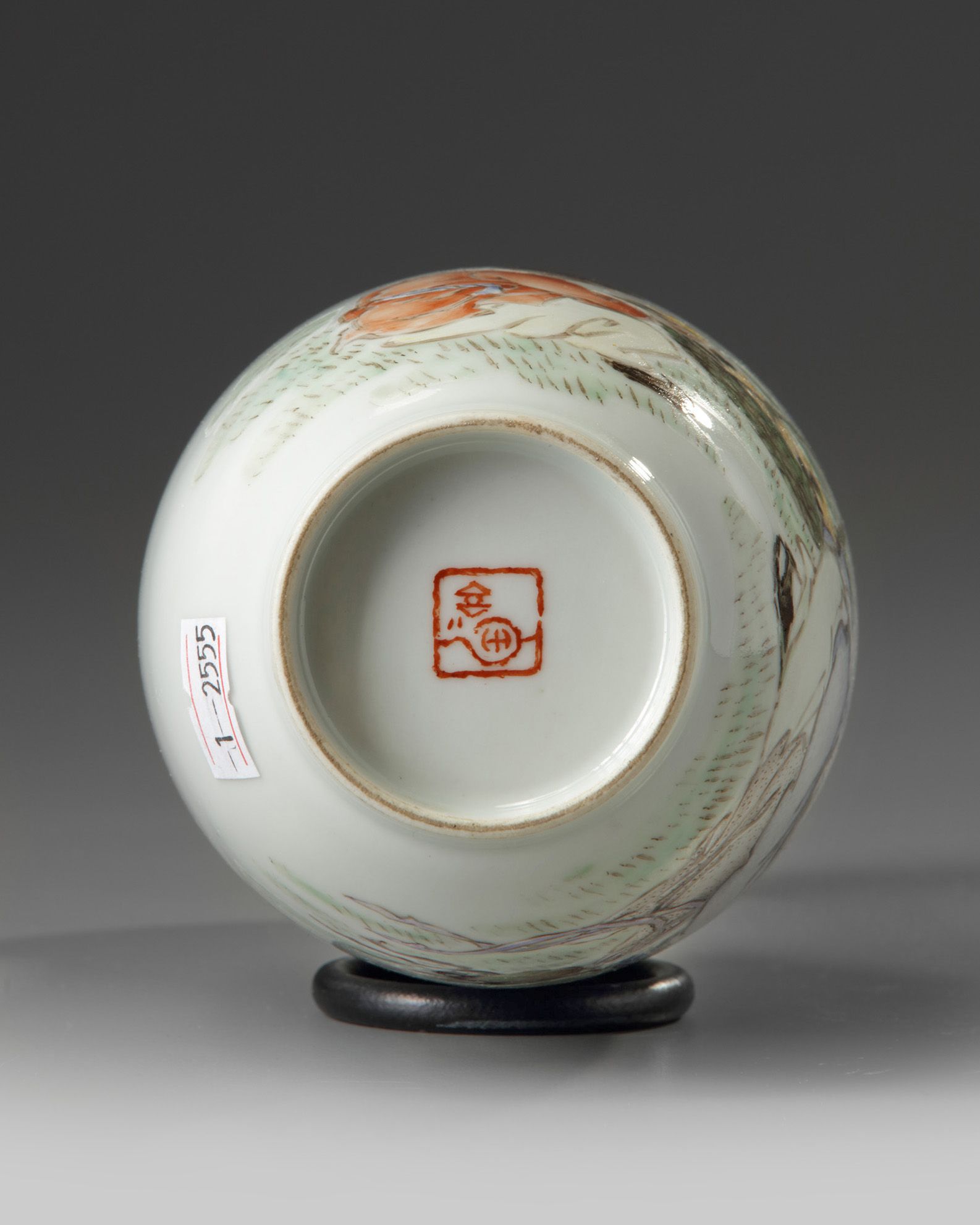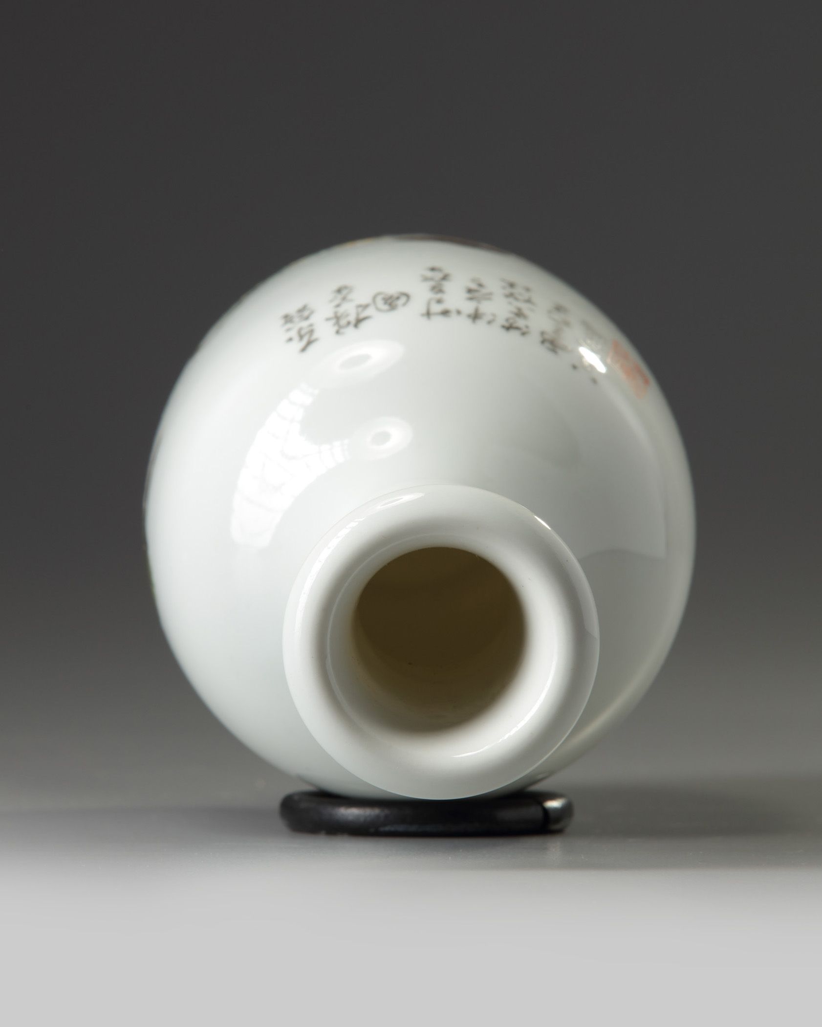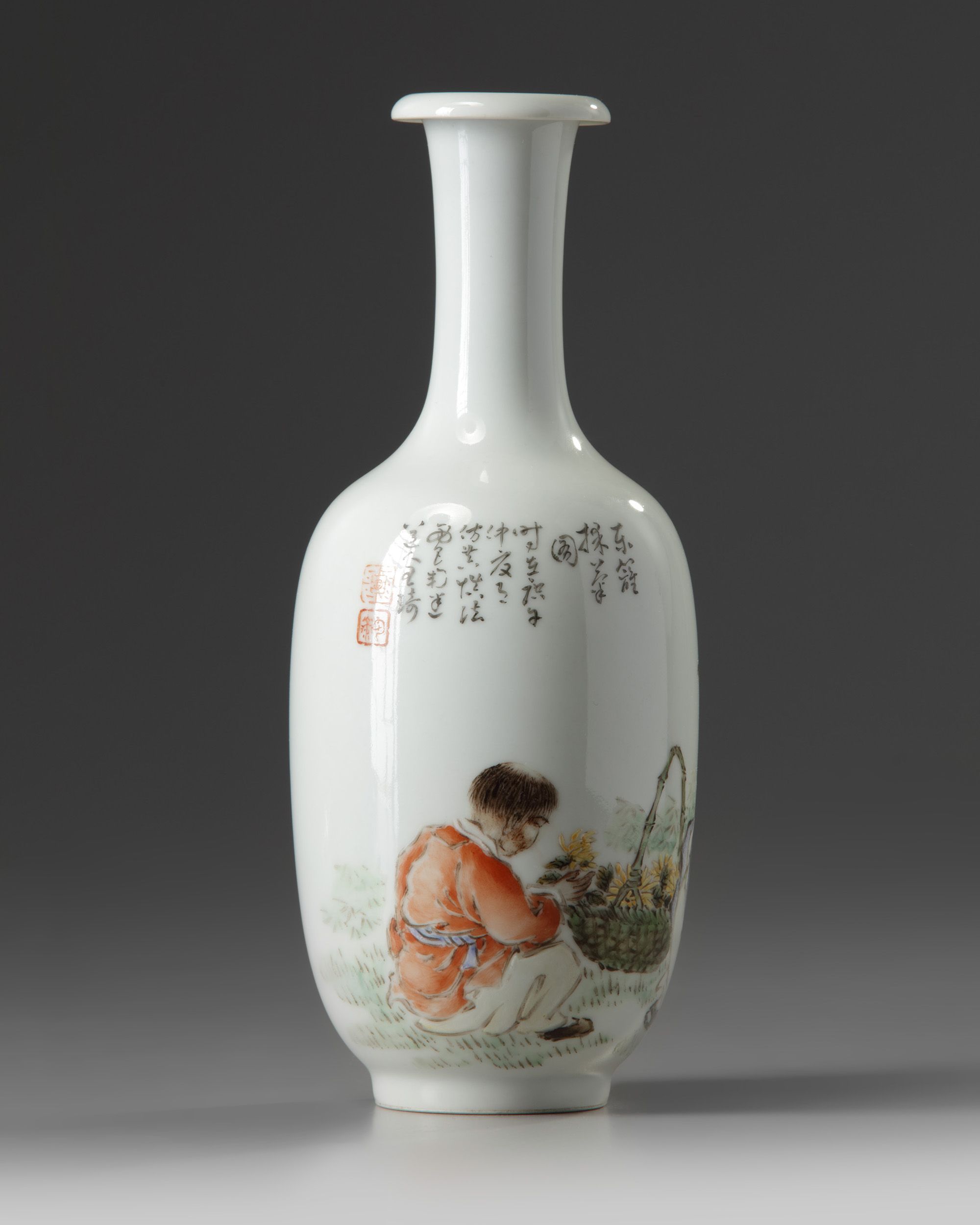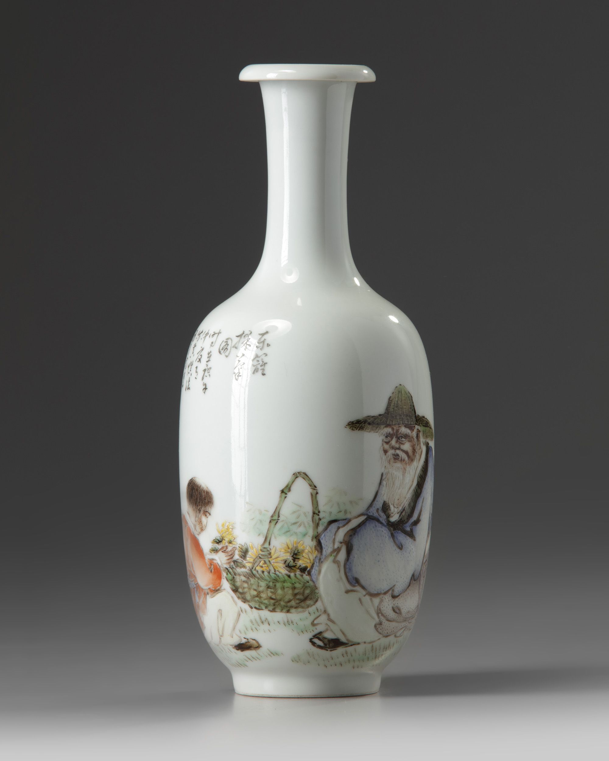 The vase is with a long neck and decorated with an elderly figure and boy seated with a basket full of flowers, entitled and inscribed with the signature of Wang Qi.