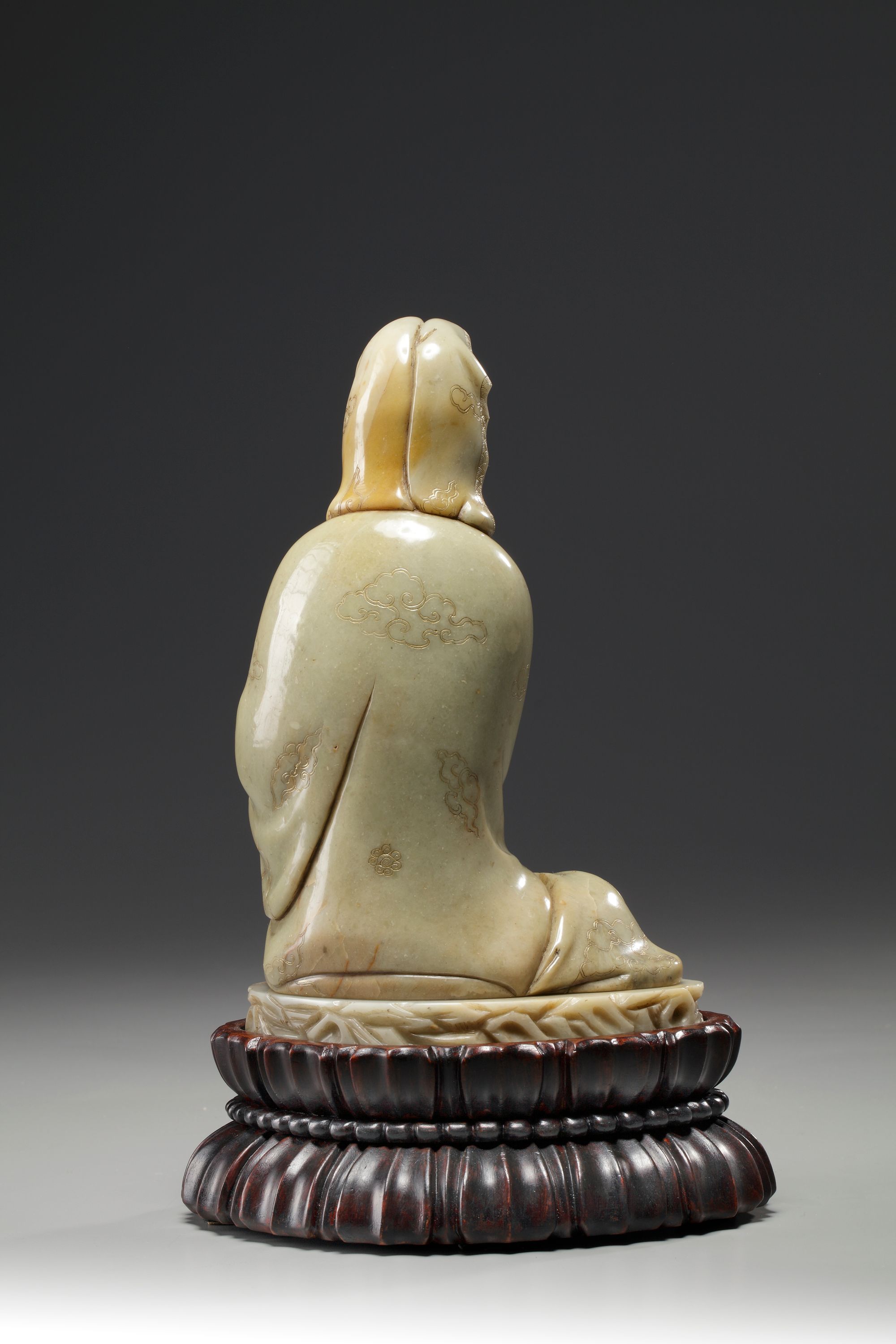 Seated on a base with wooden stand; the robe finely decorated with gilt decorated floral roundels and clouds; the rim of the robe decorated with waves.