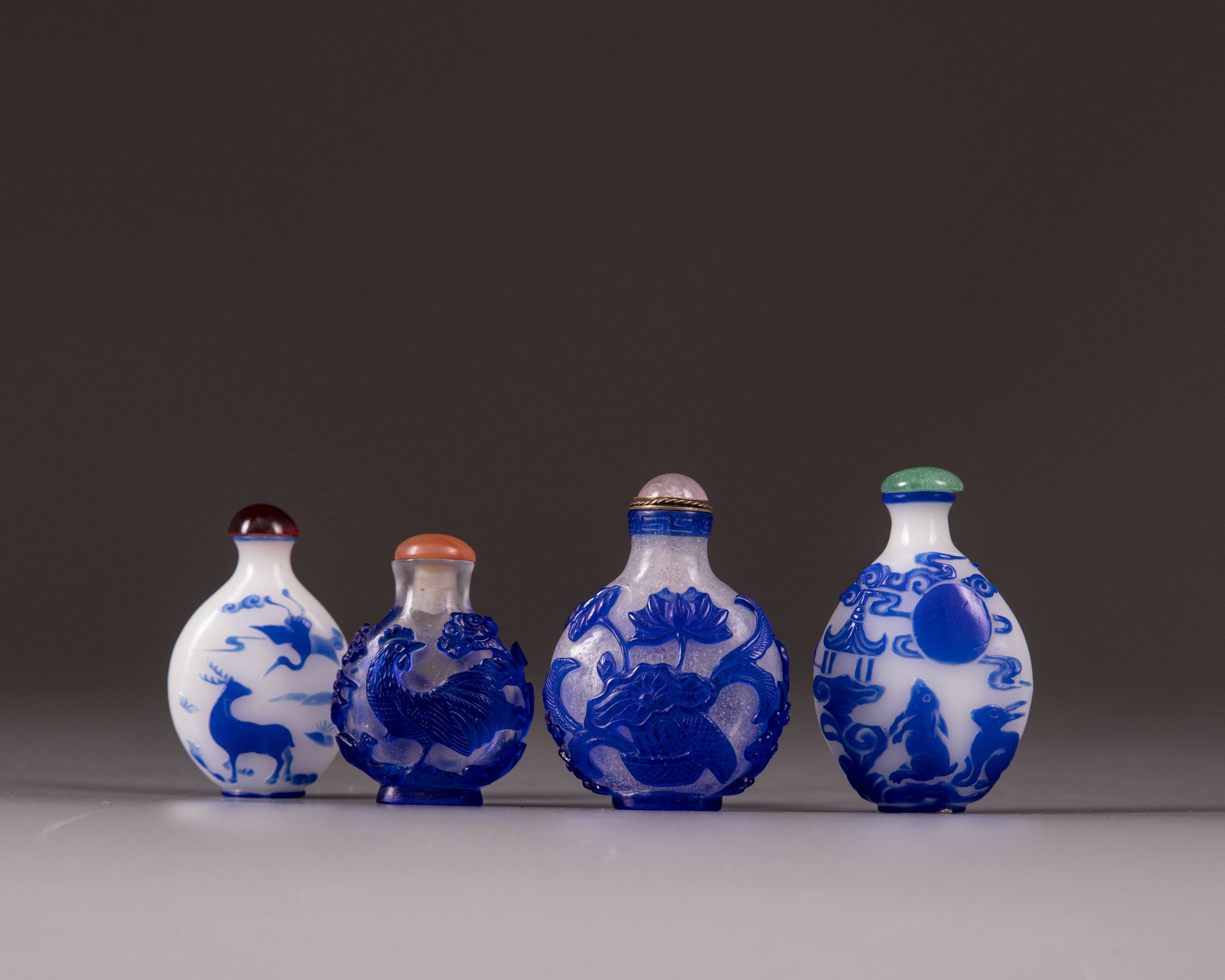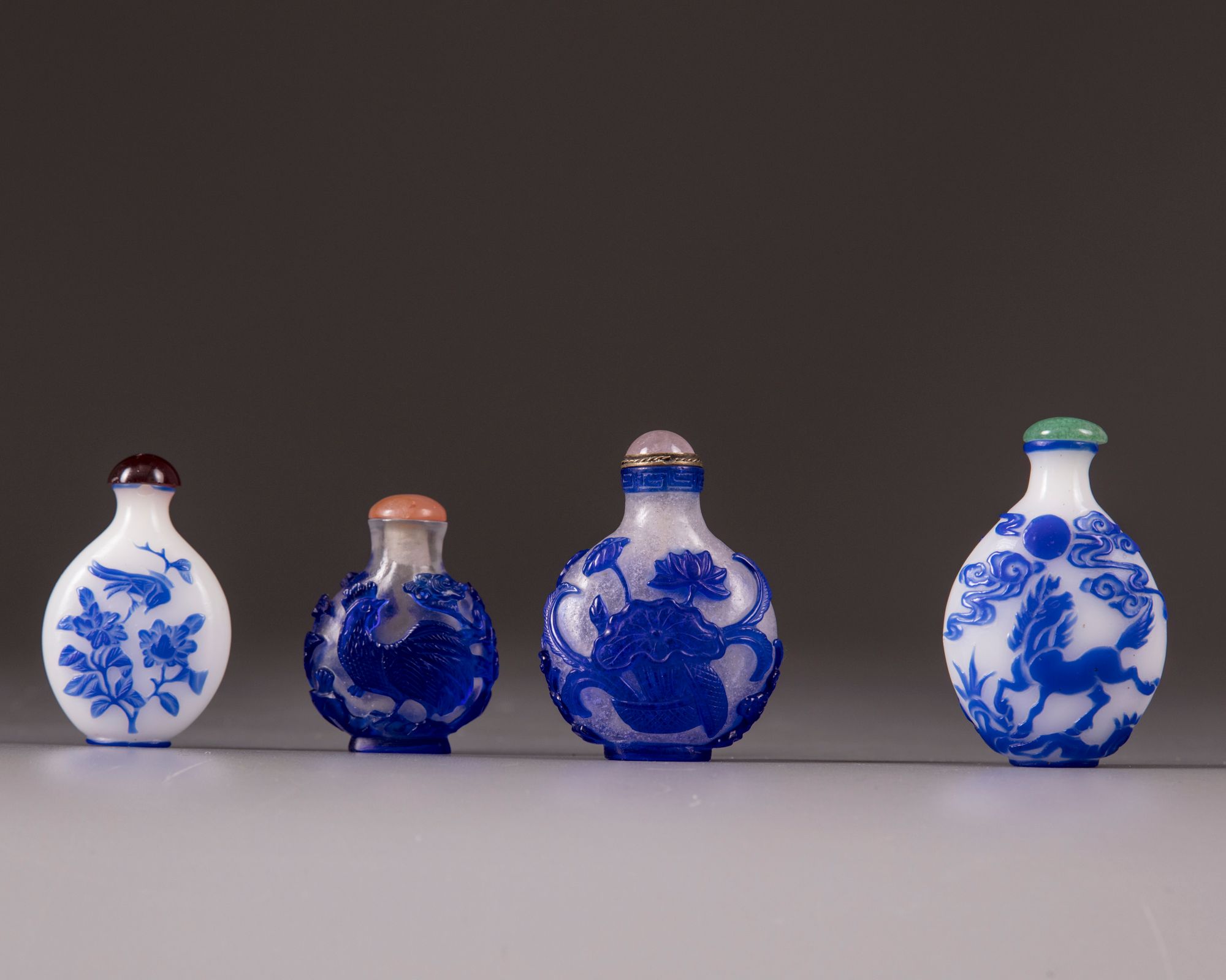 The snuff bottles are carved through the blue overlay with various kinds of animals; a rooster, a dear, an egret and a horse.