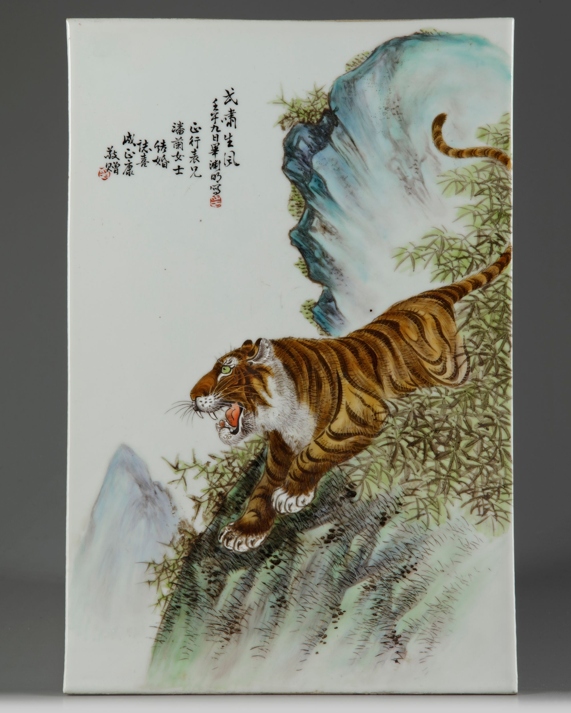 The plaque is decorated with a tiger on a rock's edge. The scene is entitled 'yi xiao sheng feng', signed Bi Yuanming, dated renwu year, and dedicated.