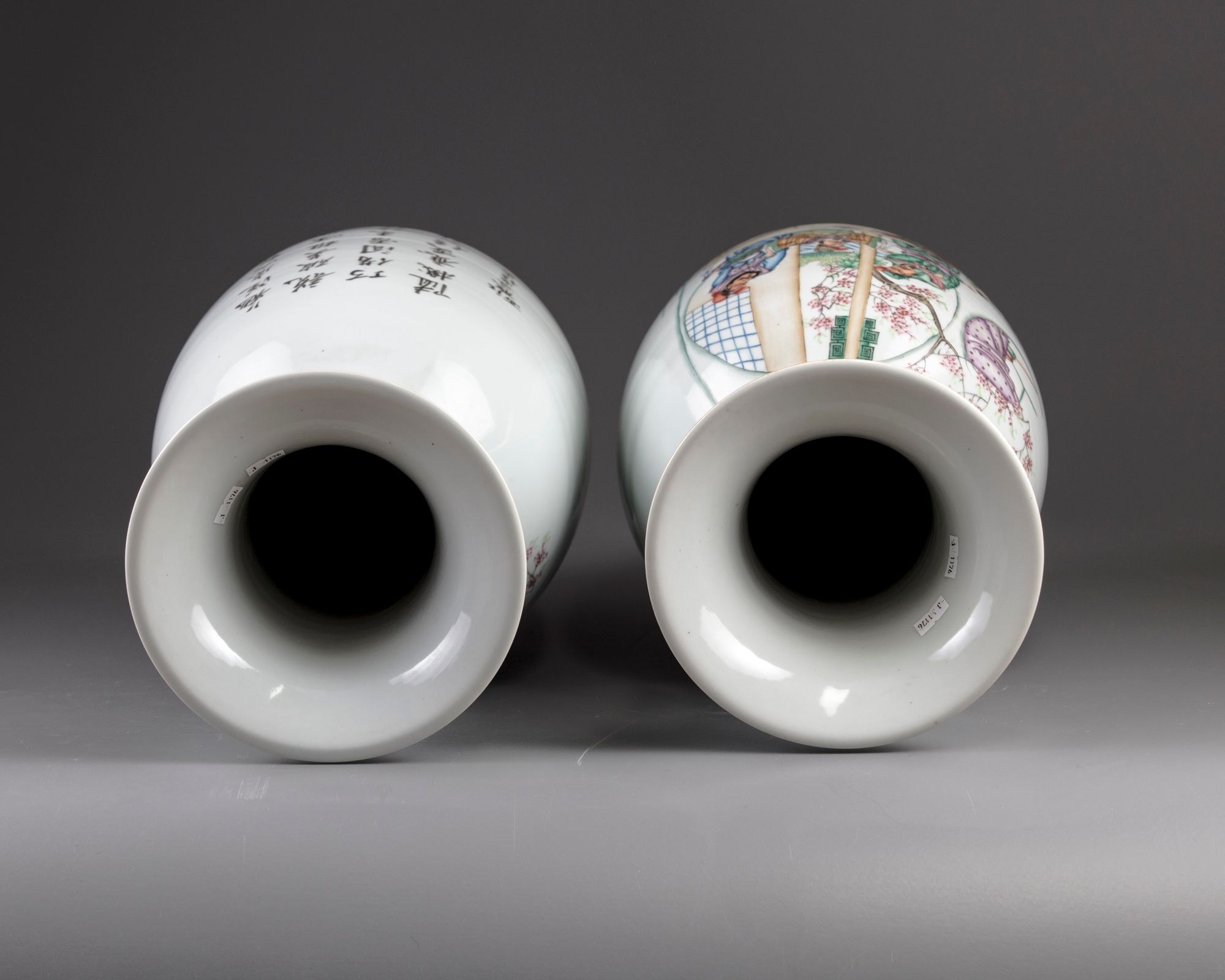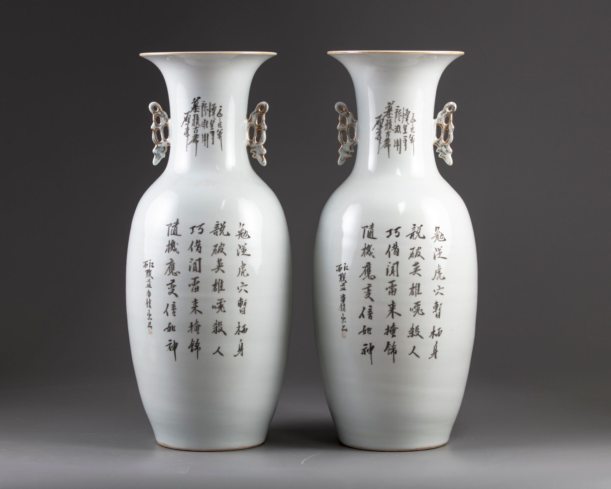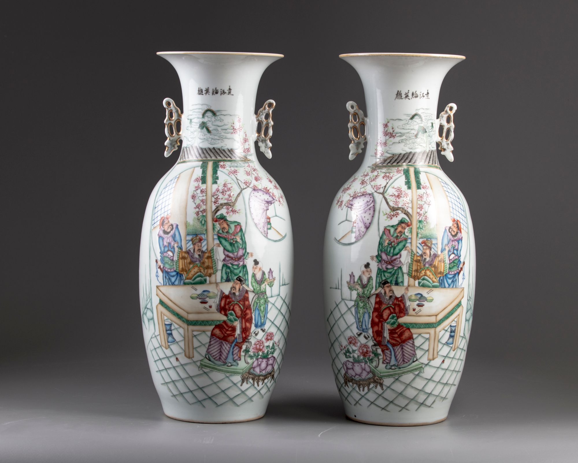 The vases are decorated on the frontside with colorful officials and attendants around a table, the reverse is decorated with a calligraphic inscription.