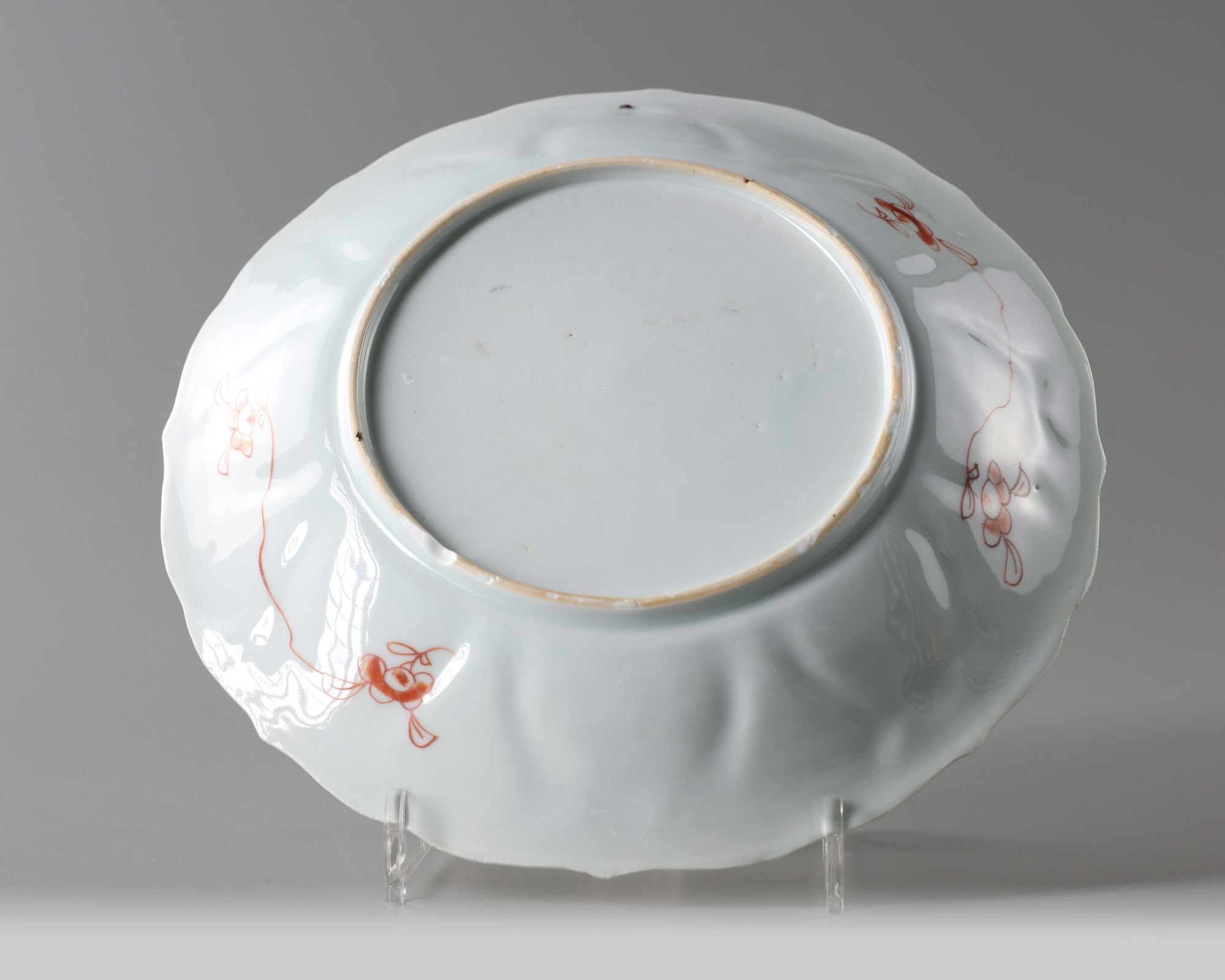 The dish is decorated to the centre with a scene of a lady waving goodbye to a scholar in a sampan surrounded by moulded tulip-shaped panels enclosing flowers, all interspersed by further flowers. The reverse with two flower sprays.
