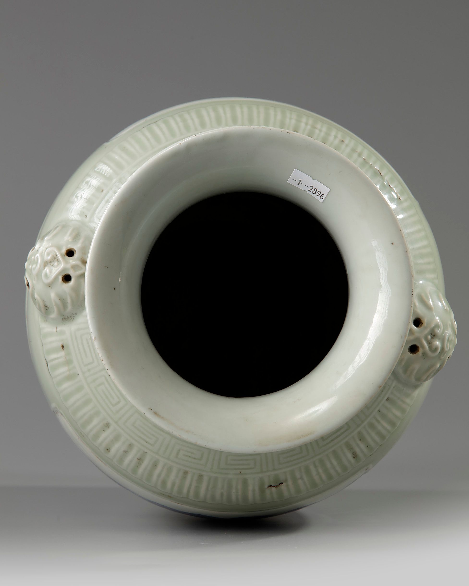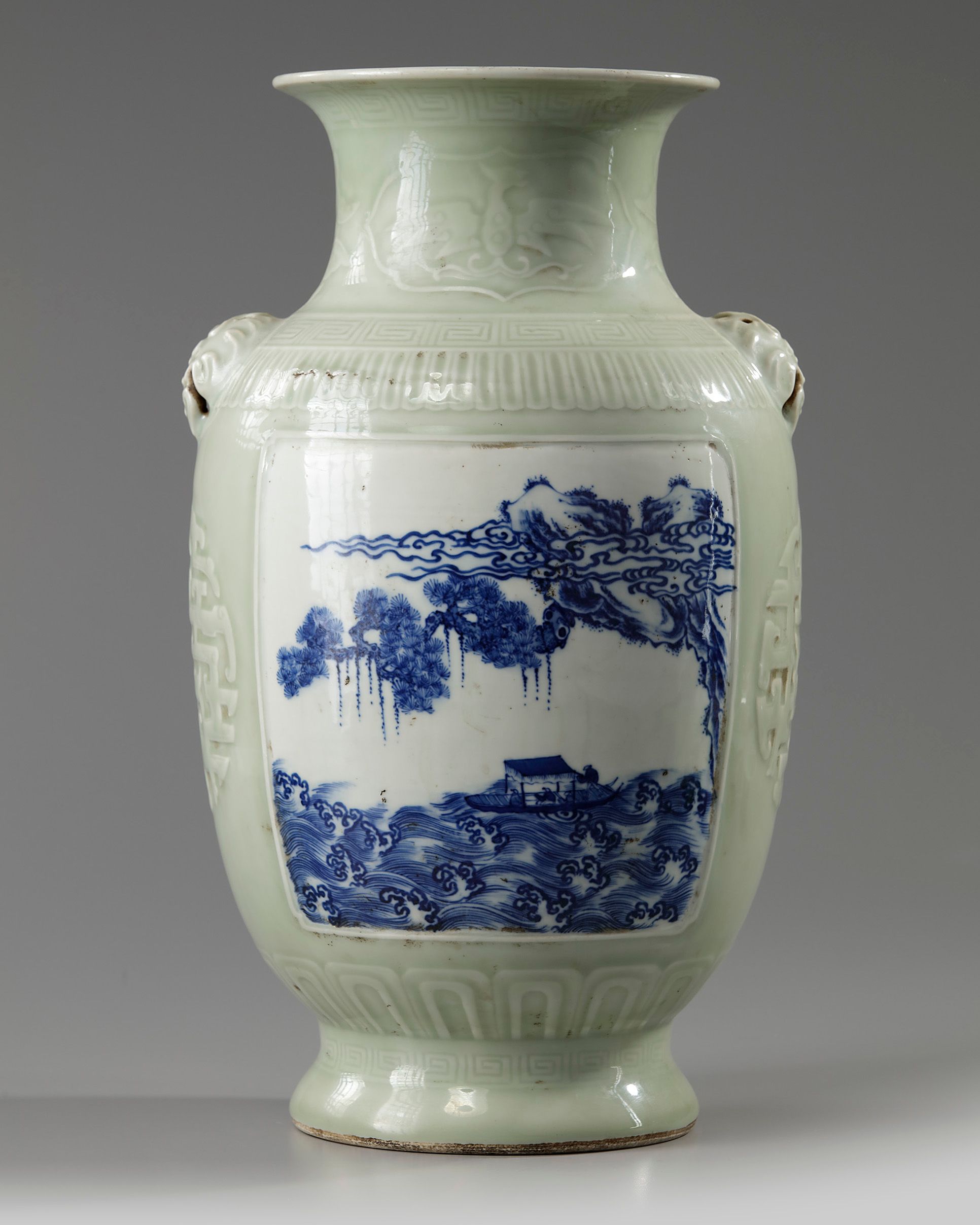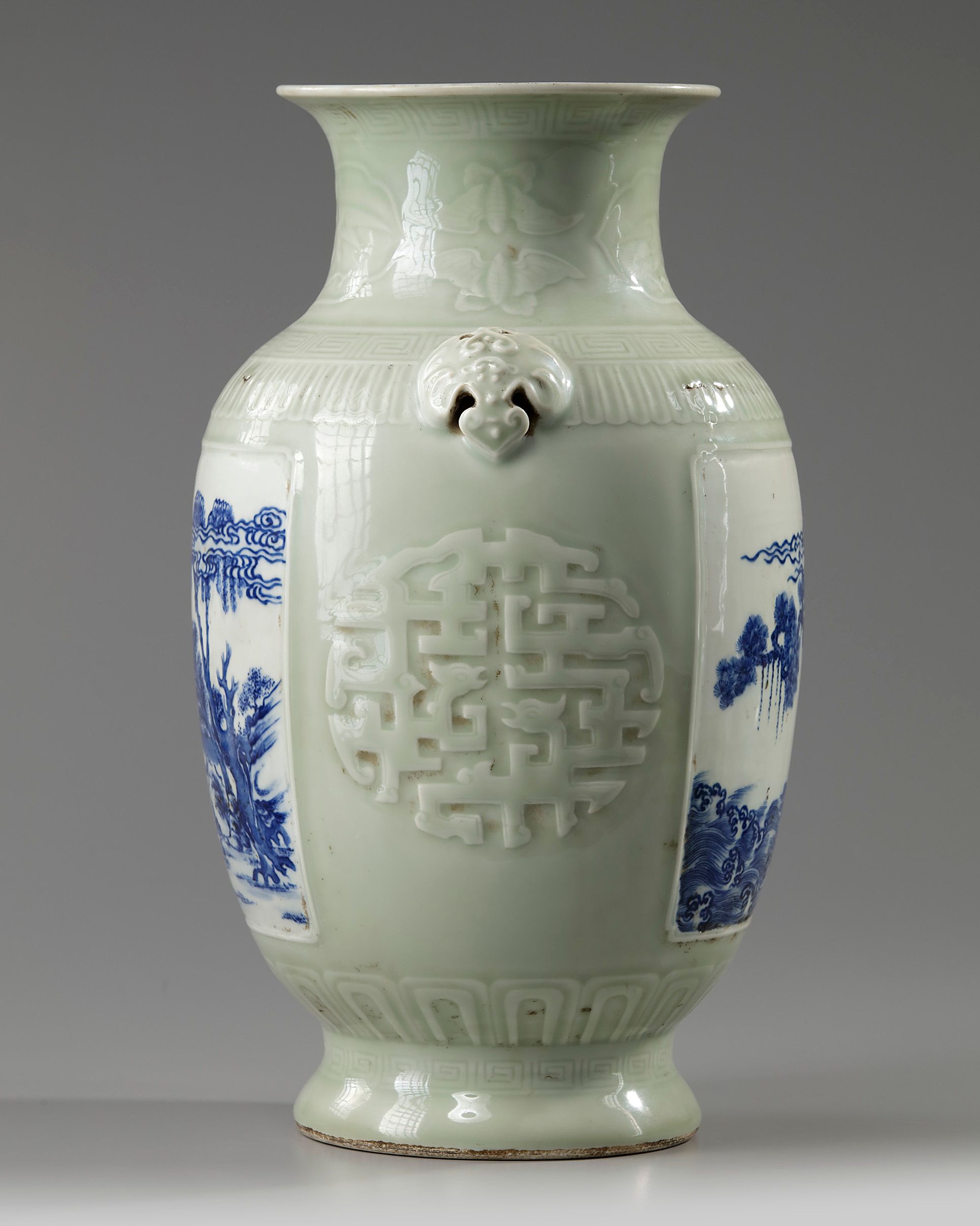 The vase is decorated with two large blue and white rectangular panels, one enclosing a river scene from the Red Cliff, and the other a water buffalo below a willow tree. The body is decorated with two moulded stylised ruyi handles, the neck is decorated with phoenix cartouches, the shoulder and foot with a lappet and key fret band, and the sides with a stylised kui dragon roundel.