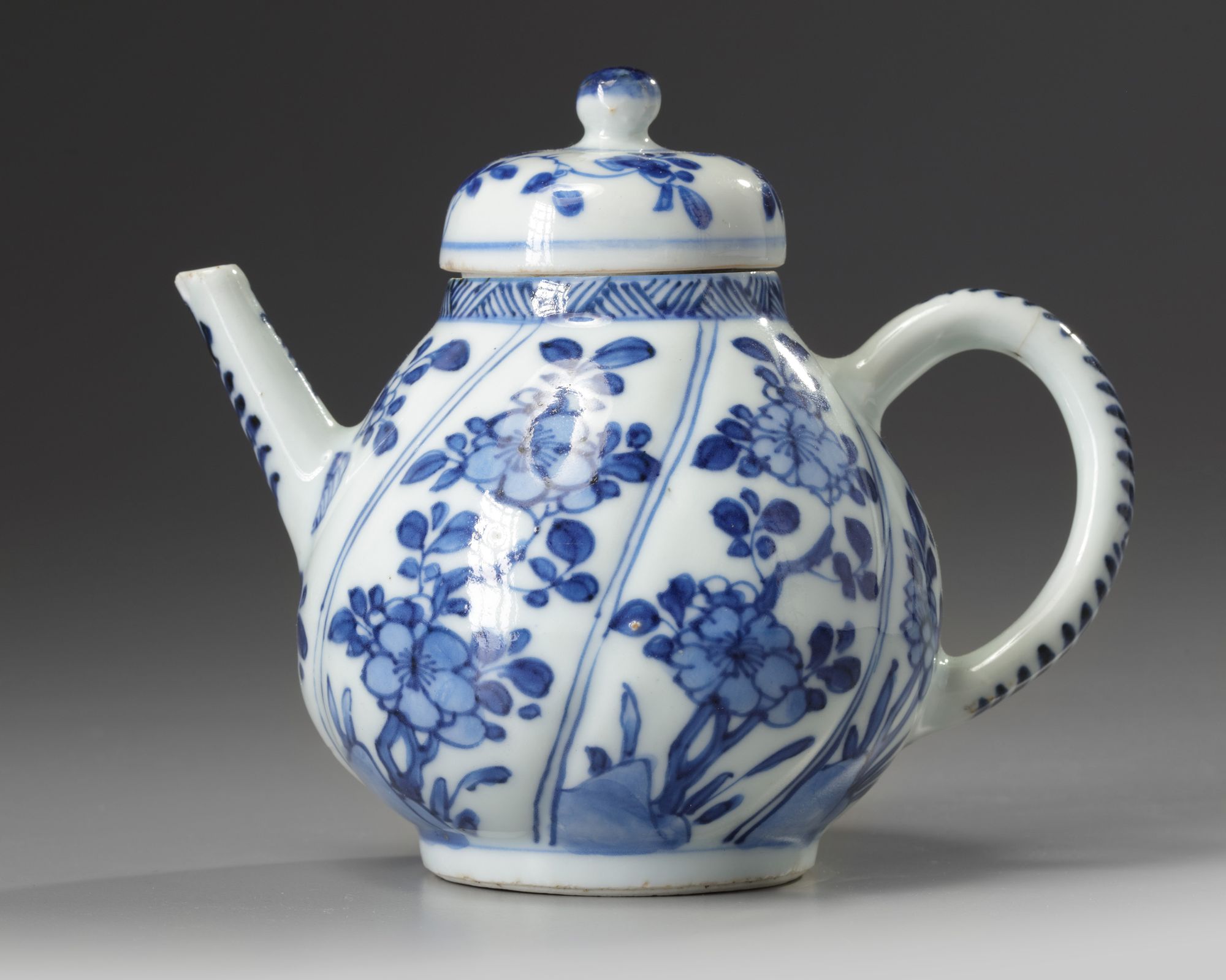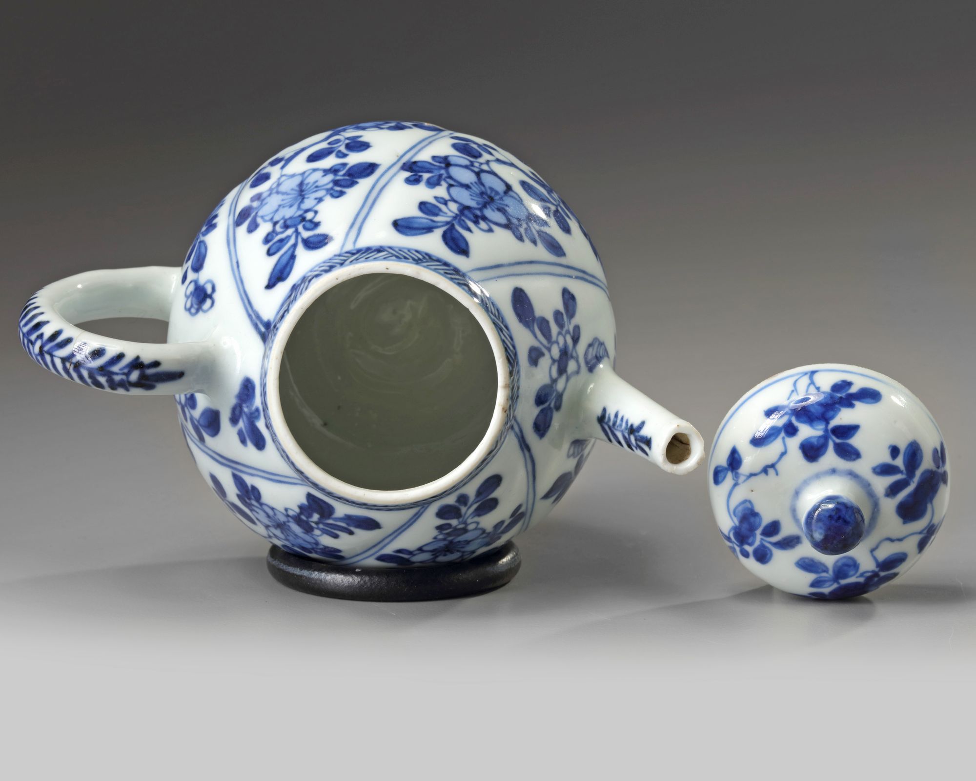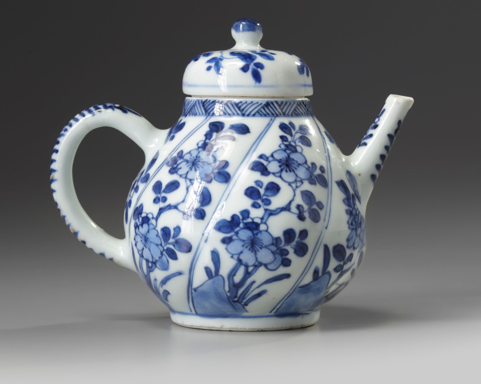 The teapot is moulded with swirling lobes each decorated with flower sprays, the cover is decorated with further flower sprays. The jar is decorated to each side with a vertical shaped panel each enclosing alternating lotus flowers and asters