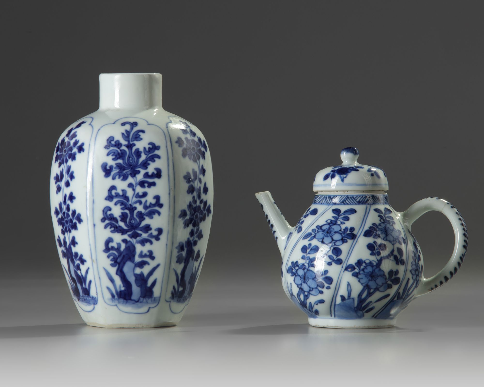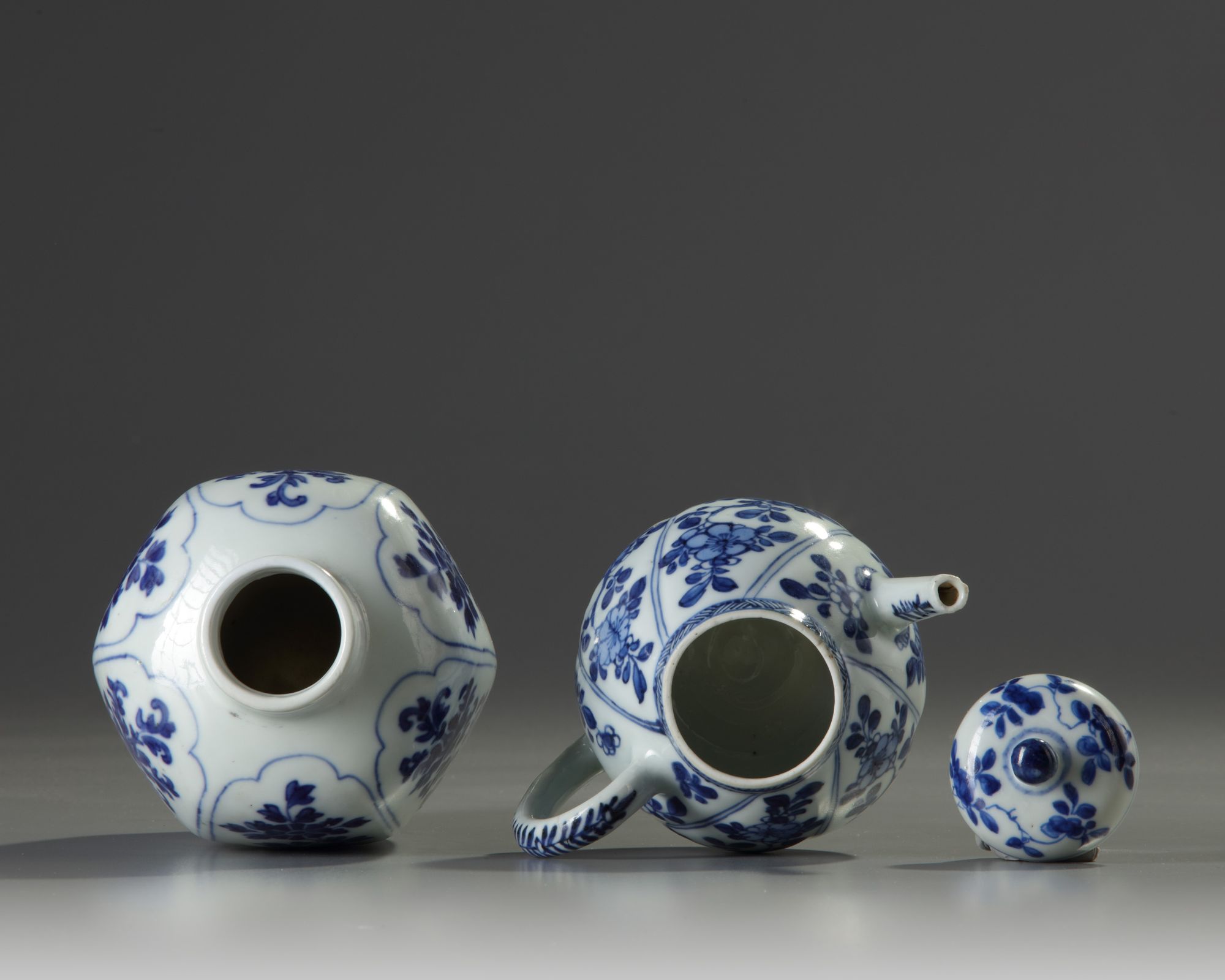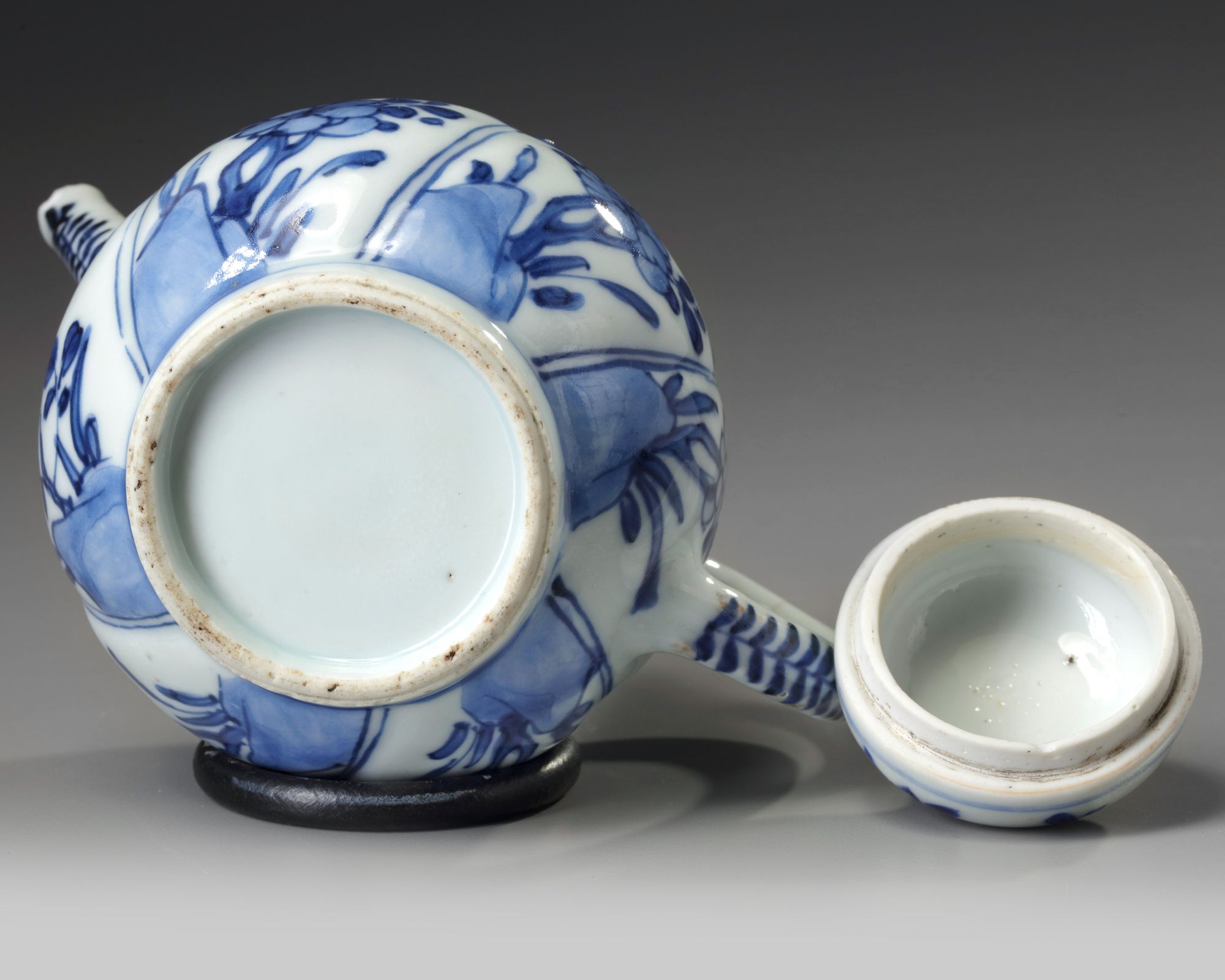 The teapot is moulded with swirling lobes each decorated with flower sprays, the cover is decorated with further flower sprays. The jar is decorated to each side with a vertical shaped panel each enclosing alternating lotus flowers and asters