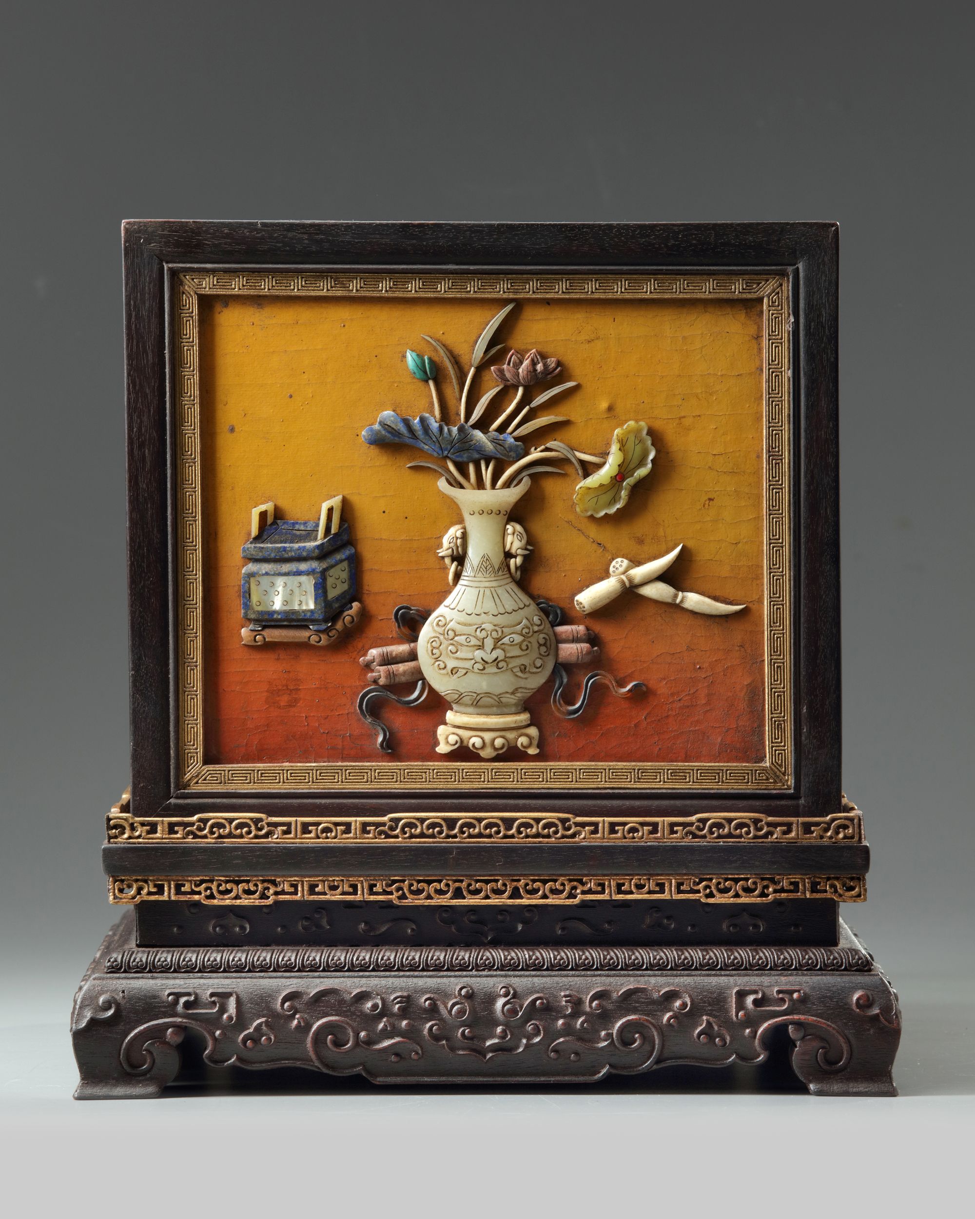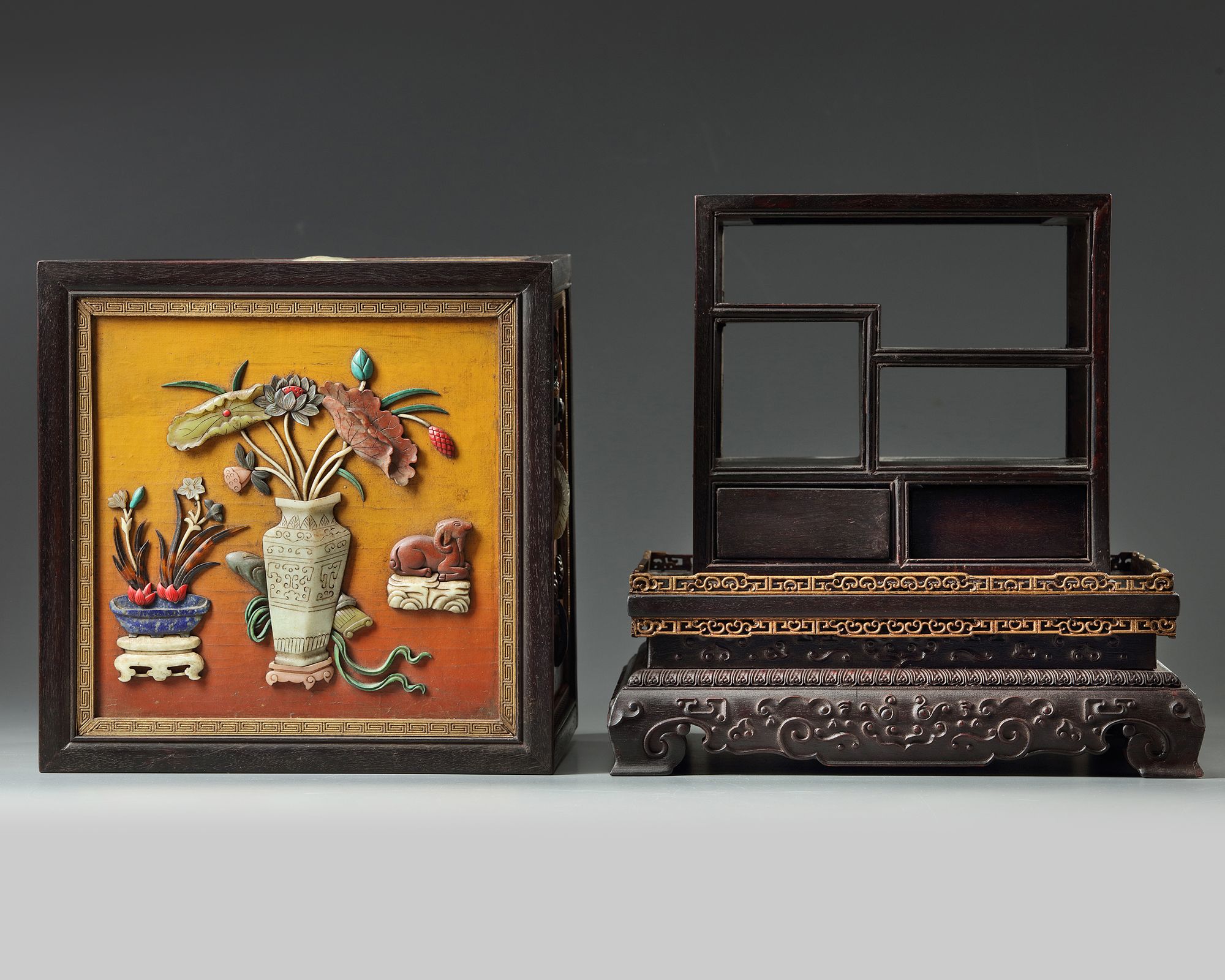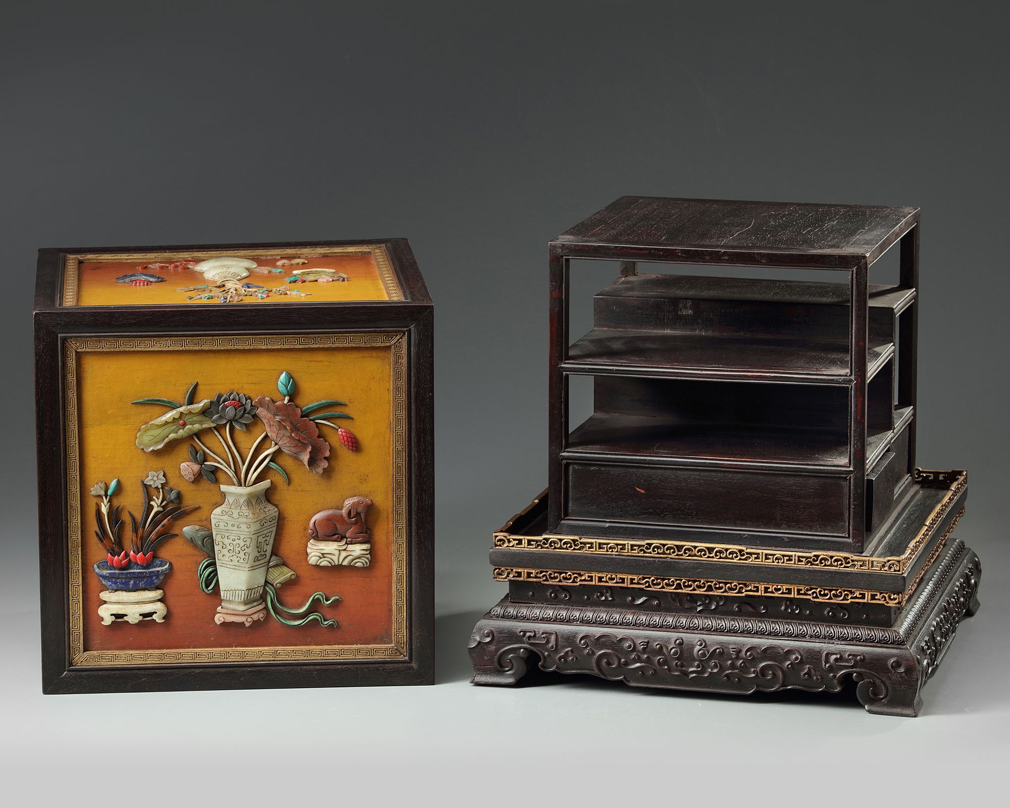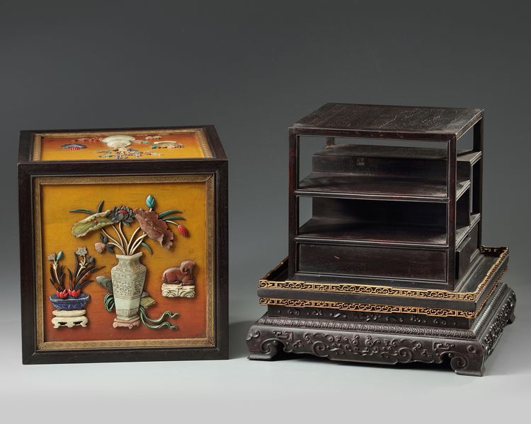 Each side of the cover is decorated with vases bearing flowers and scattered precious objects all inlaid in hardstone, jade, mother of pearl, and bone, on a ochre-lacquer ground surrounded by a carved gilt wood keyfret band. The display cabinet is crafted with different levels and two sliding drawers, standing on a platform with an openwork frieze decorated in gilt resting on a four-footed stand decorated with a lappet band and archaistic scrolls.
