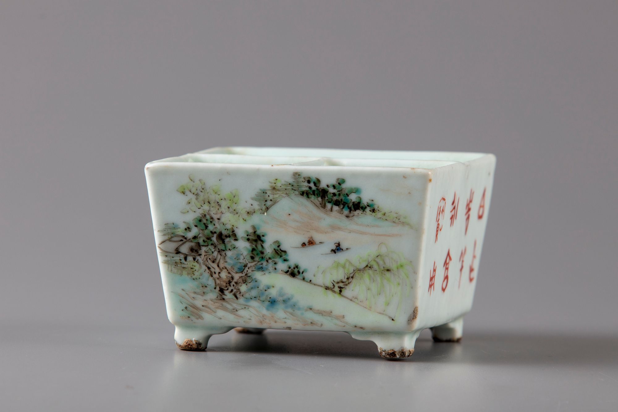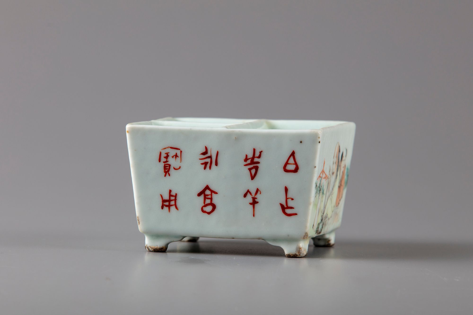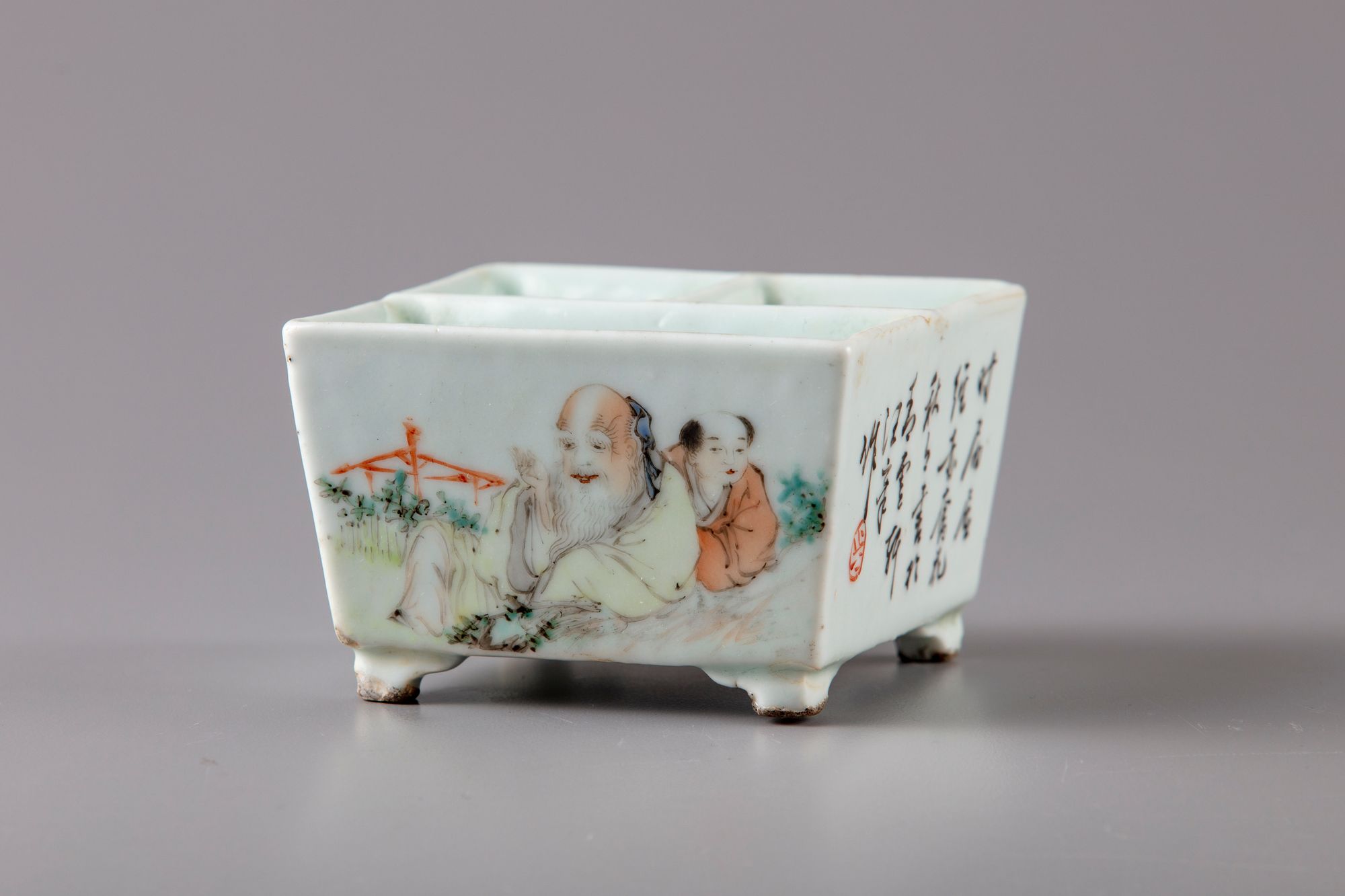 The rectangular washer is decorated to the sides with a scholar seated with a boy and a landscape,Further stylised with a Chinese calligraphy.