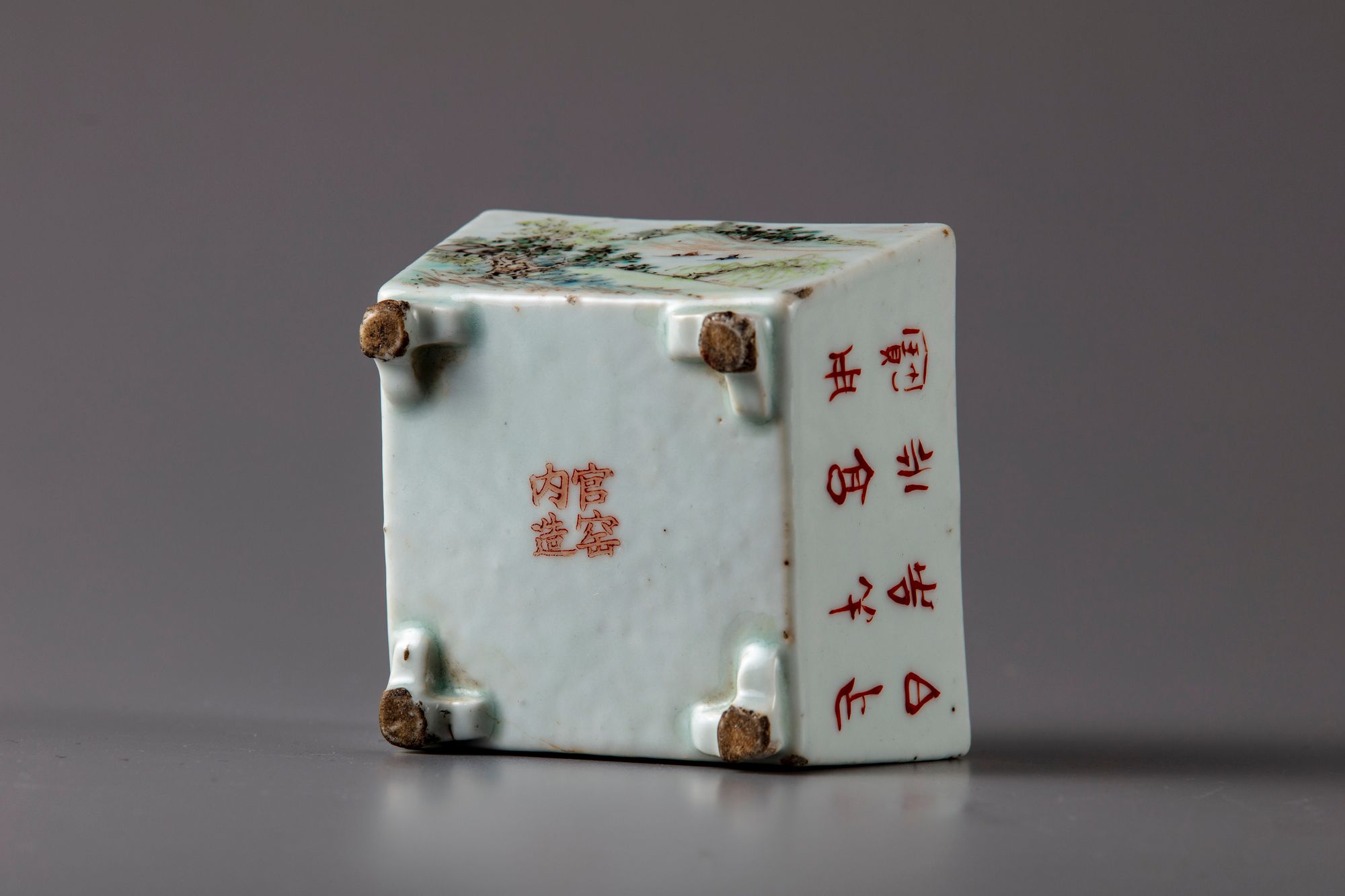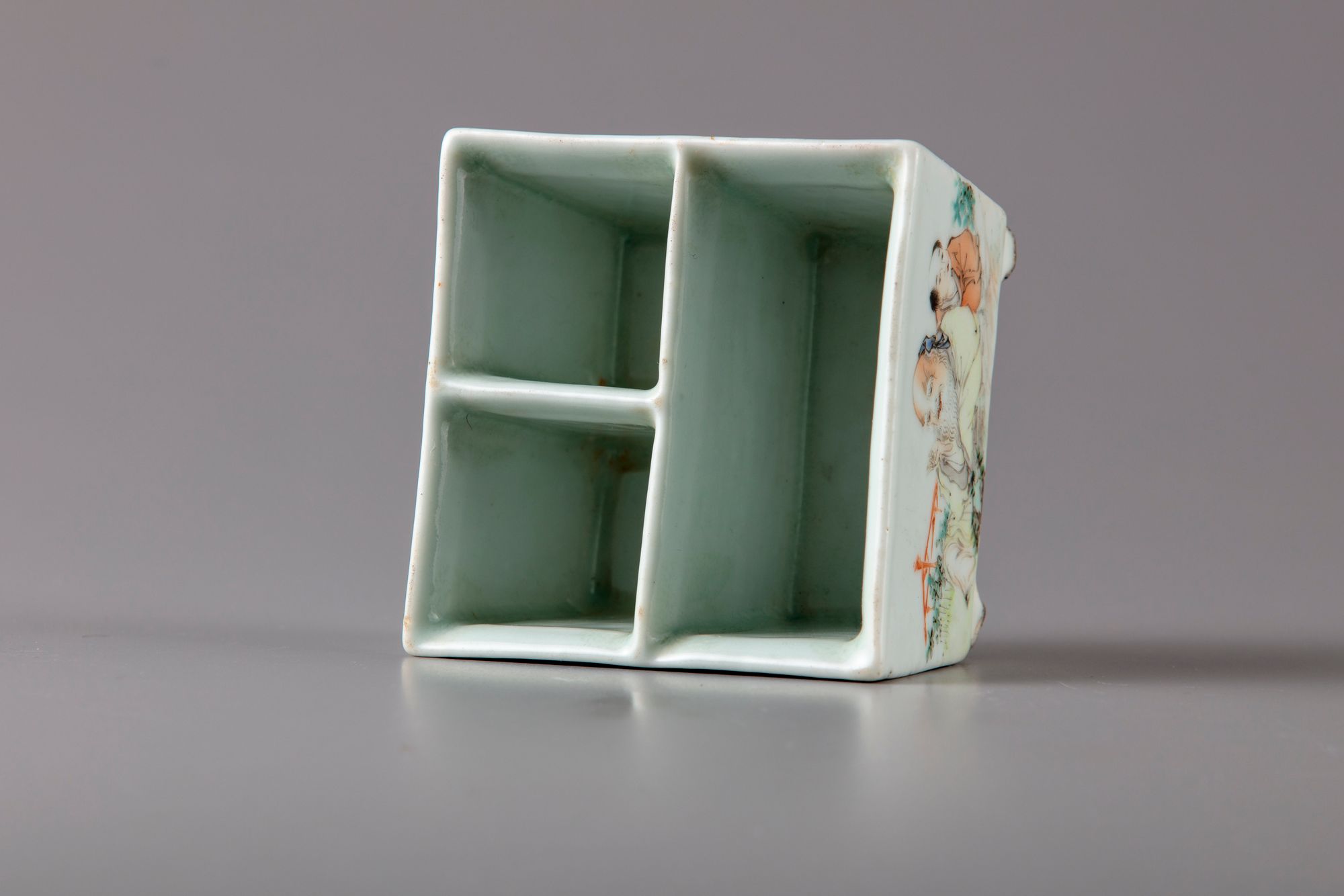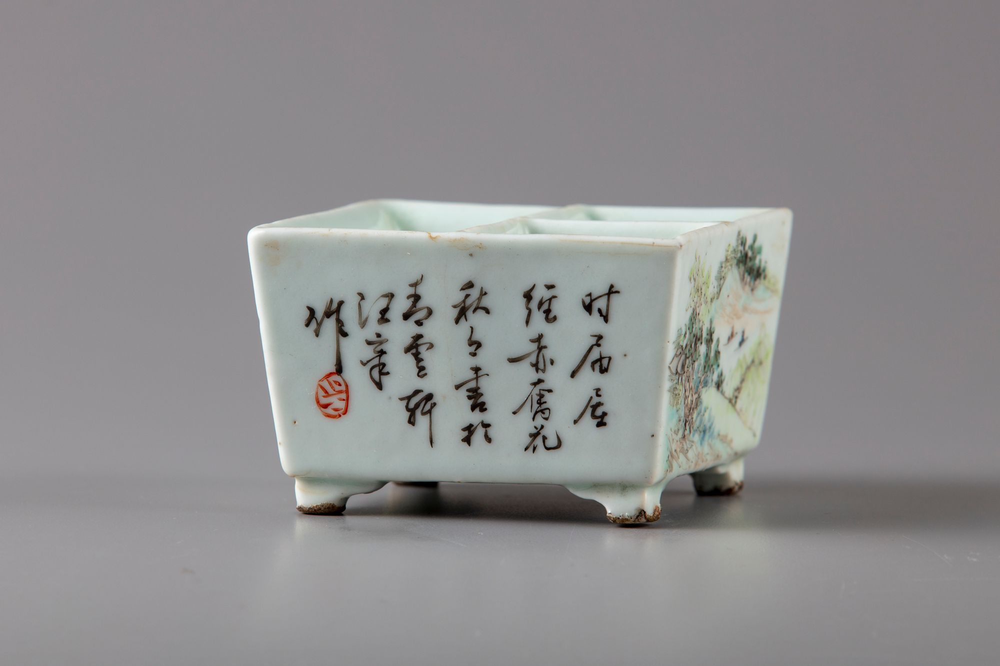 The rectangular washer is decorated to the sides with a scholar seated with a boy and a landscape,Further stylised with a Chinese calligraphy.