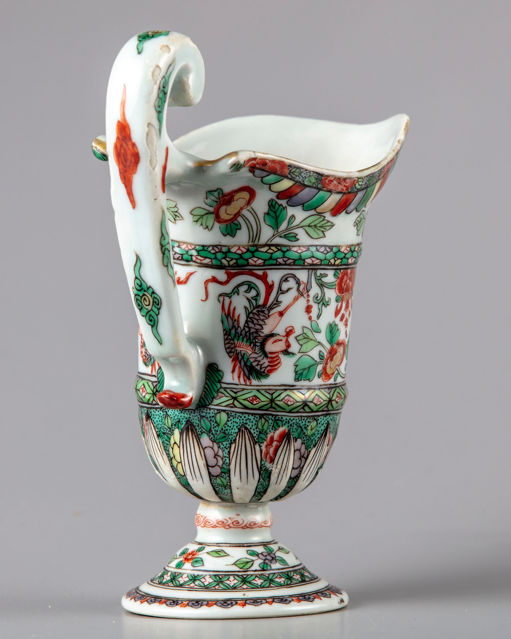 The vessel is of helmet-form with a strap handle curled over the rim. The spout is moulded with a bearded mask, the ewer is decorated and gilt with flowers and foliate patterns, lappet bands, and two phoenixes flanking the handle. The stepped lower body is decorated with flowers and bands.