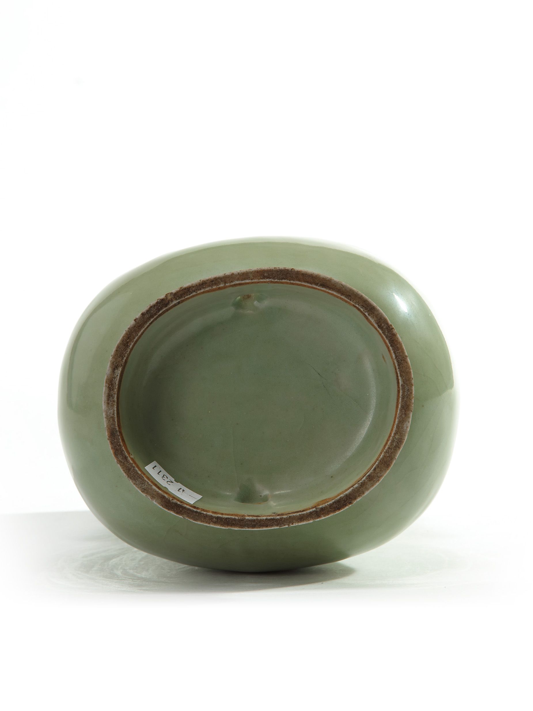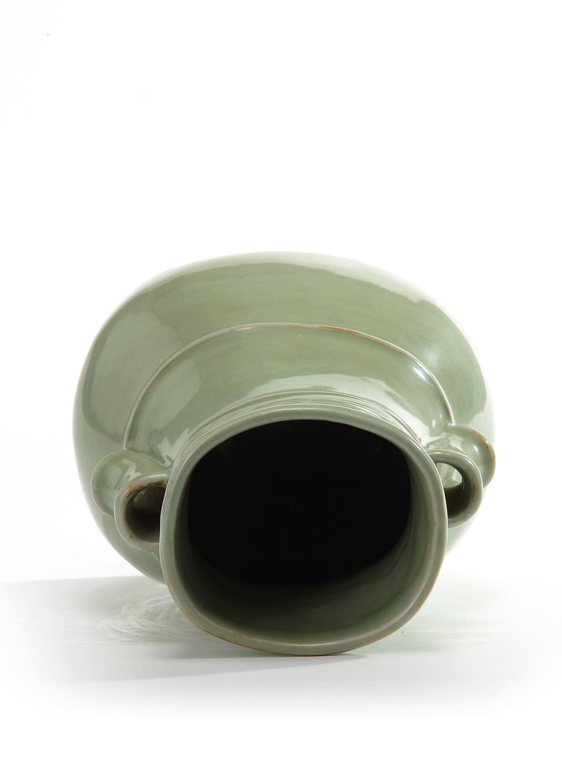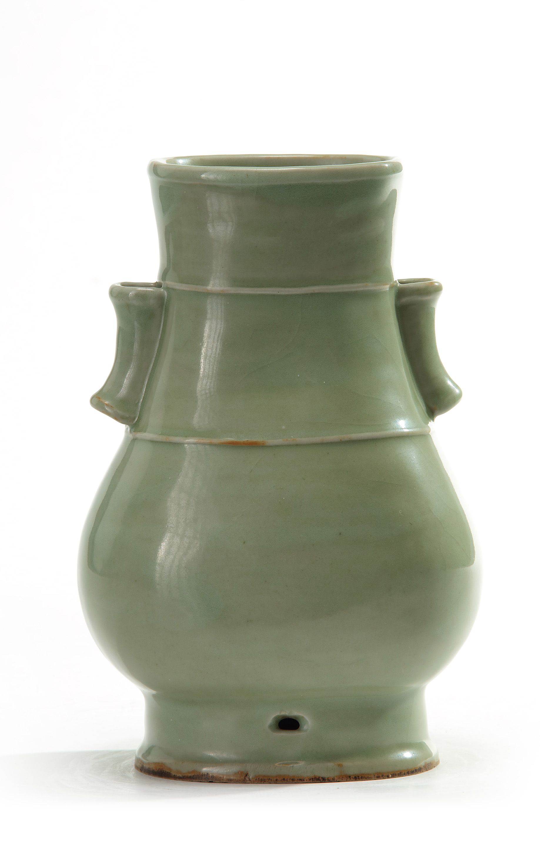 The vase is potted with a slightly everted rim and decorated with two cylindrical handles and covered overall with an olive green crackled glaze. The foot with two apertures for suspension.