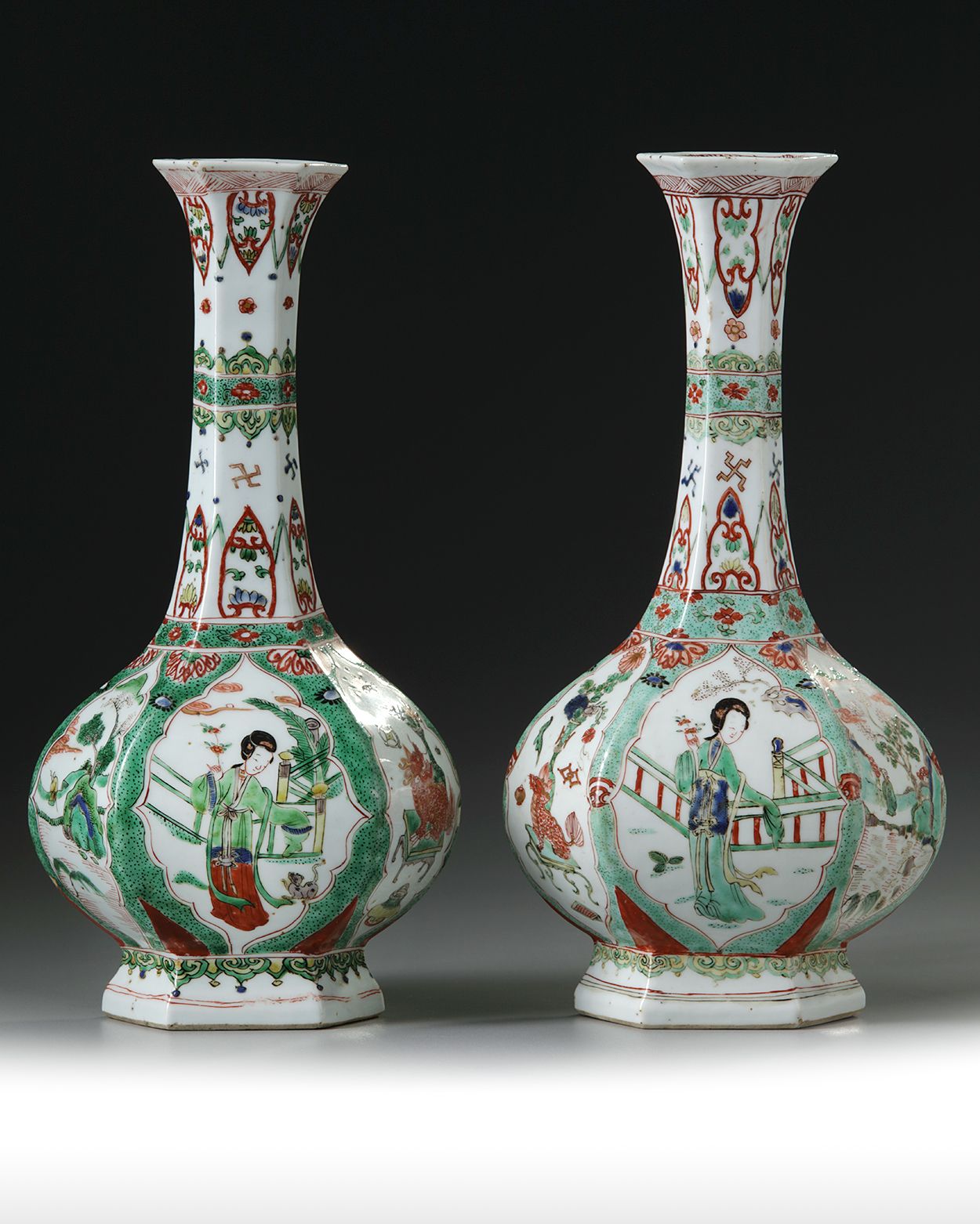 Each vase is decorated to the body with shaped panels enclosing alternating elegant ladies, precious objects, and landscapes, all below a lappet band at the shoulder and rim, and a ruyi-head band at the neck and foot.