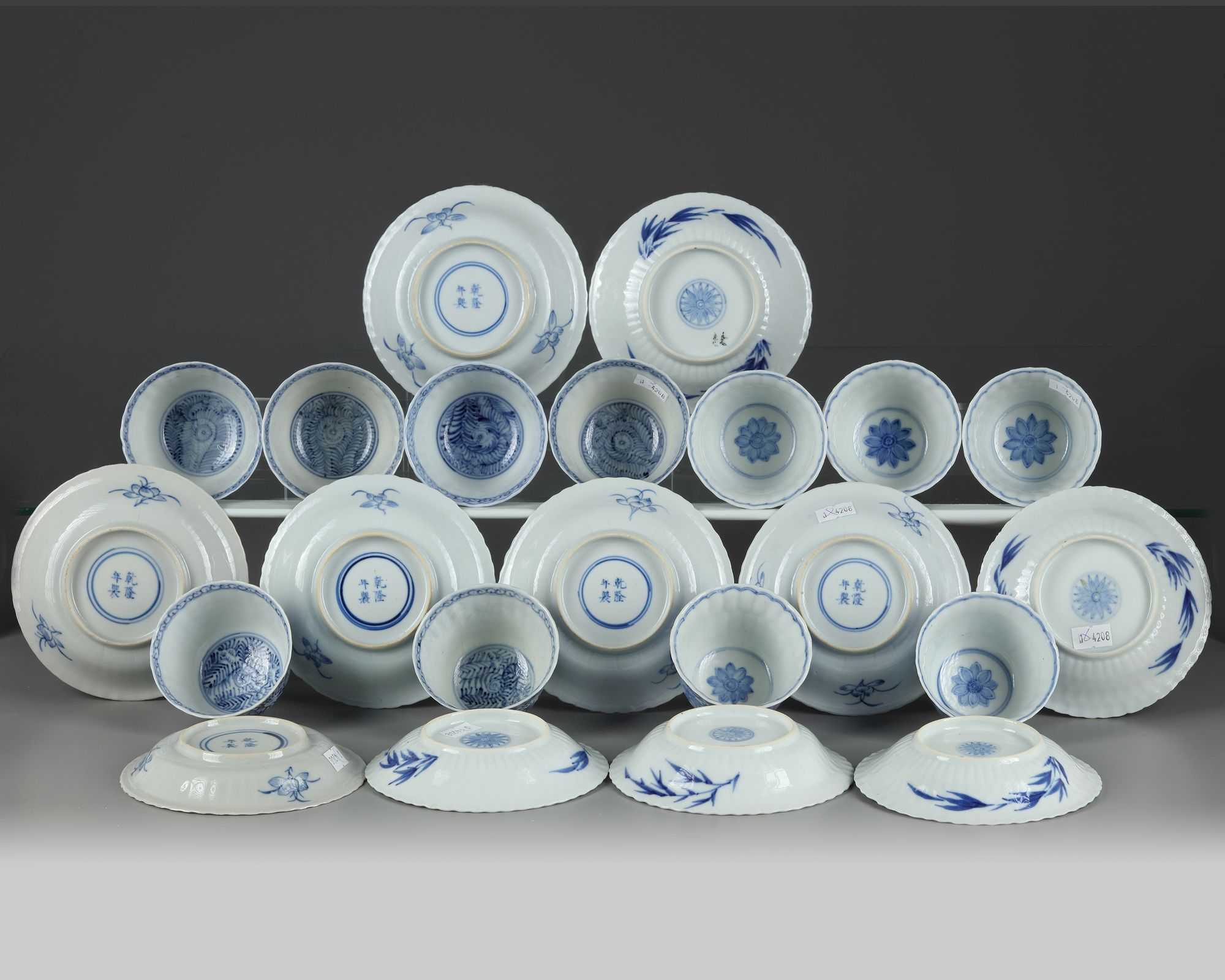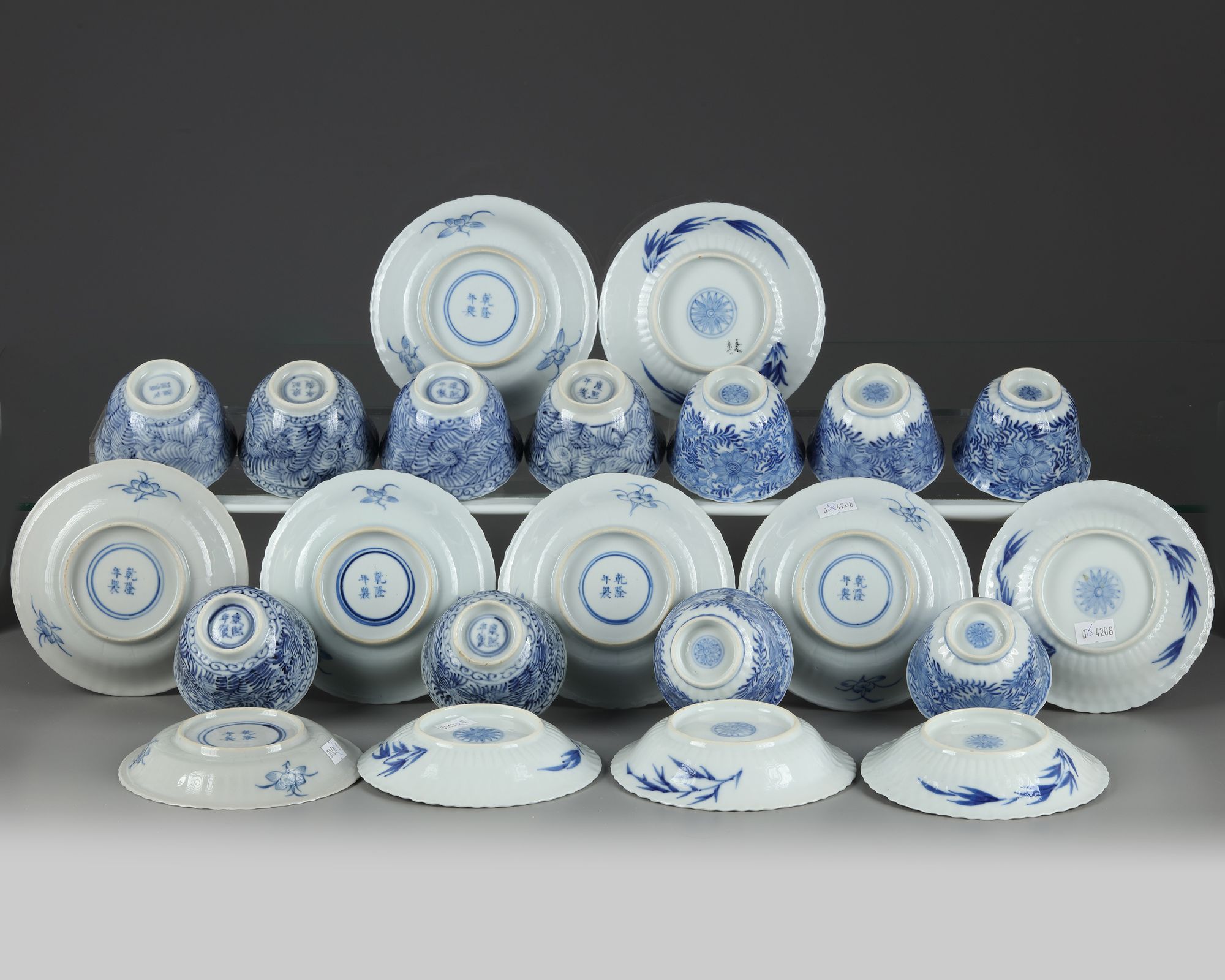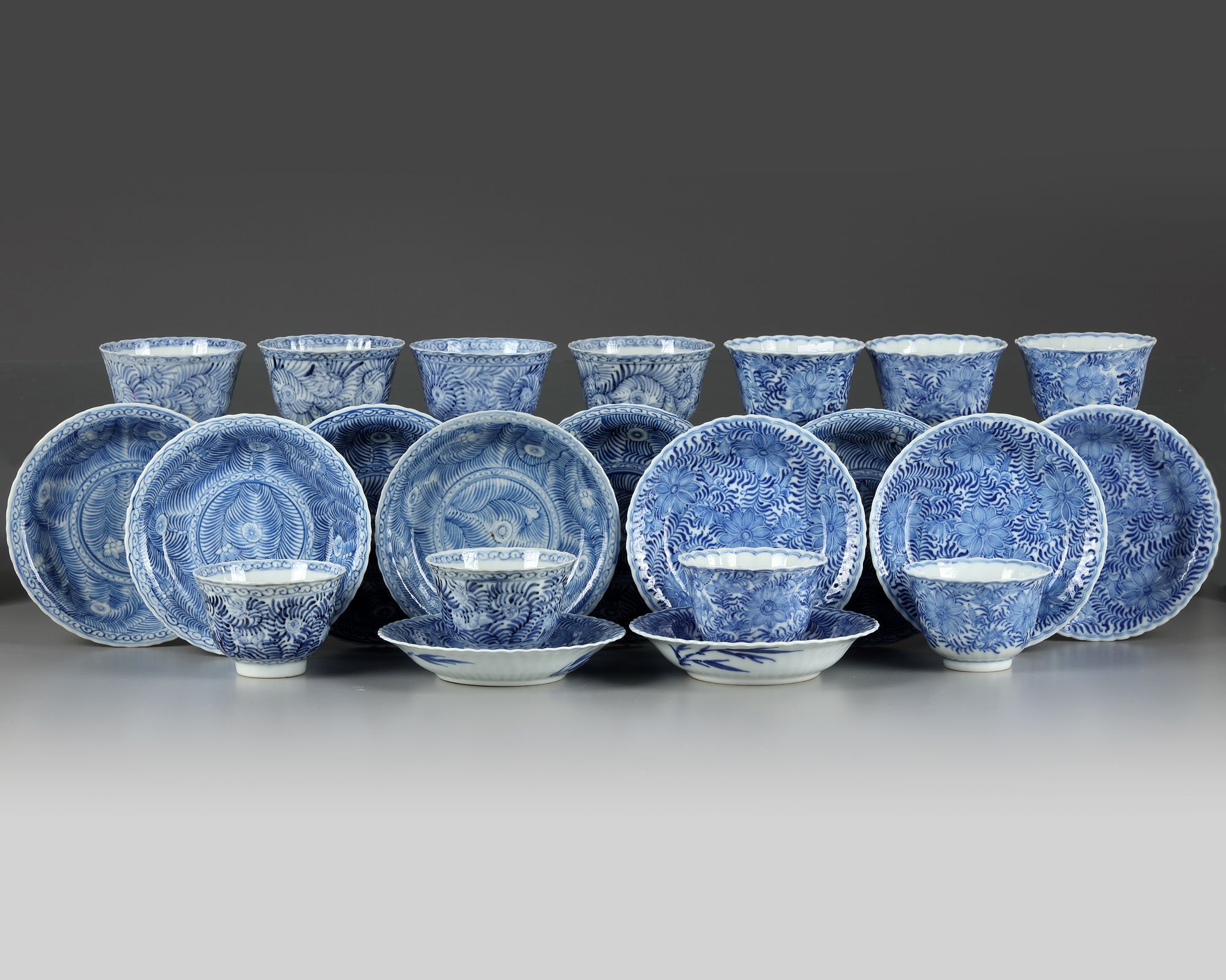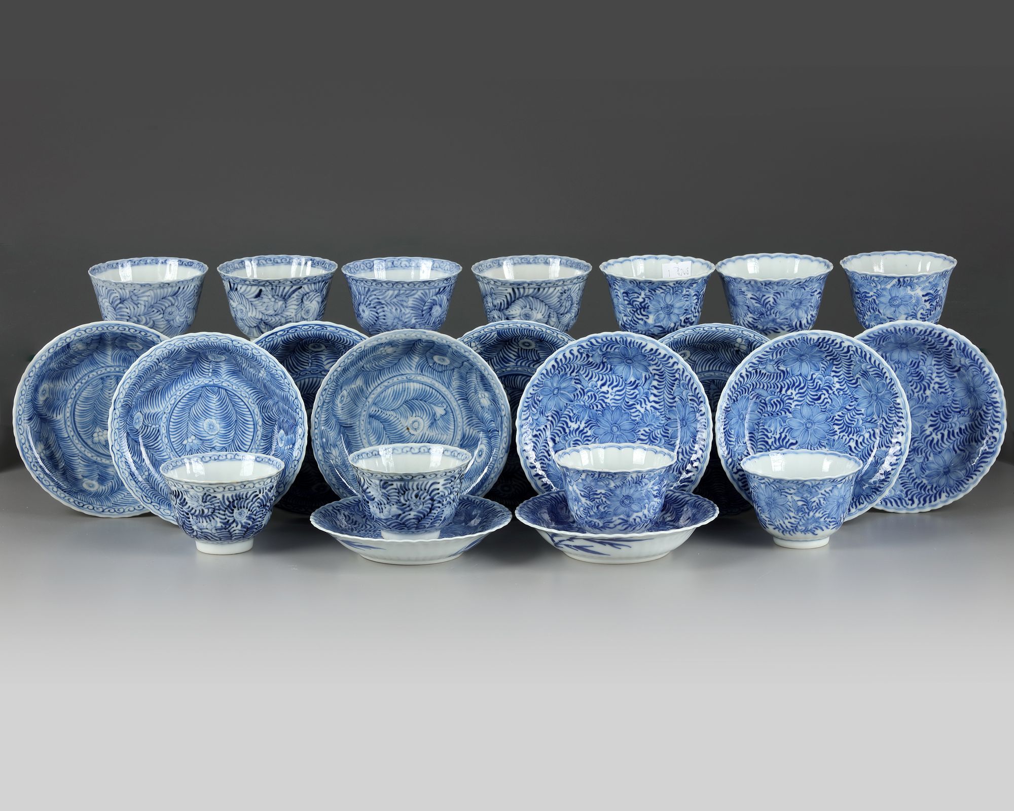 Comprising five pairs of cups and saucers and six cups and six saucers, each similarly decorated with flower heads and dense leafy scrolls. One of the sets is marked with a flower head to the base, the other cups are marked with an apocryphal Kangxi mark and the other saucers are marked with an apocryphal Qianlong mark.