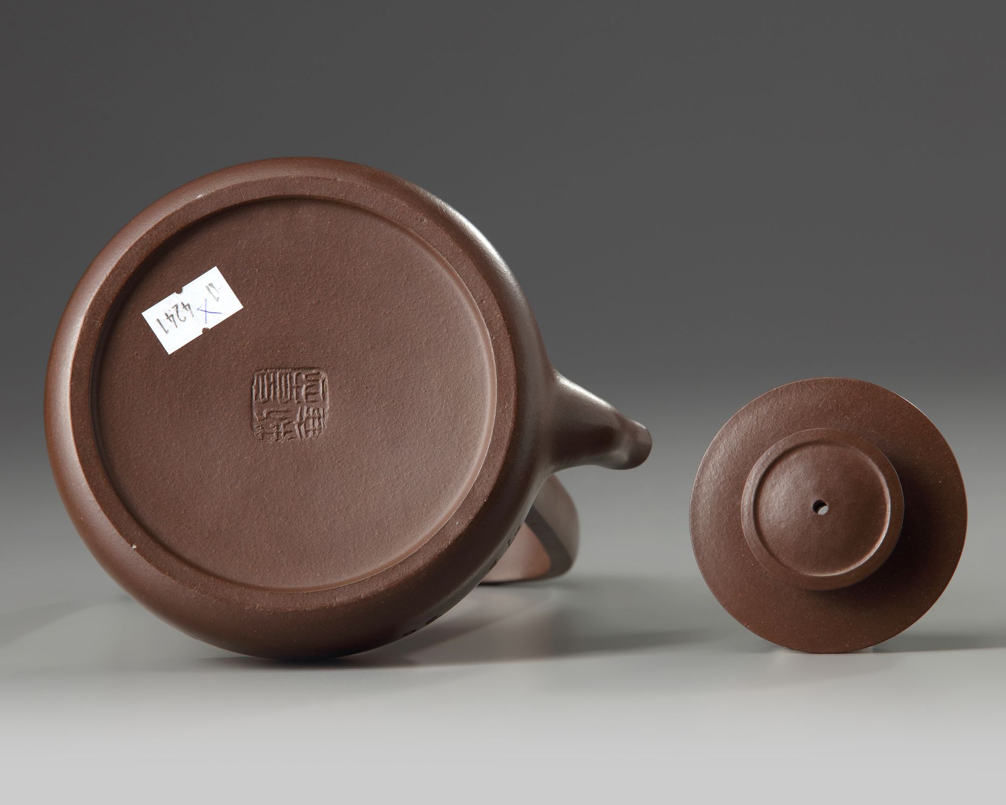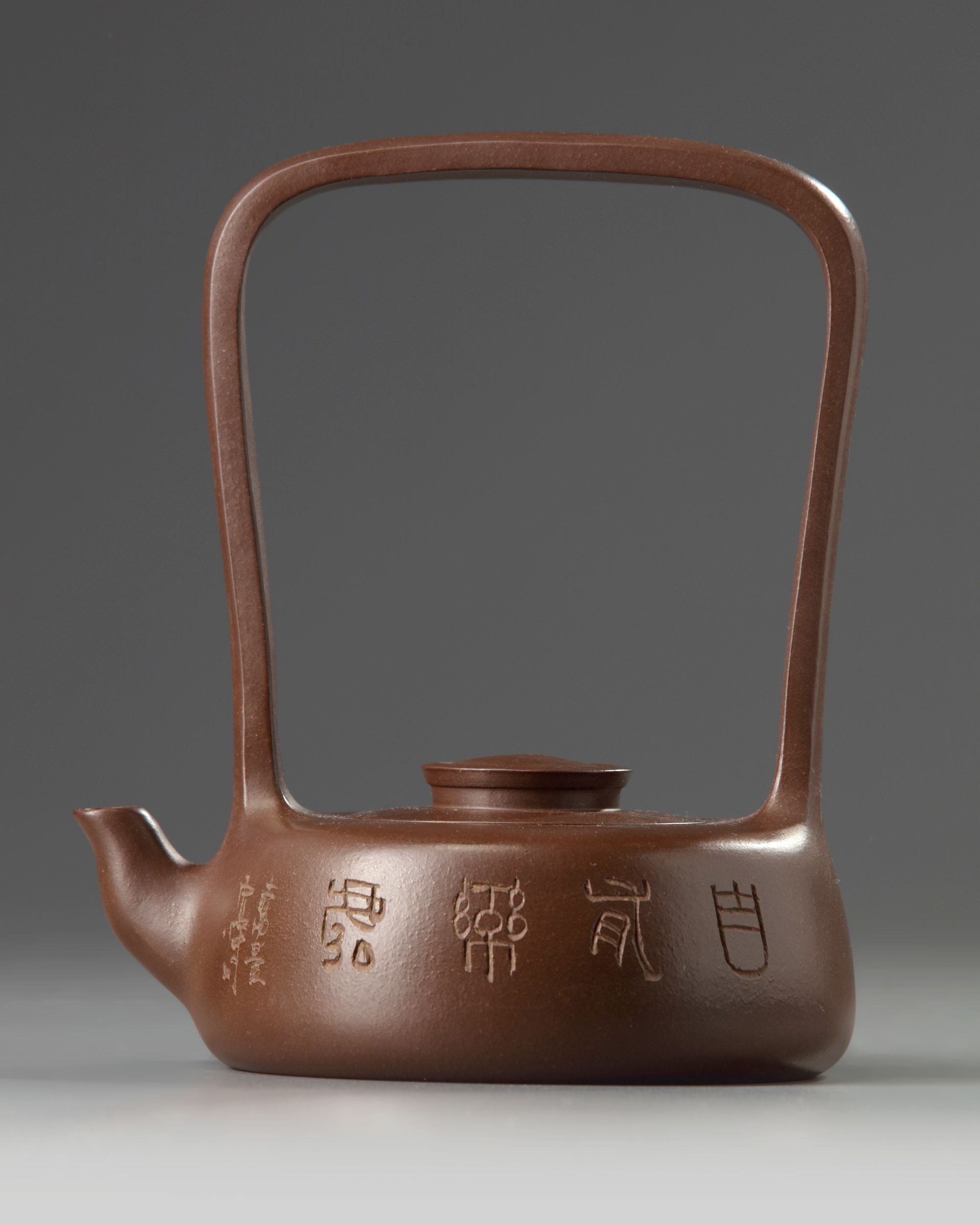 The squat teapot is fashioned with a high upright handle, one side is carved with a bamboo, the other side is inscribed 'zi you le chu'. The base and underside of the cover is stamped with a the mark of Gu Jingzhou.