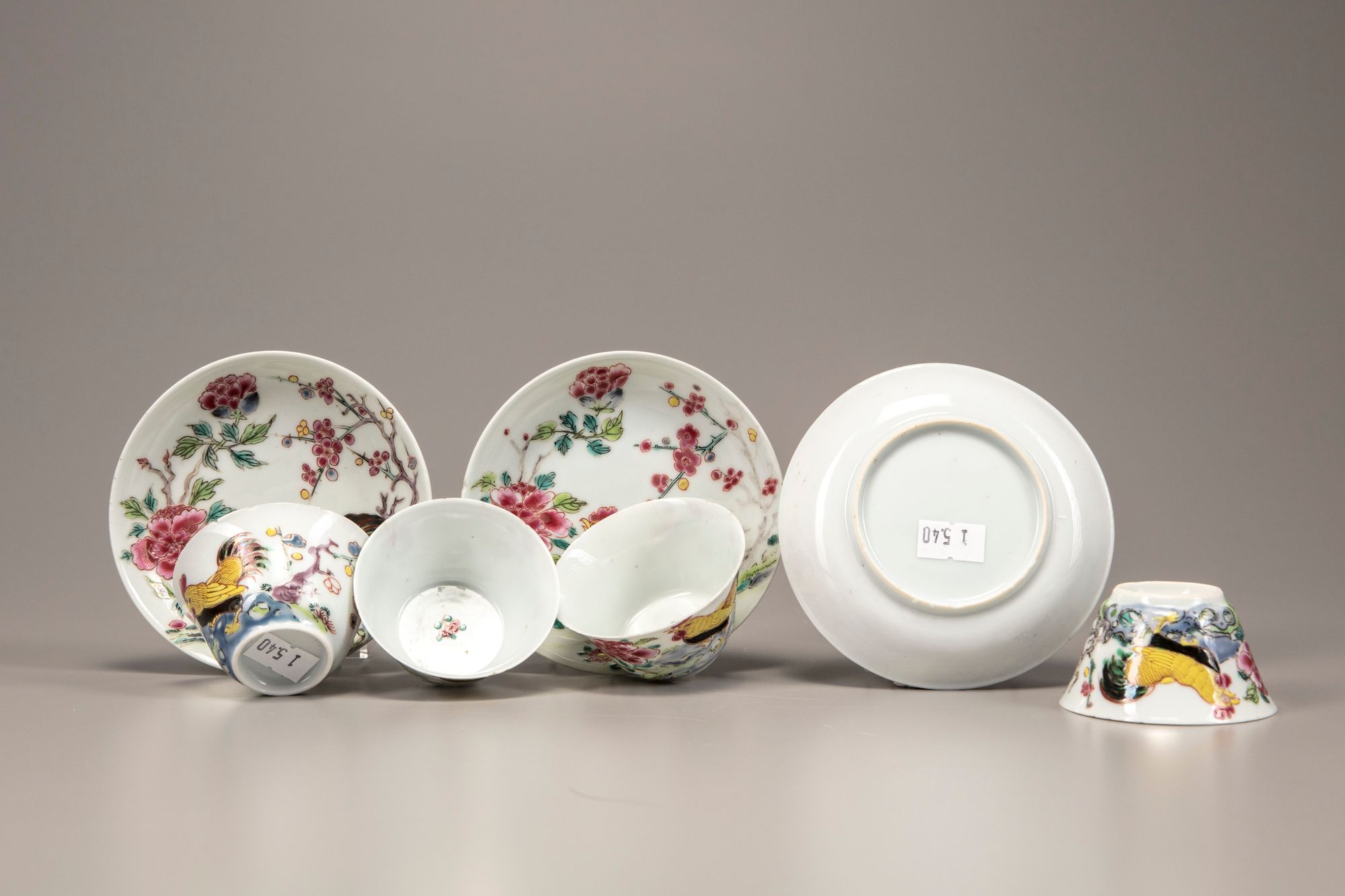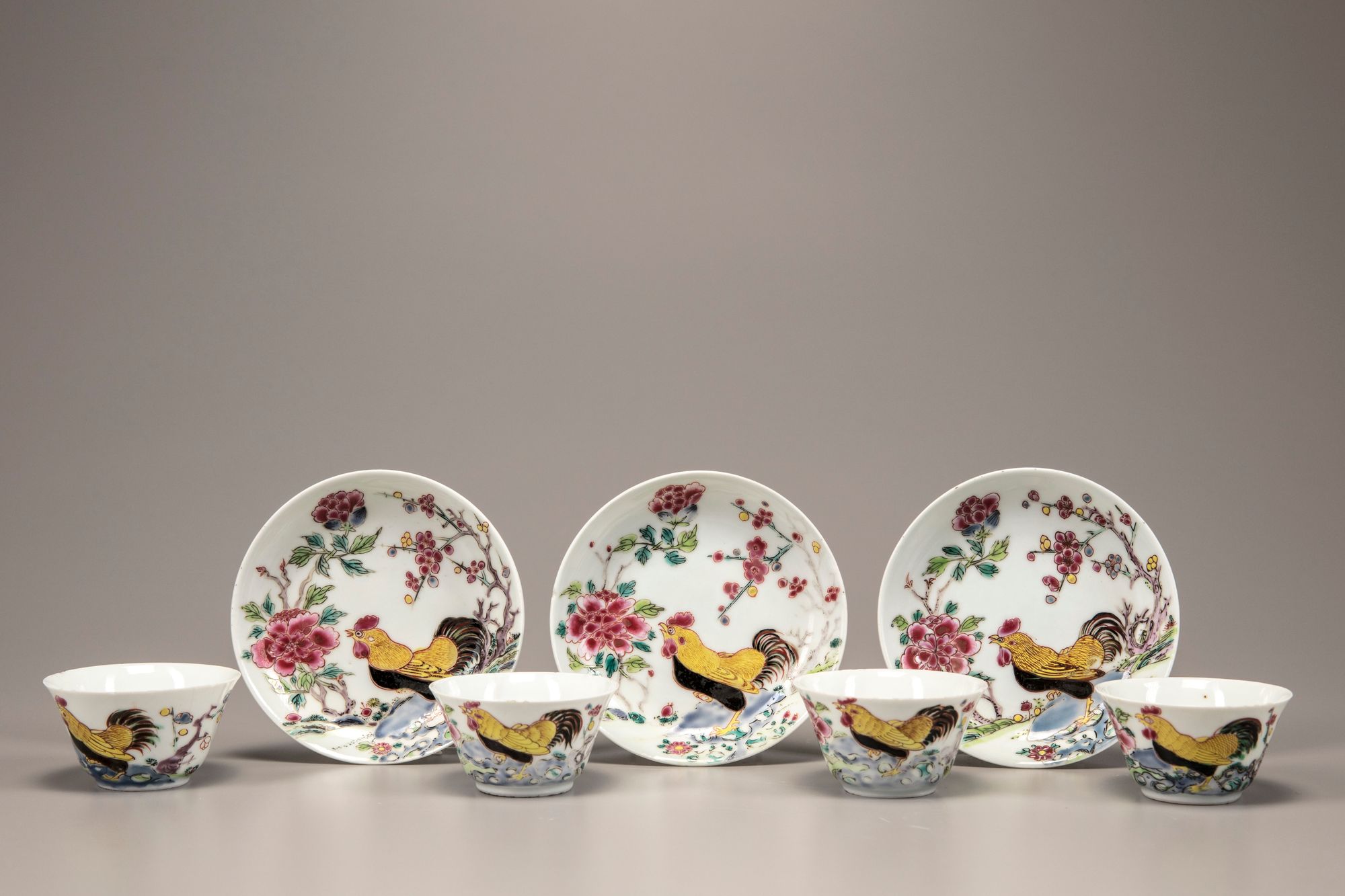 The cups and saucers are boldly decorated with a cockerel amongst peony and prunus amongst rocks.